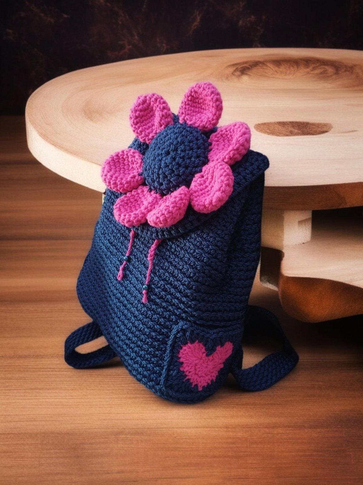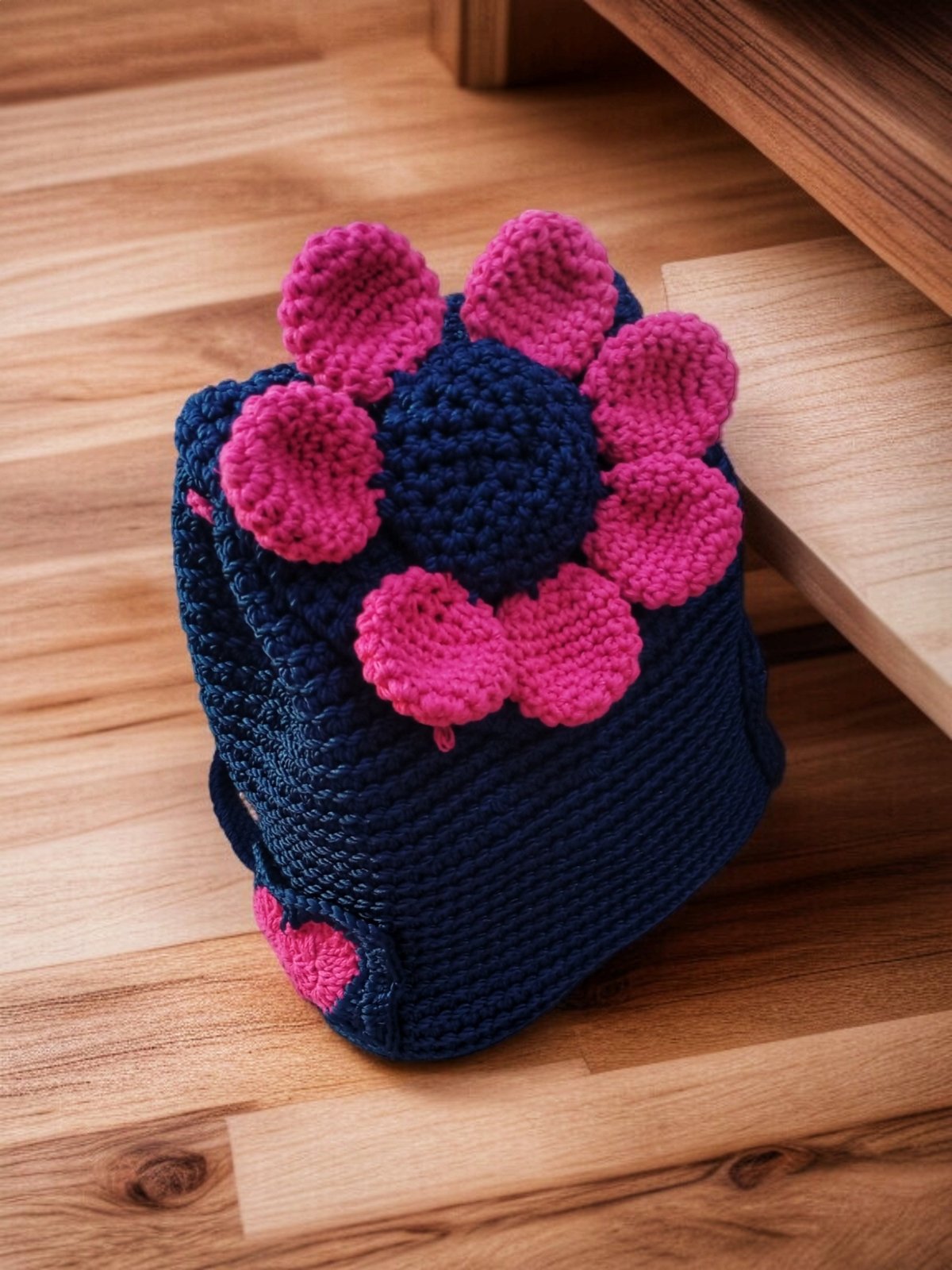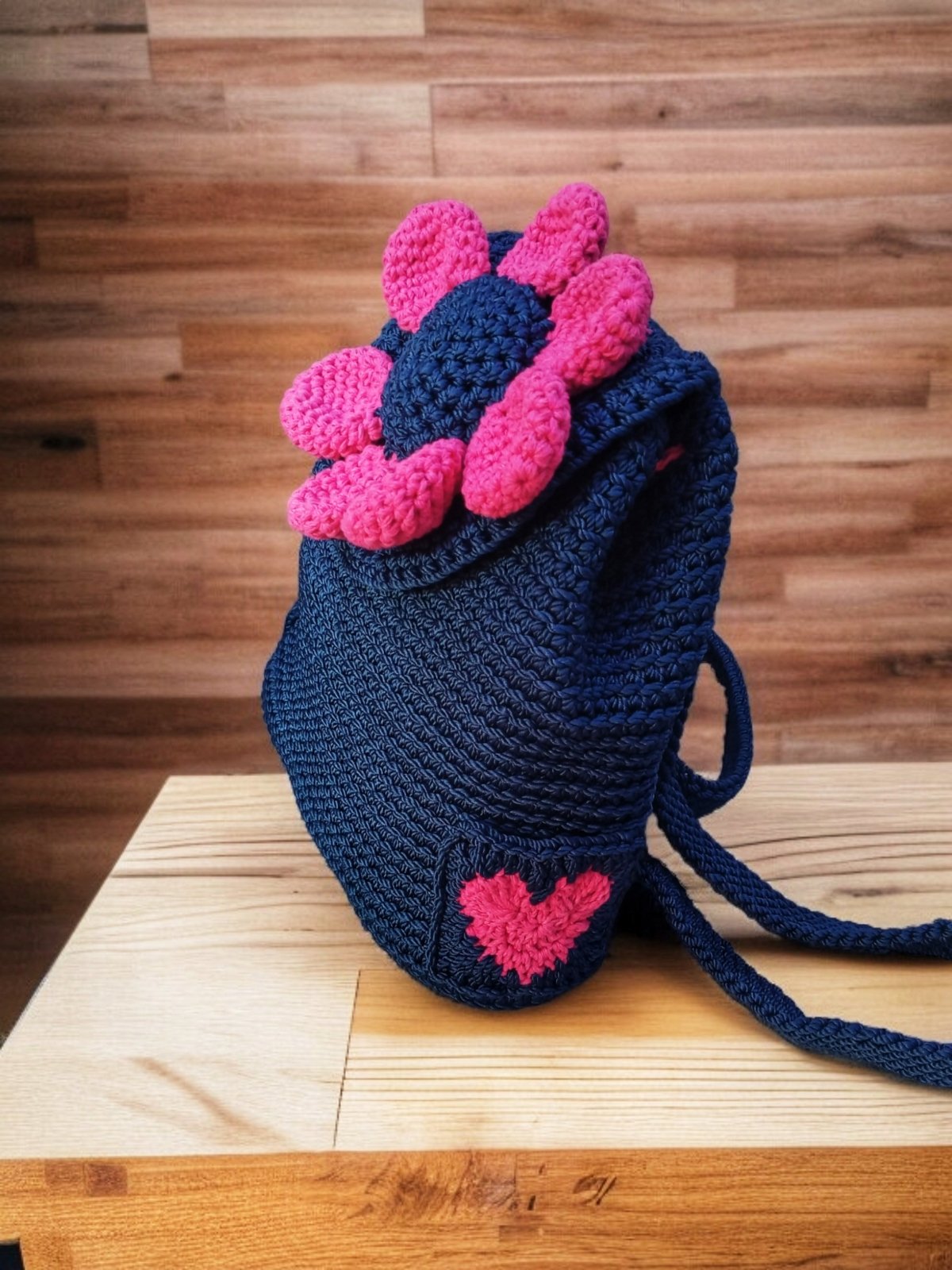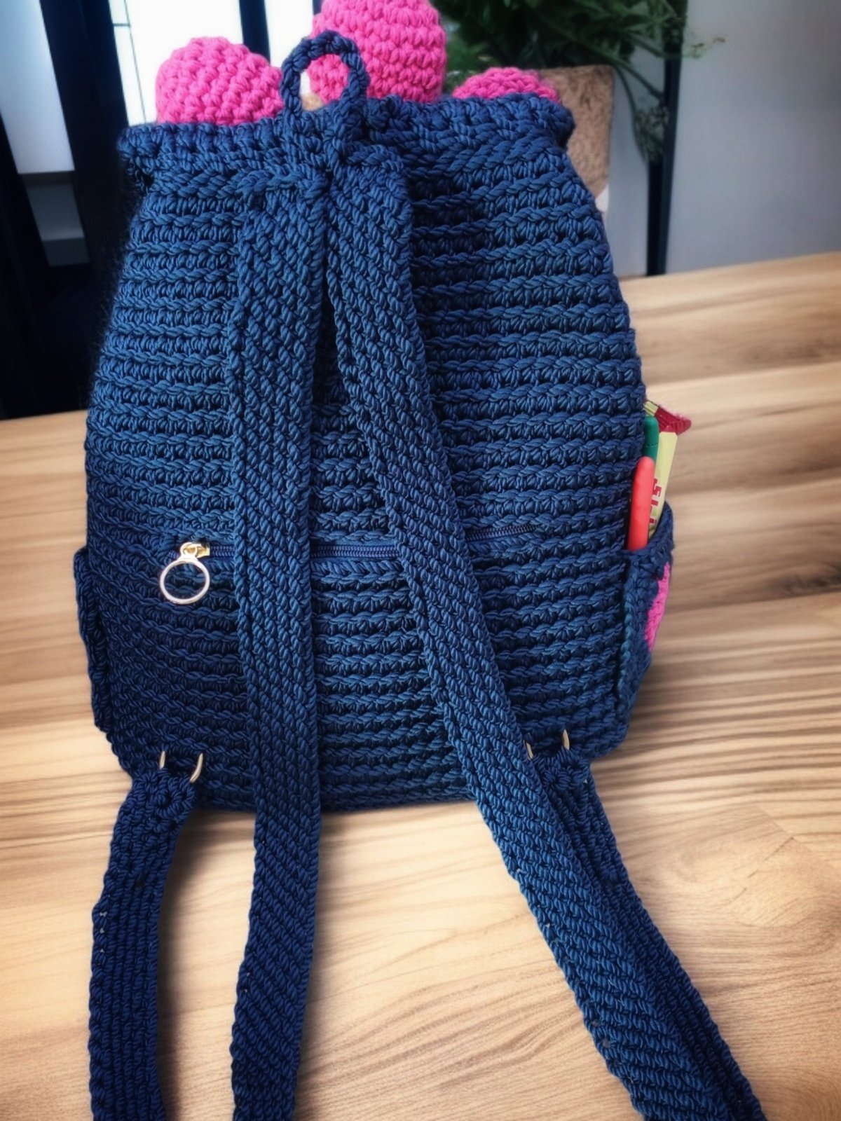 شنطه باك كروشيه صنعت يدويا من خيوط المكرميه المصري ولها جيب من الخلف ولها بطانه داخليه مقاس القاعده ٣٠في طول ٣٠