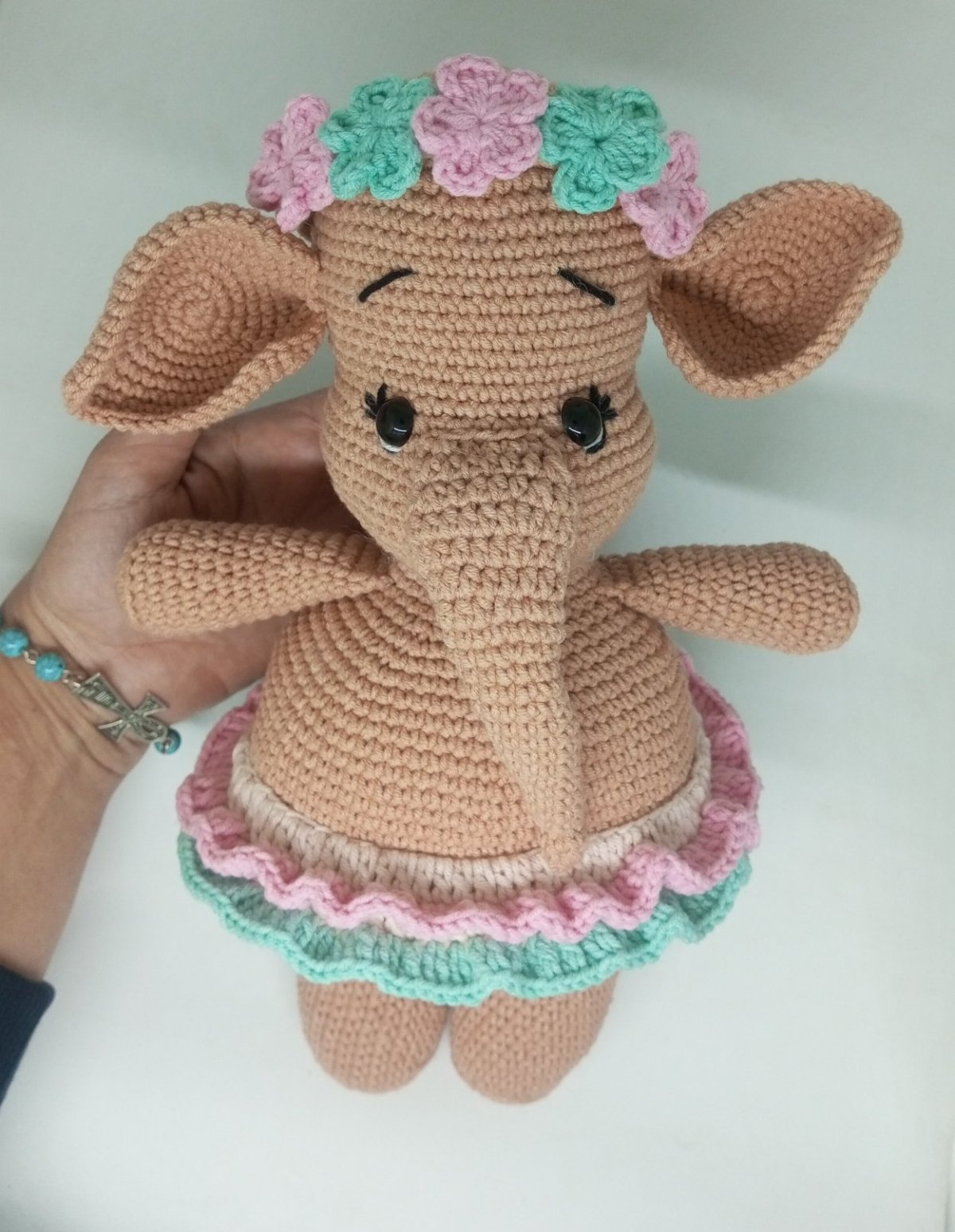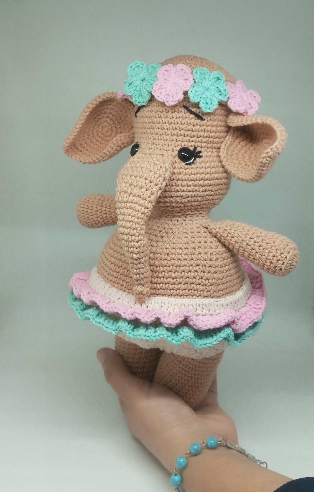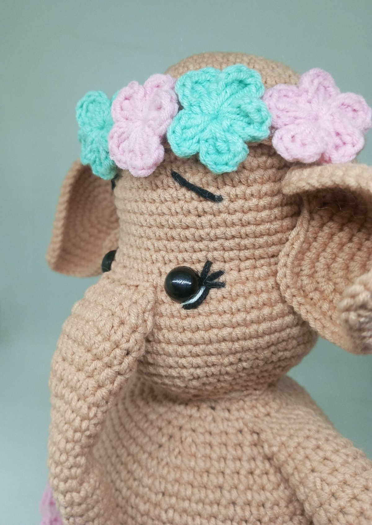 فلفوله فيل ايموجرامى مشغول بخيط قطن تركى و محشو فايبر والعيون safety eyes مع توكه ورد طوله 30 سم تقريبا