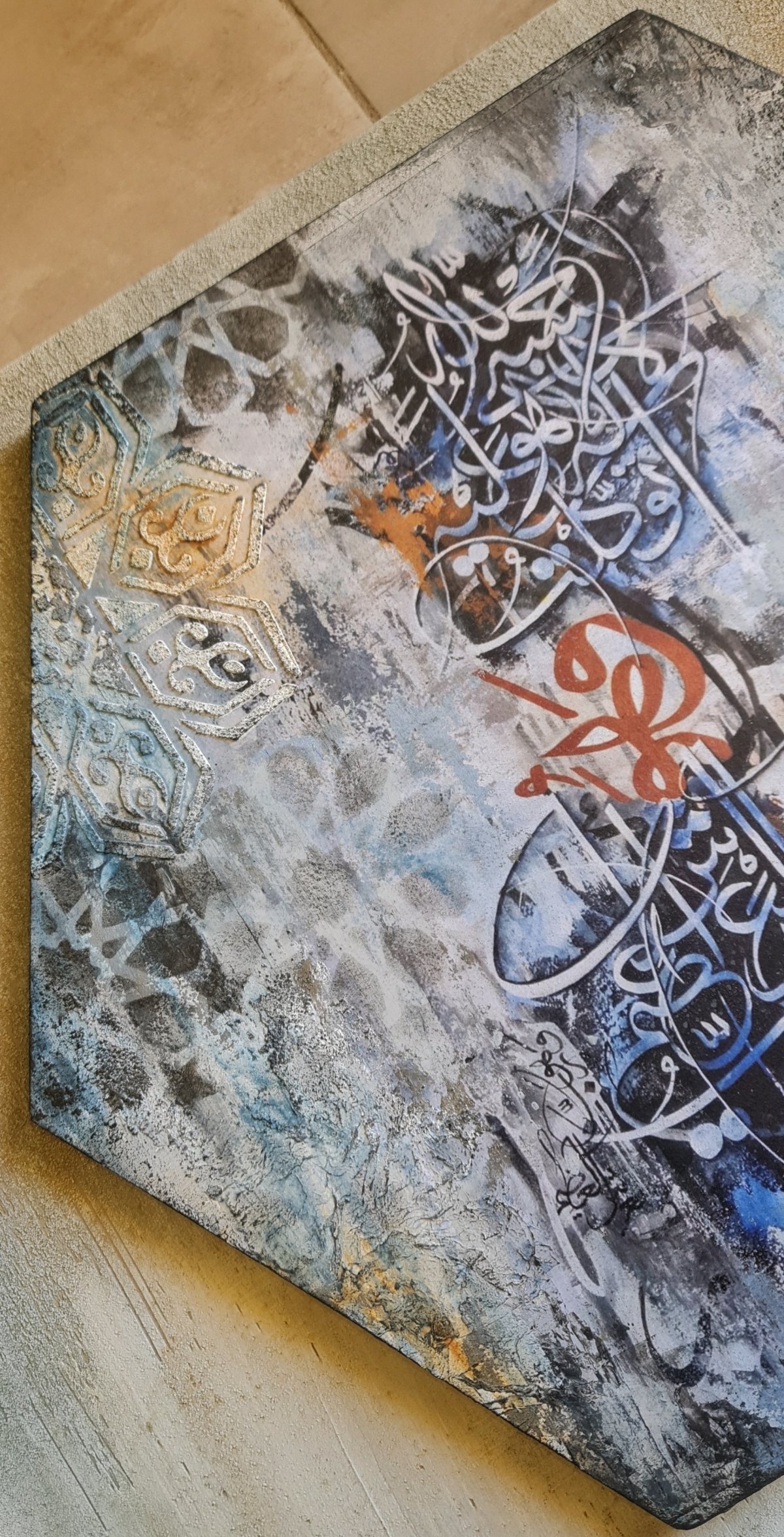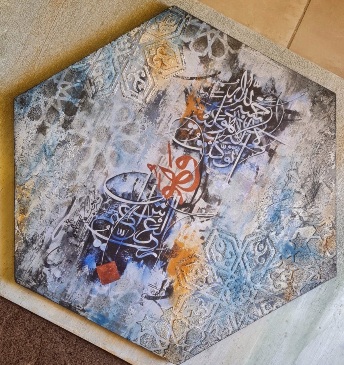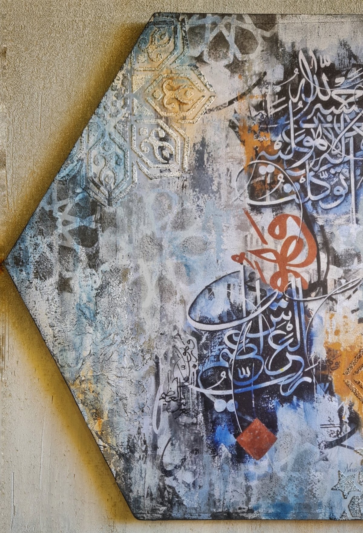 تابلو كانفس باستايل عربي مقاس ٤٤في٥٠سم يحمل عبارة..حسبي الله لا اله الا هو عليه توكلت وهو رب العرش العظيم متاح فوري قطعه واحده فقط غير مكررة