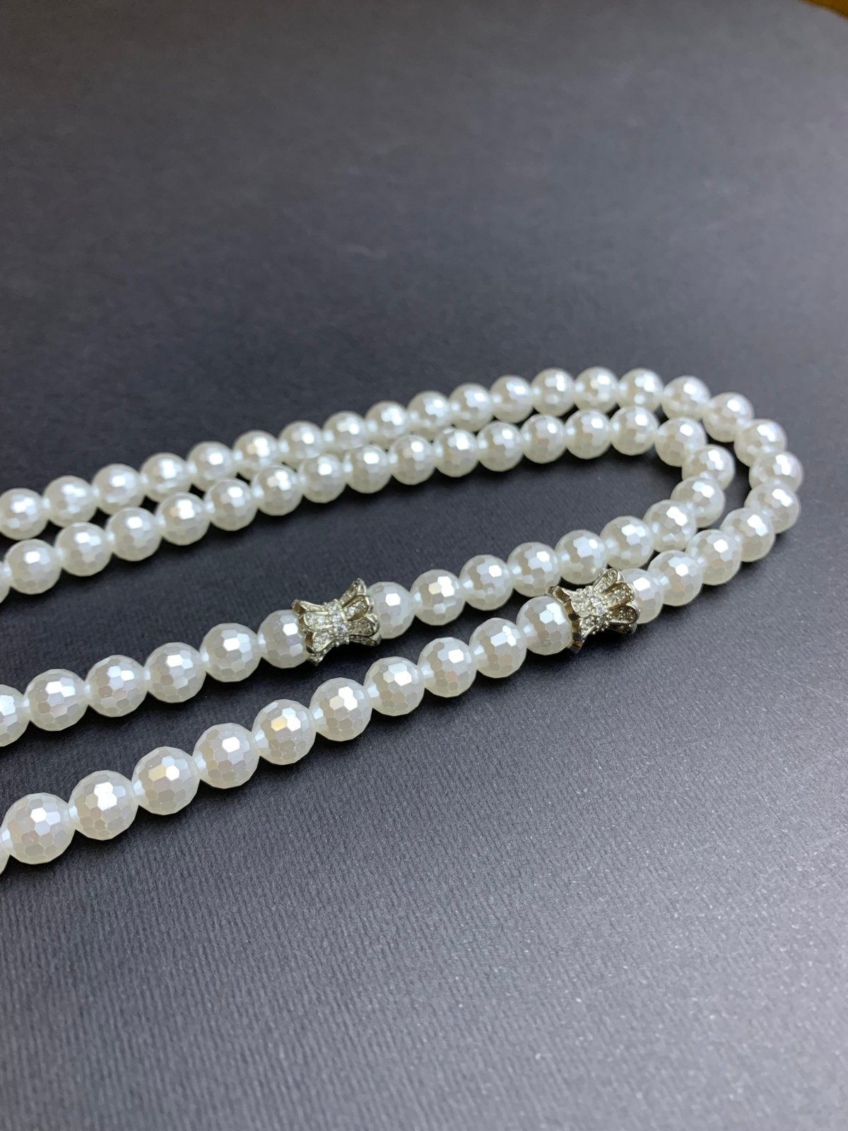 مِسْبَحَه اللؤلؤ مايوركا📿🤍 📿- مقاس 8 مم 📿- 99 حبه 📿- لؤلؤ مايوركا 📿_فواصل دهب صيني بفصوص زيركون 📿-شرابة حرير باللون الابيض 📿- مغلفة بشكل جميل في حقيبة هدايا تحمل علامتنا التجارية، مما يجعلها هدية رائعة في أي مناسبة.