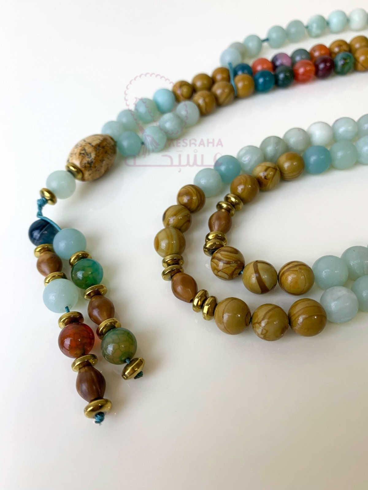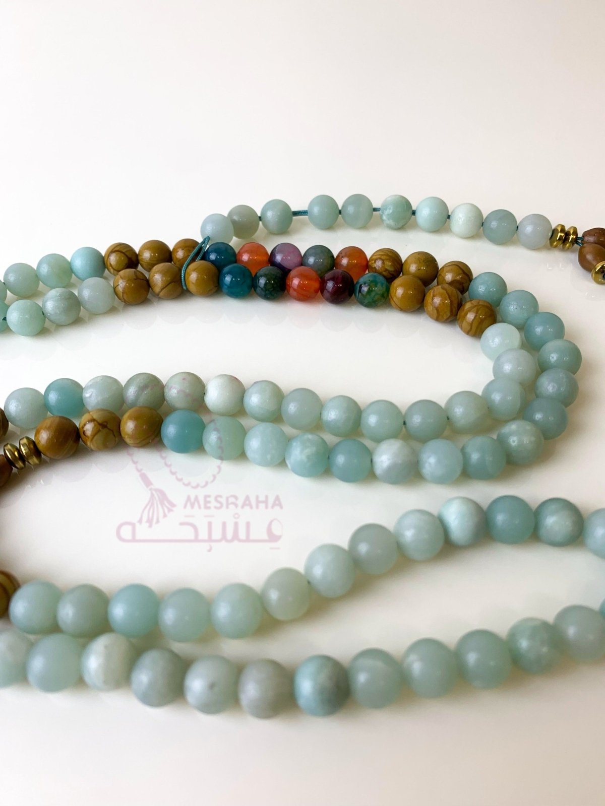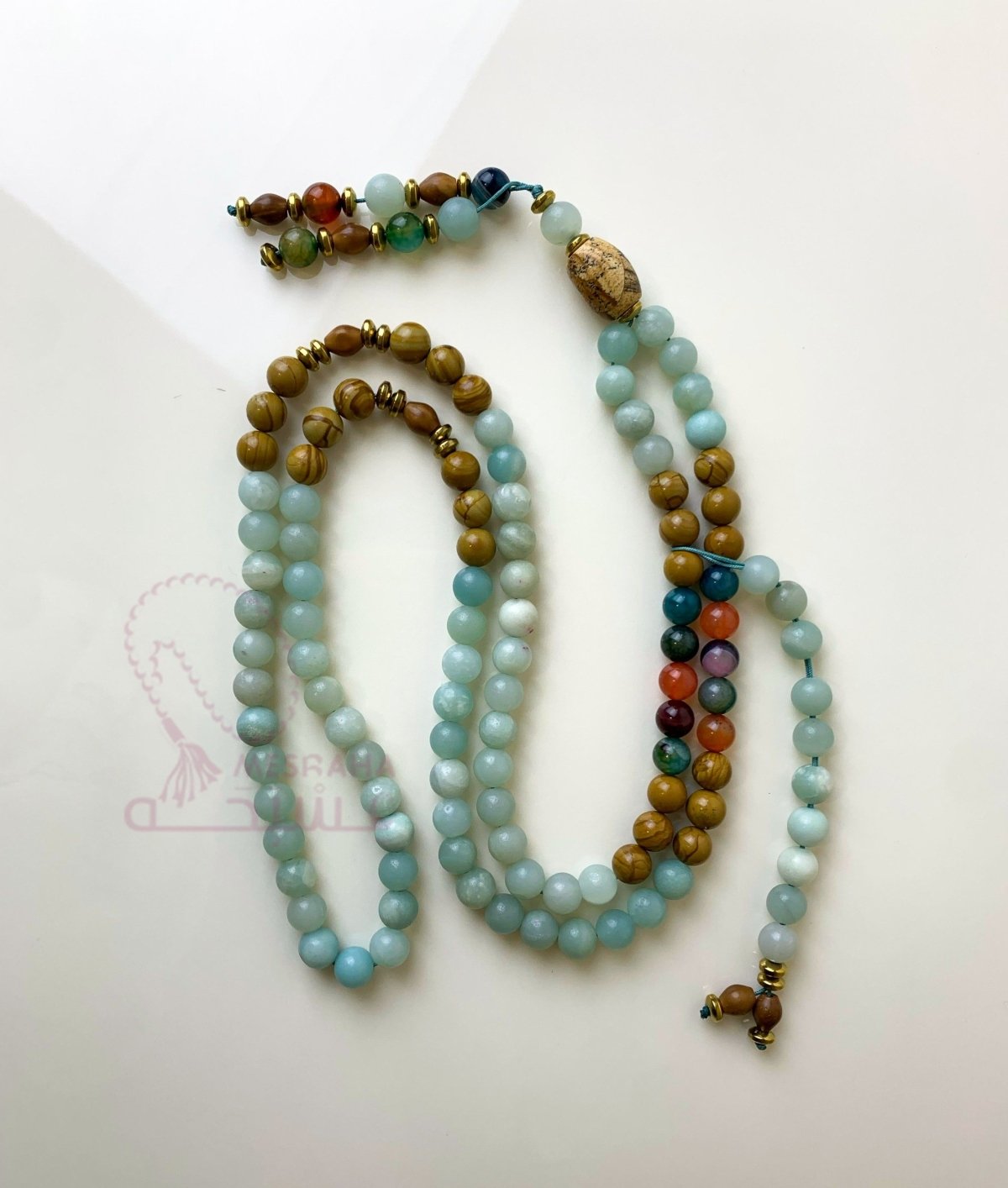 📿- مسبحة من حجر الامازونايت والجاسبر و العقيق 📿- مقاس 8مم 📿- 99حبه 📿-عداد جانبي لمضاعفه الذكر 📿- مغلفة بشكل جميل في حقيبة هدايا تحمل علامتنا التجارية، مما يجعلها هدية رائعة في أي مناسبة.