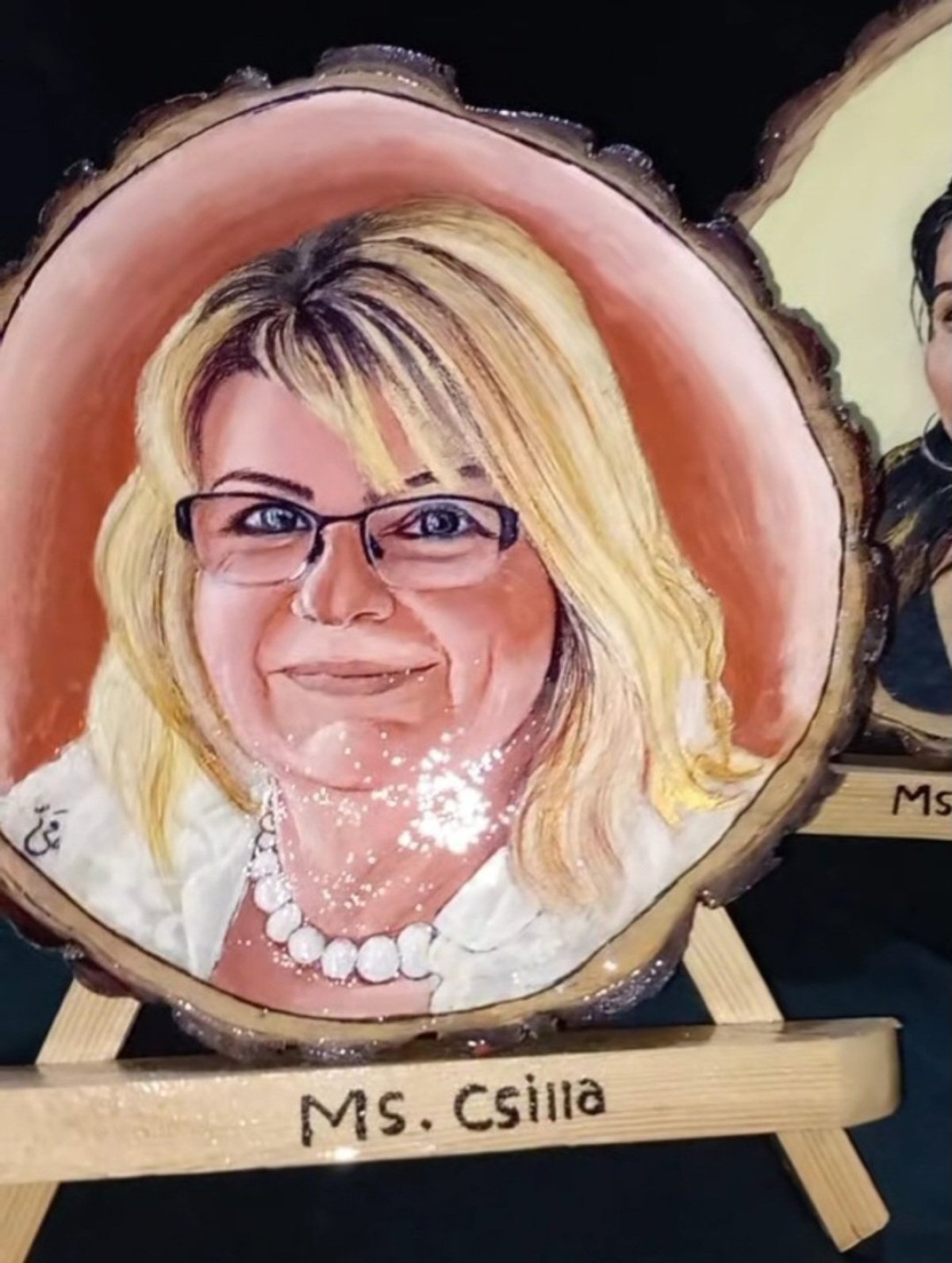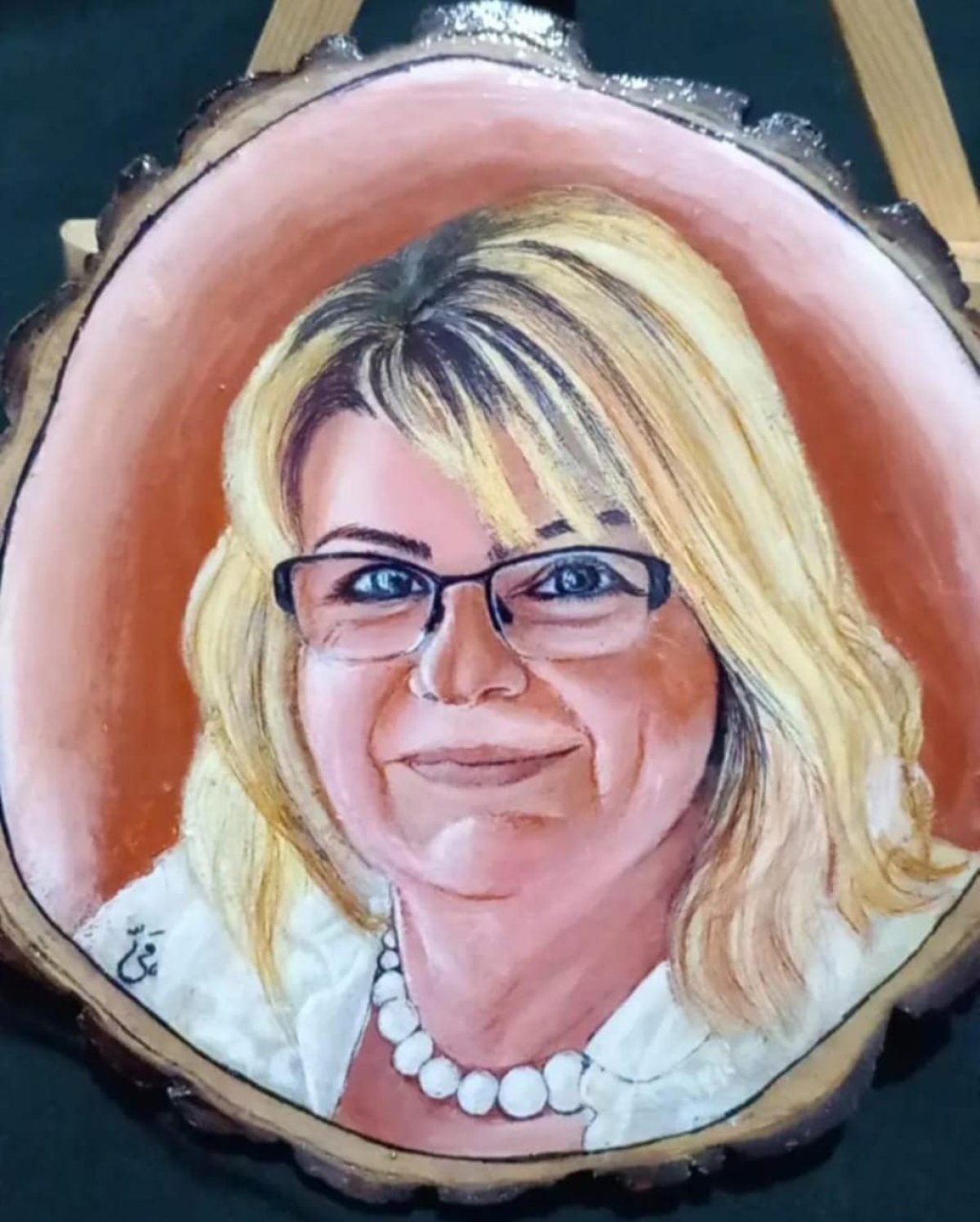 رسمة احترافية بالوان الاكريليك على جزع شجر بالإضافة إلى مادة الايبوكسي واستاند خشب مميز بالاسم والتغليف