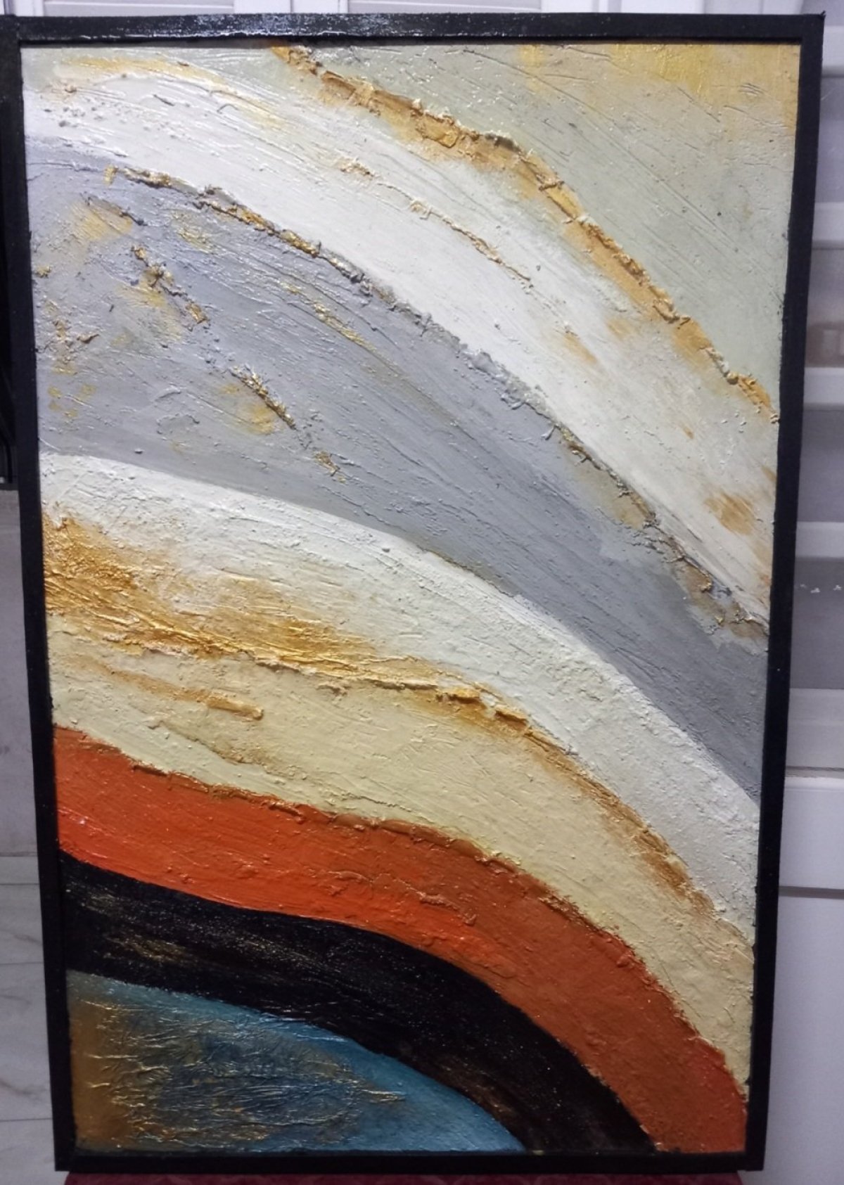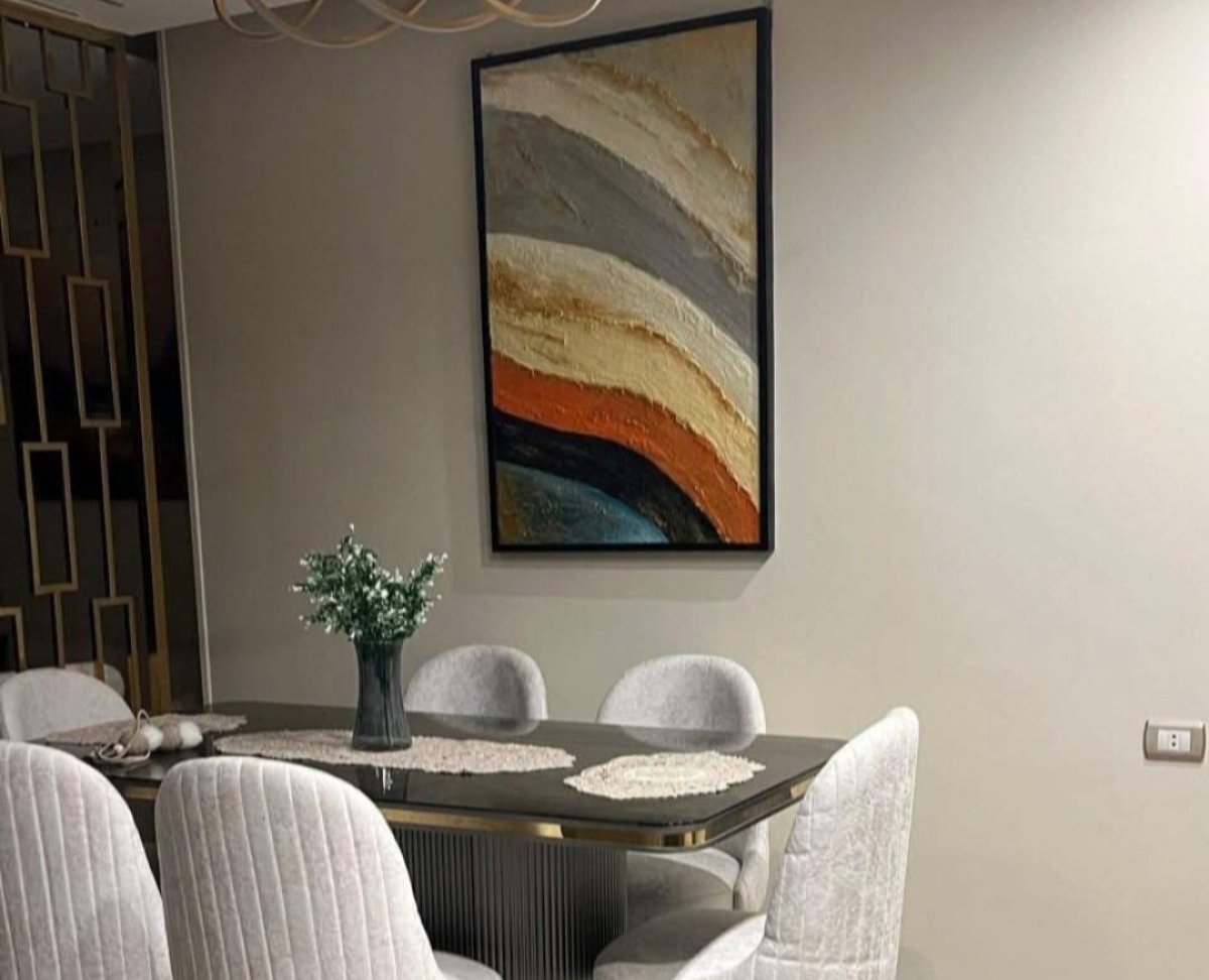 لوحة فنية حديثة، مقاس ١٢٠*٨٠، رسم بارز بألوان الأكريليك، بالإضافة إلى خامات أخرى لإضفاء لمسة جمالية ل منزلك بألوان خلابة. متاح تنفيذ أي تصميم.