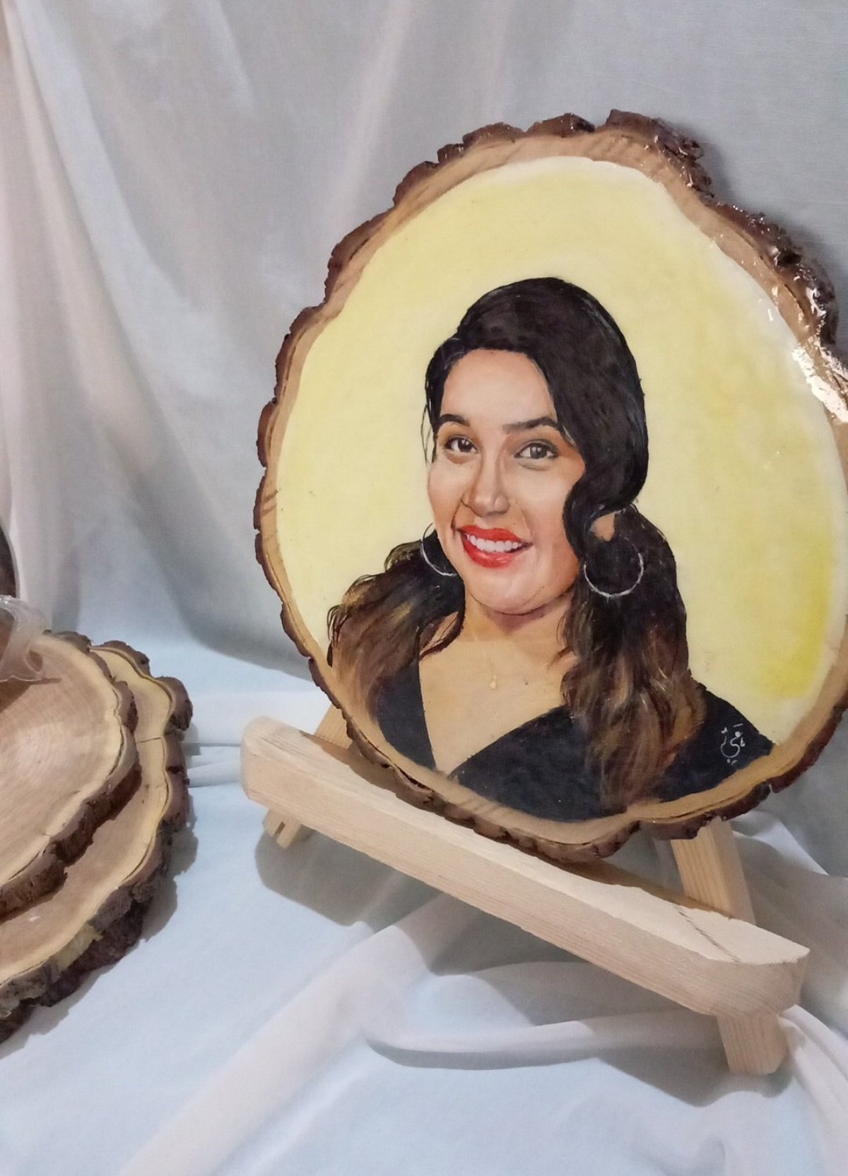 بورتريه احترافي بالوان الاكريليك على جزع شجر بالإضافة إلى مادة الايبوكسي واستاند خشب مميز بالاسم والتغليف متاح تنفيذ اي تصميم او اي رسمة تحبوها