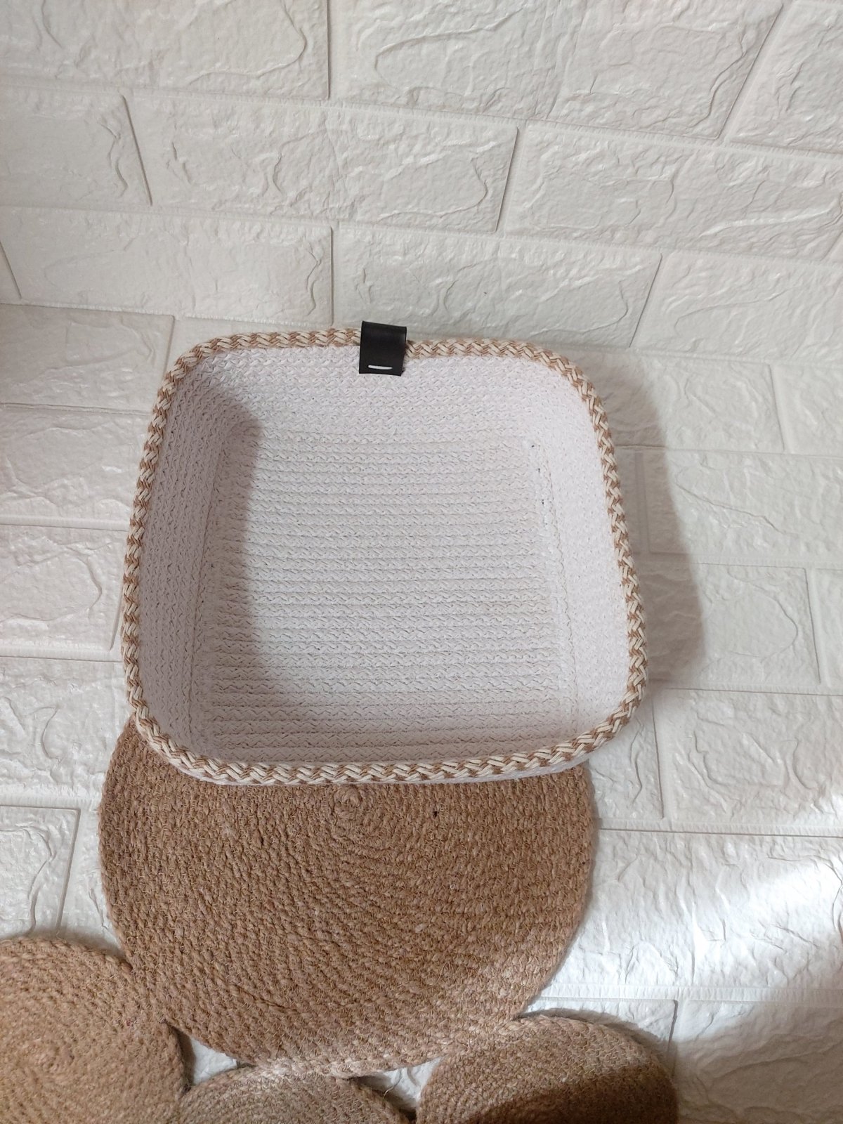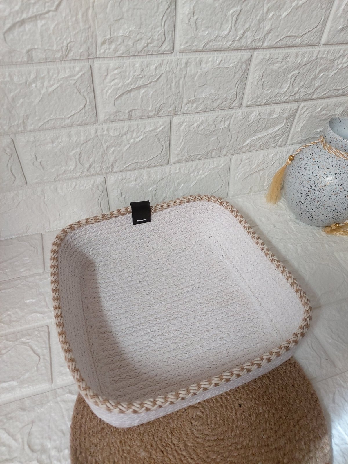باسكت منظم متعدد الاغراض على شكل مربع مصنوع من خيوط الكوردون المقاس ٢٥*٢٥*٨ سم يمكن تغيير المقاس واللون حسب الطلب