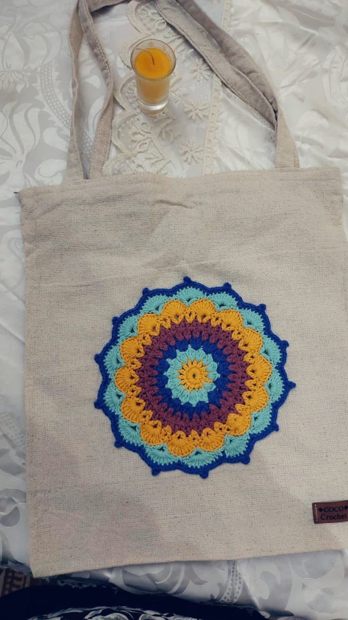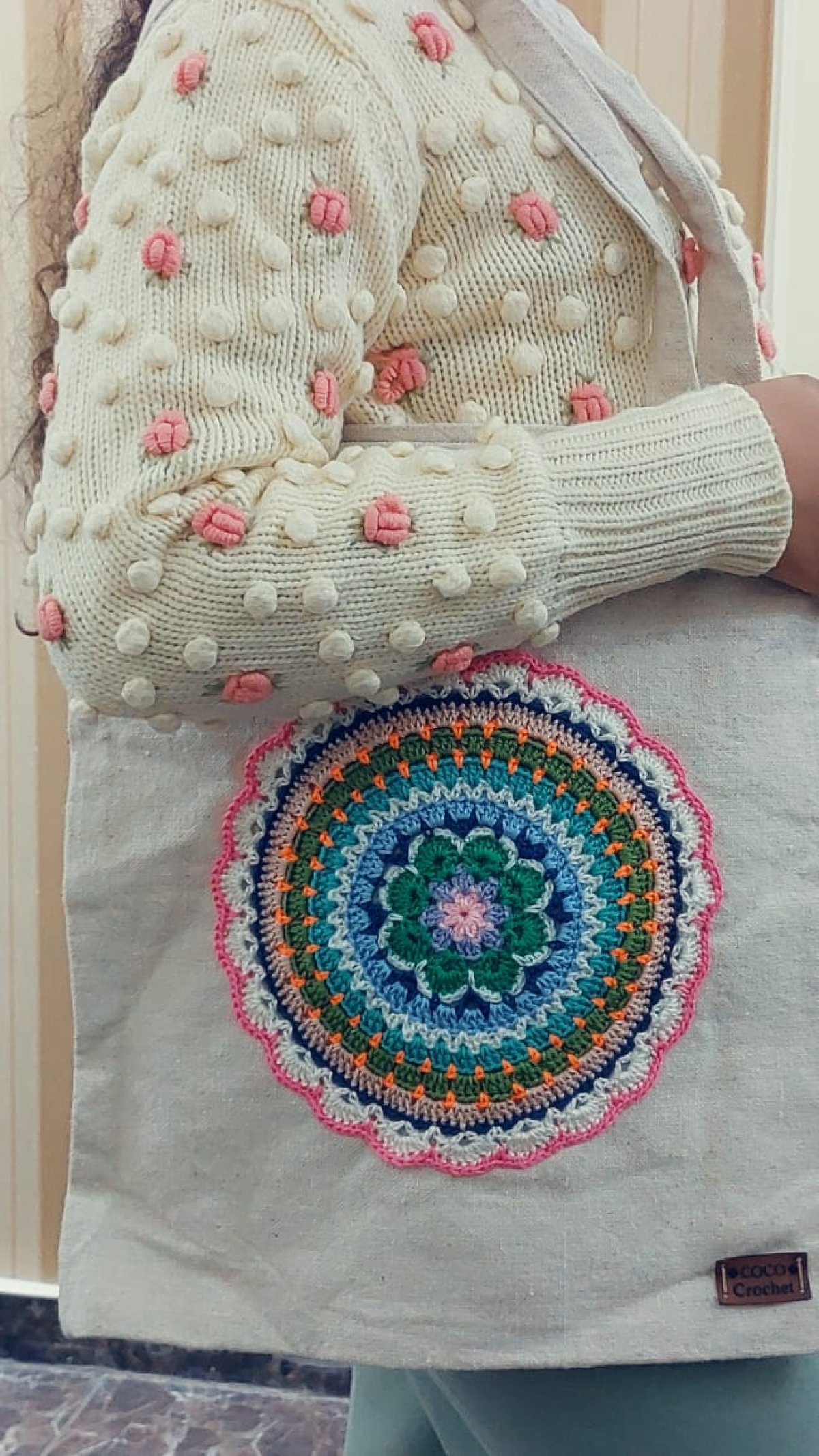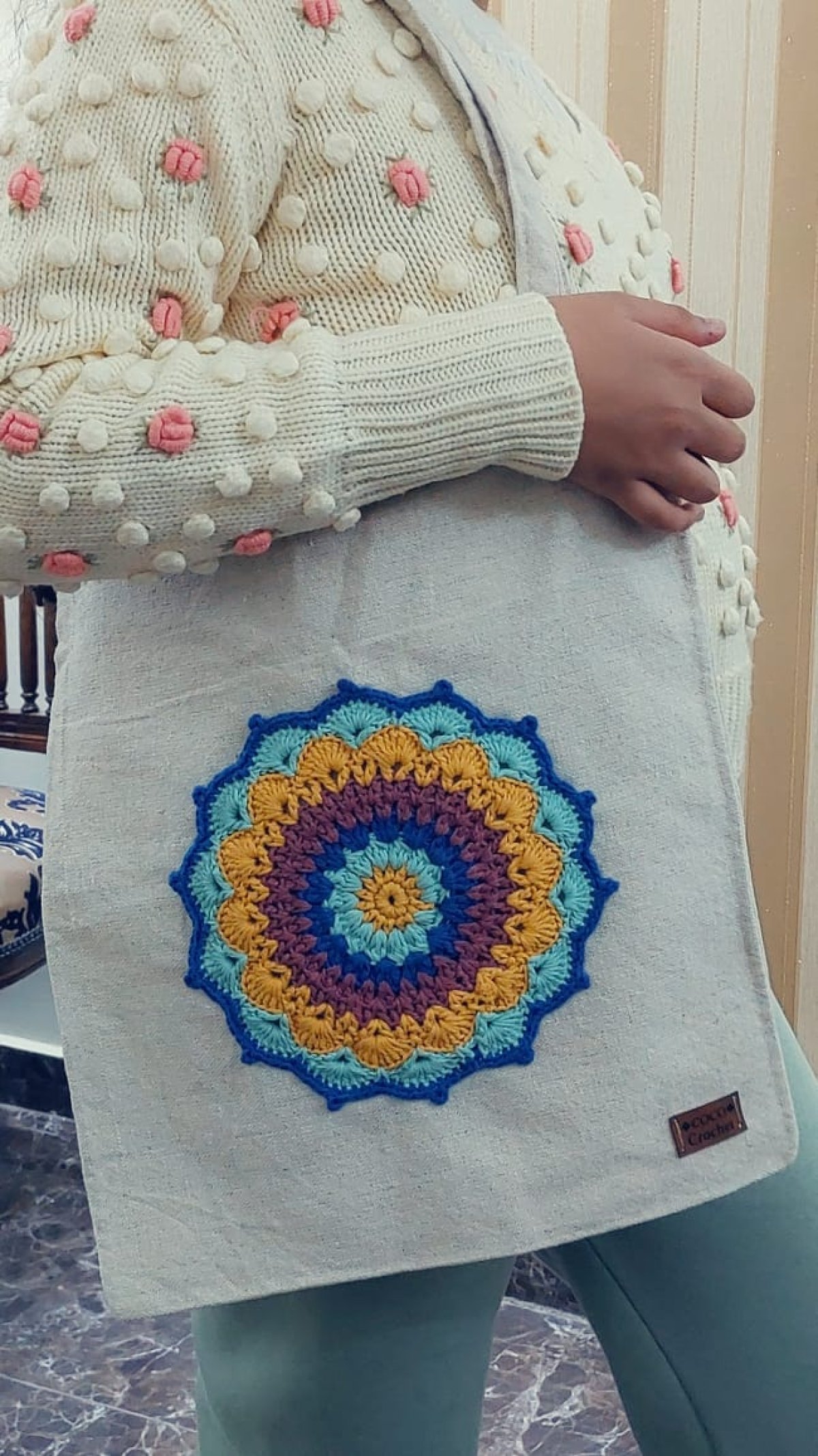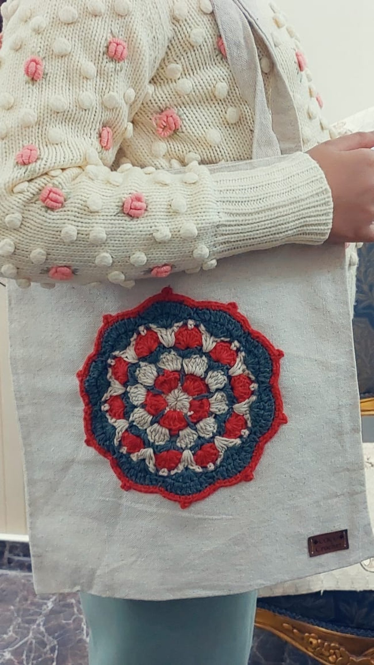 شنطة توت باج خامة دك بها بسوسته و مطعمة بشغل الكروشيه المميز مقاس ممتاز ومناسب جدا ٣٠×٣٥ سم