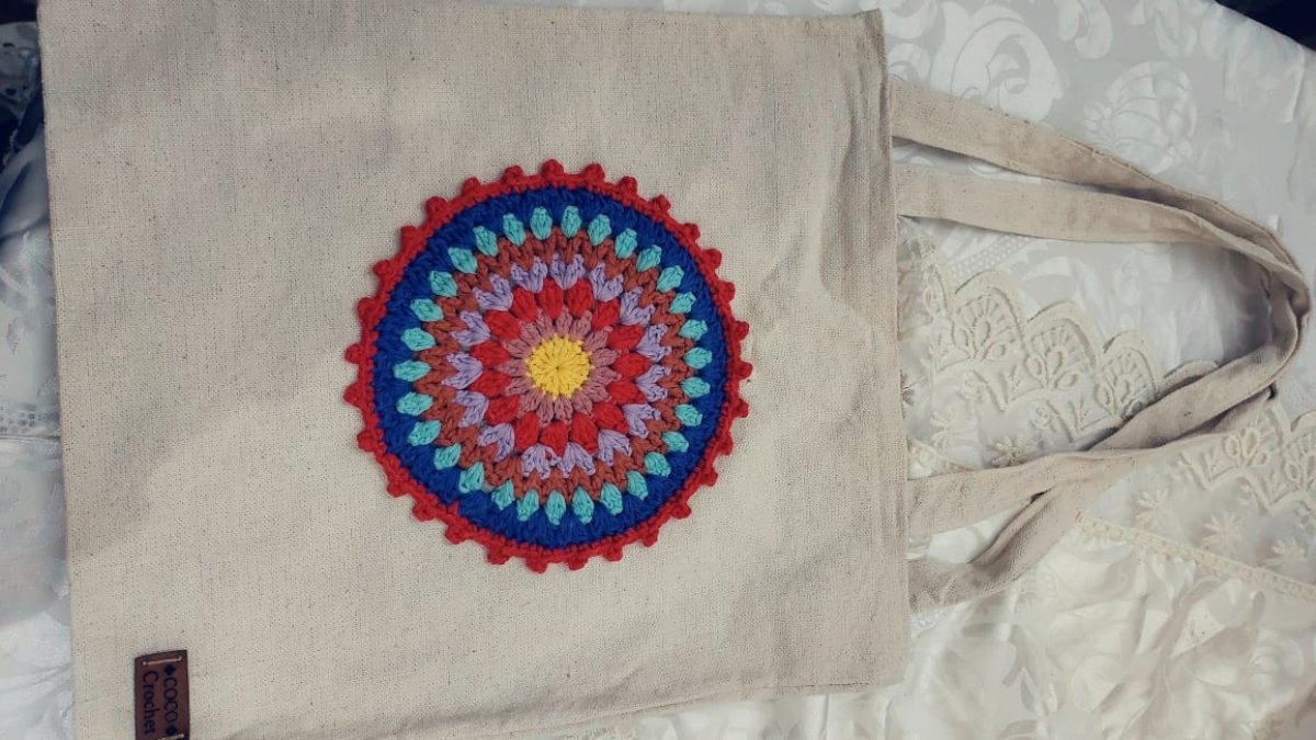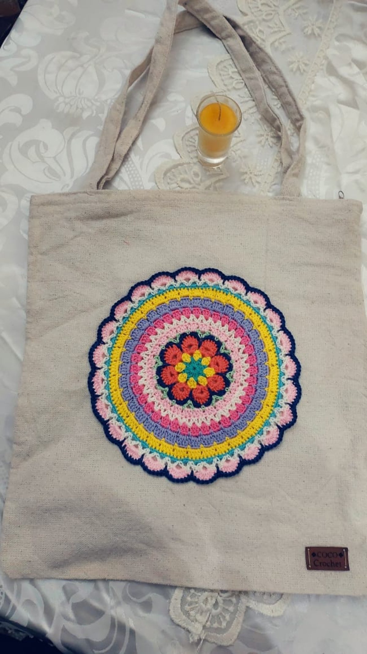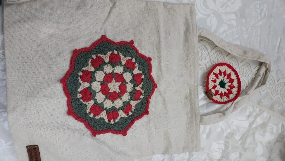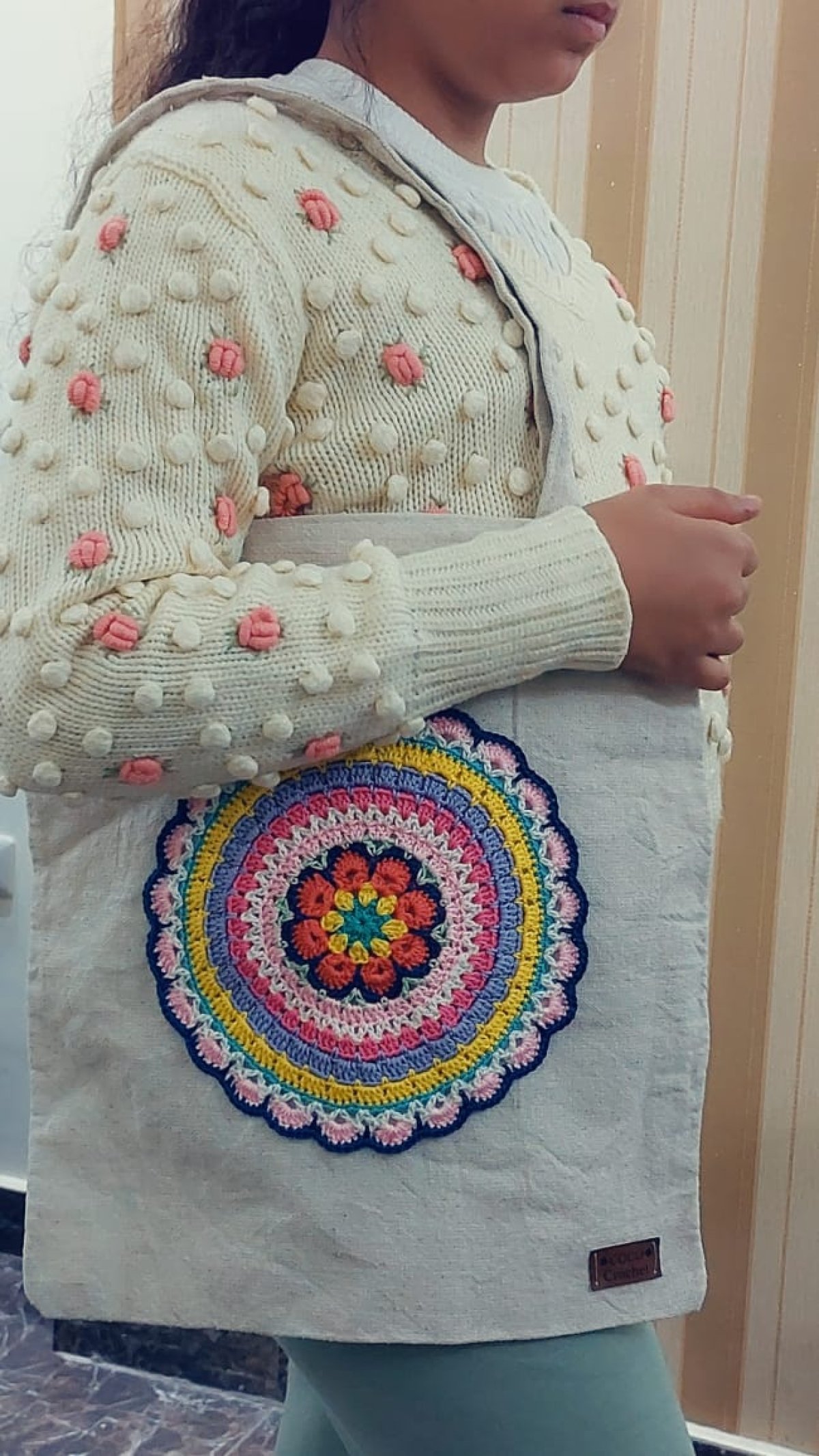 شنطة توت باج خامة دك بها بسوسته و مطعمة بشغل الكروشيه المميز مقاس ممتاز ومناسب جدا ٣٠×٣٥ سم