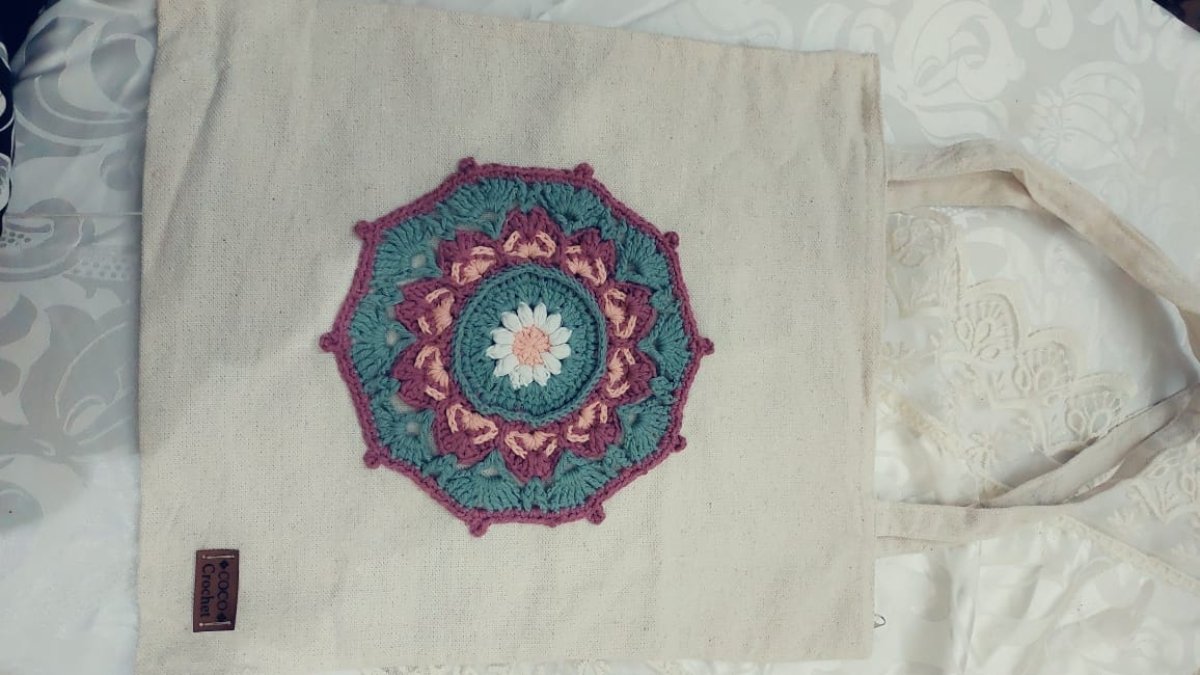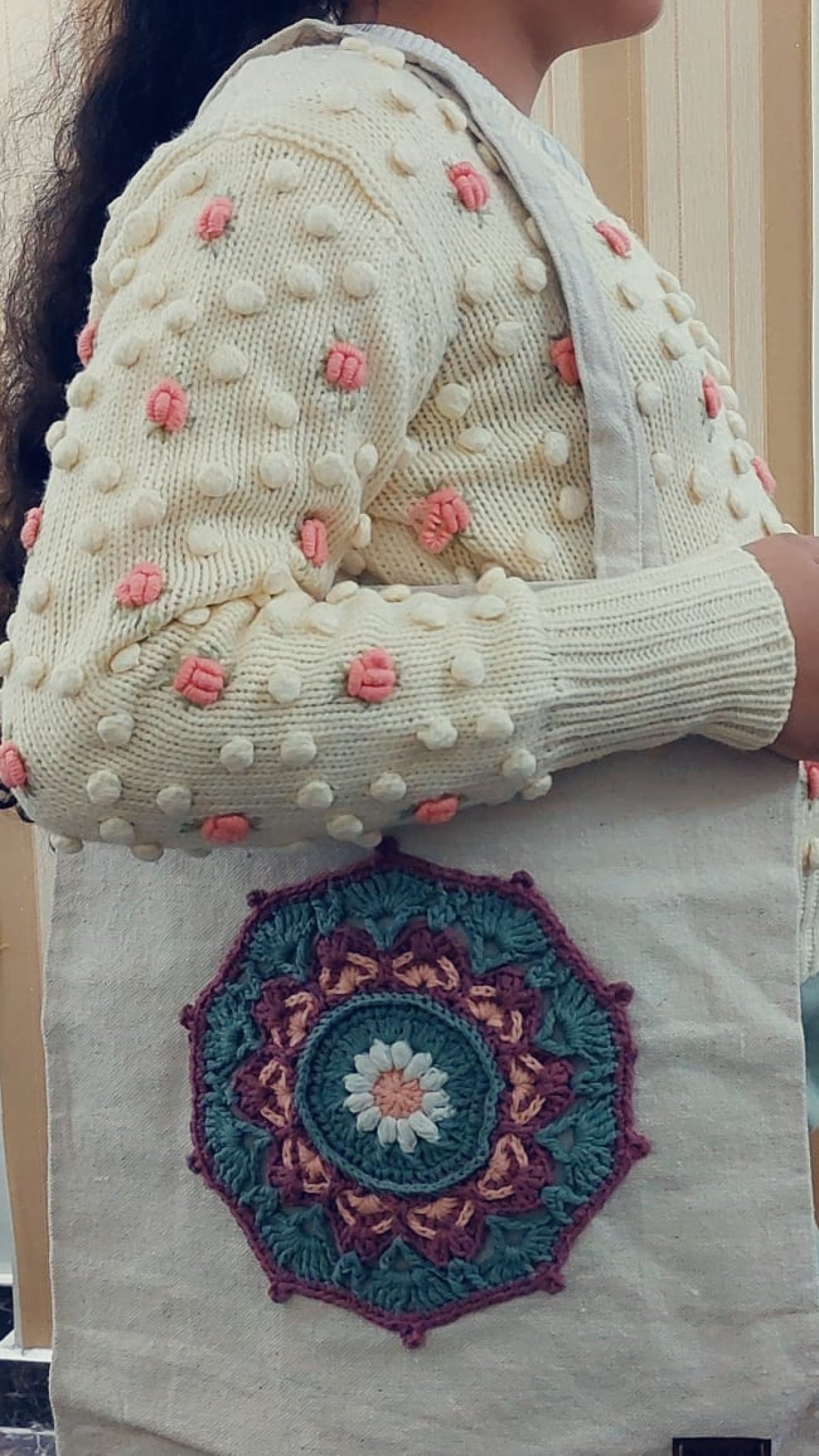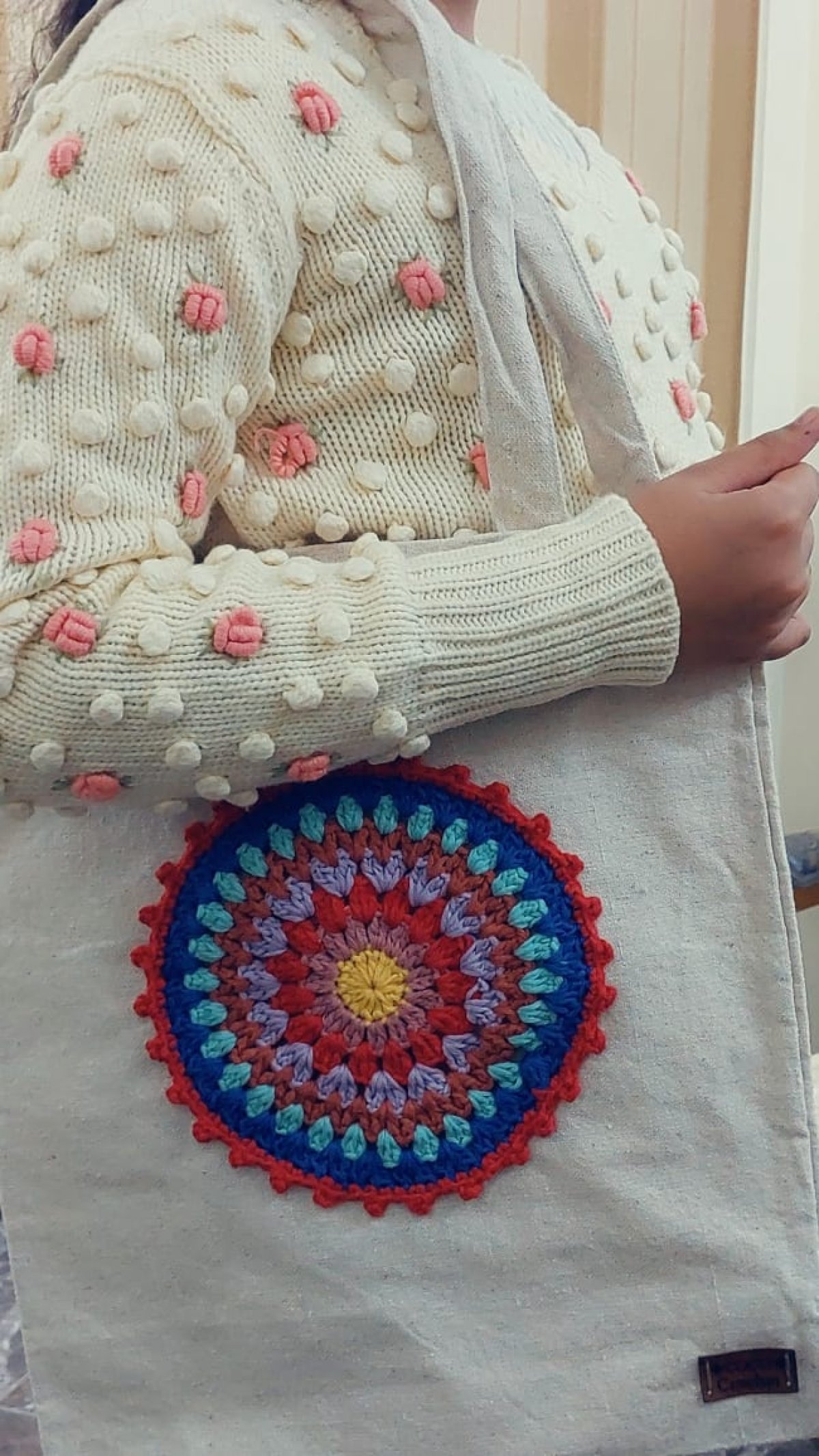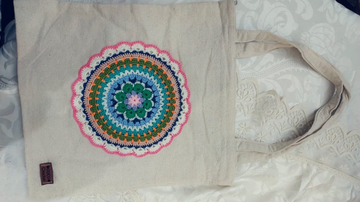 شنطة توت باج خامة دك بها بسوسته و مطعمة بشغل الكروشيه المميز مقاس ممتاز ومناسب جدا ٣٠×٣٥ سم