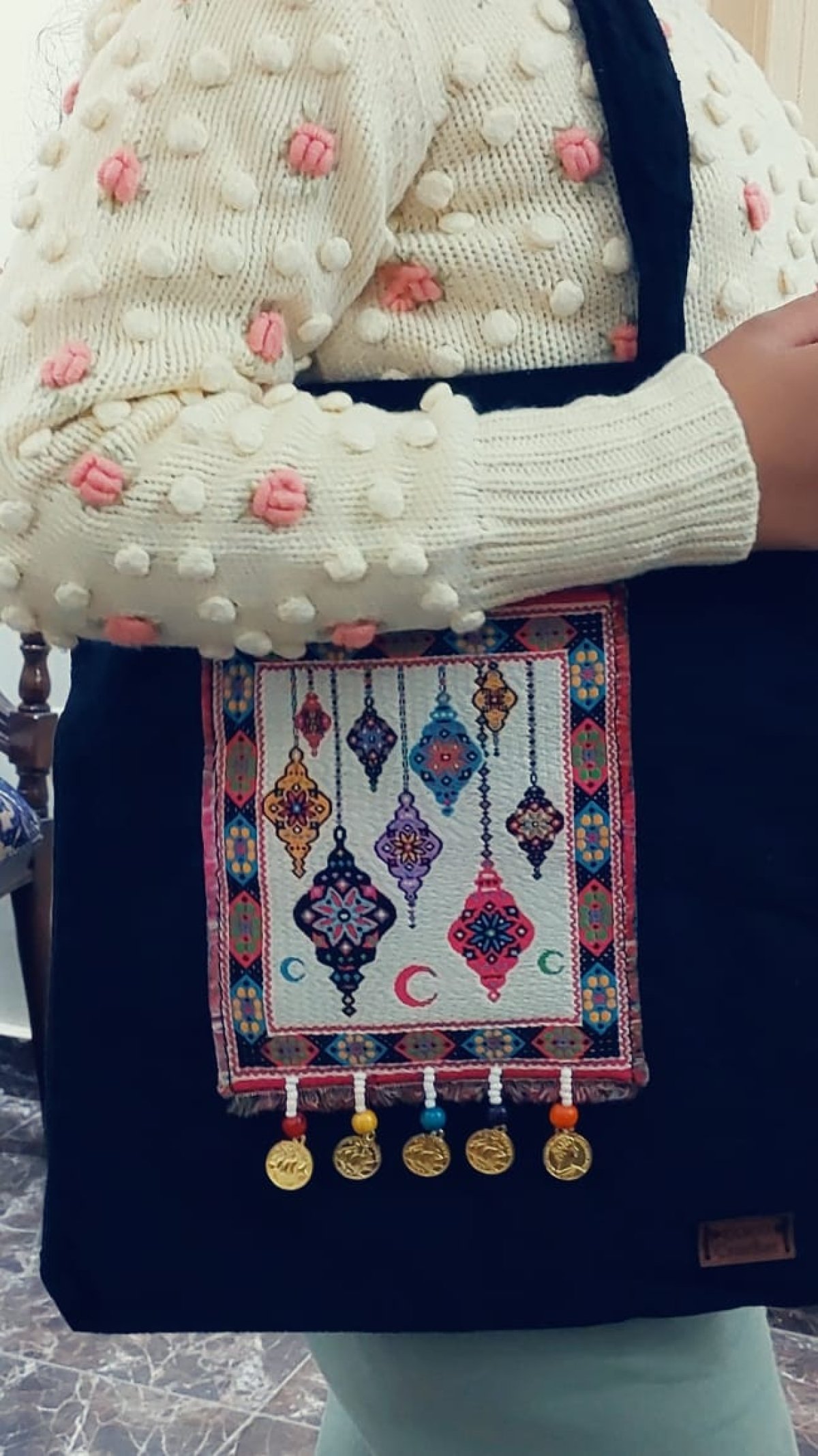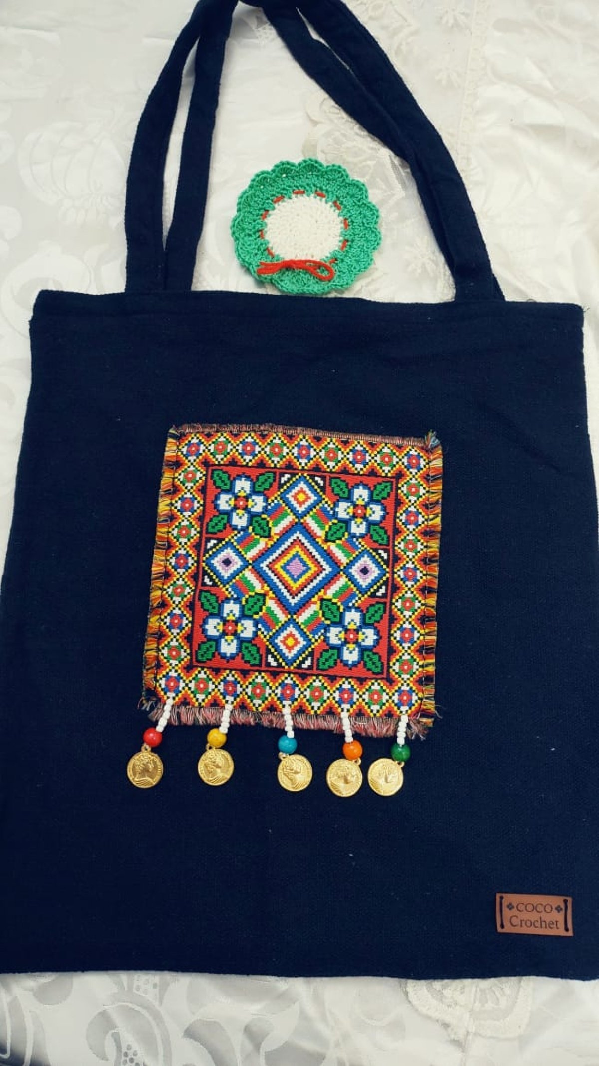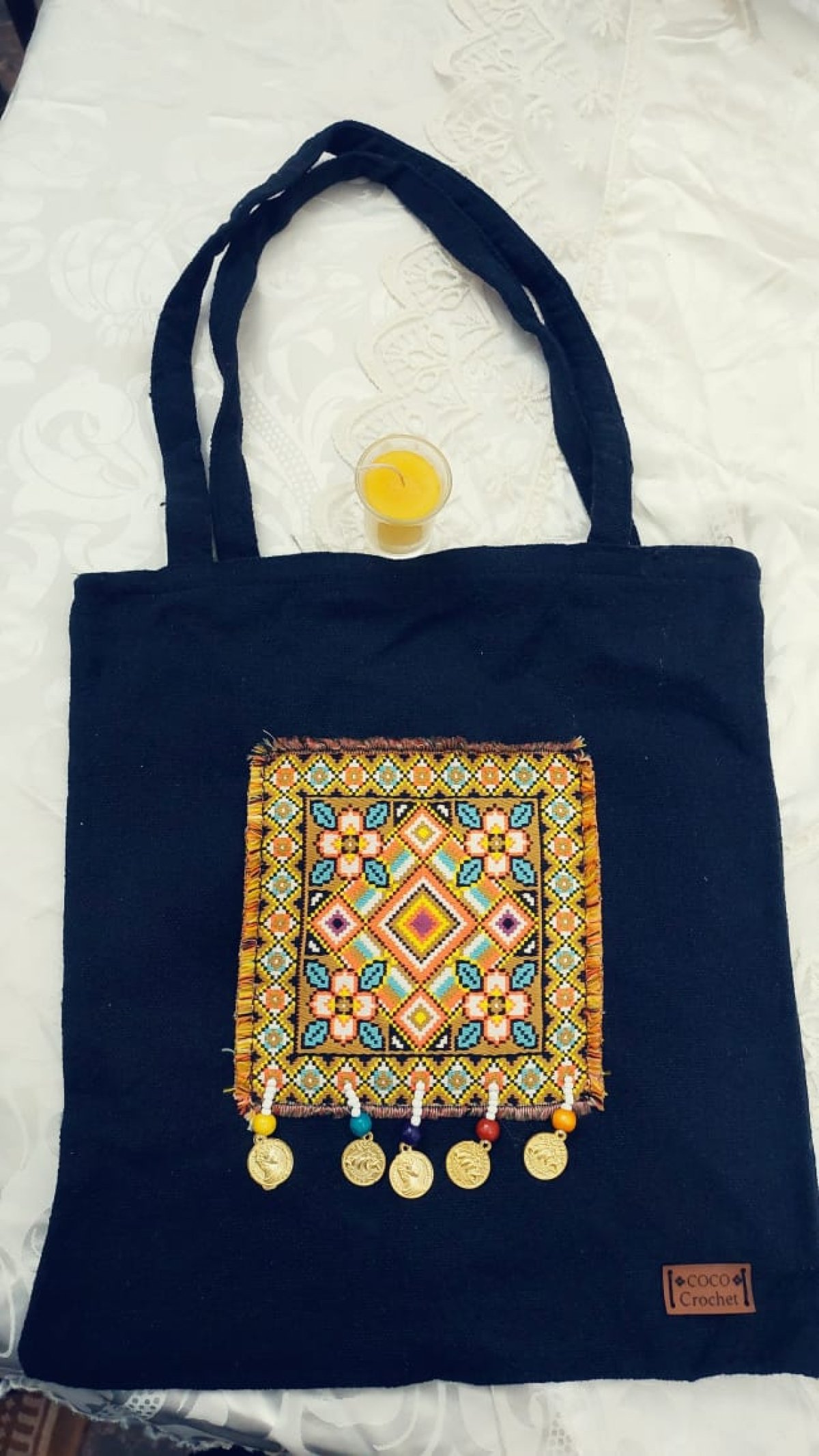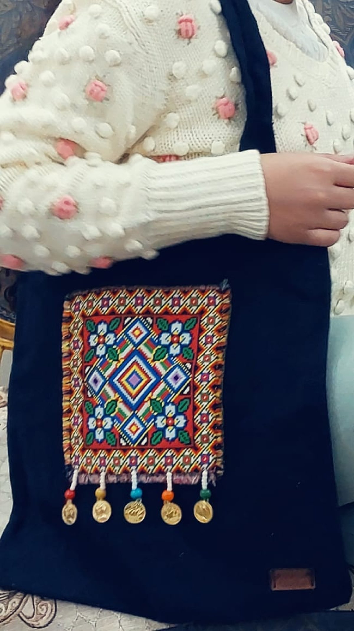 شنطة توت باج خامة دك بها بسوسته و مطعمة بشغل الفولكلور المميز مقاس ممتاز ومناسب جدا ٣٠×٣٥ سم