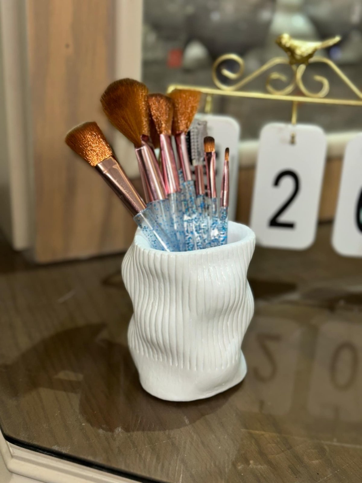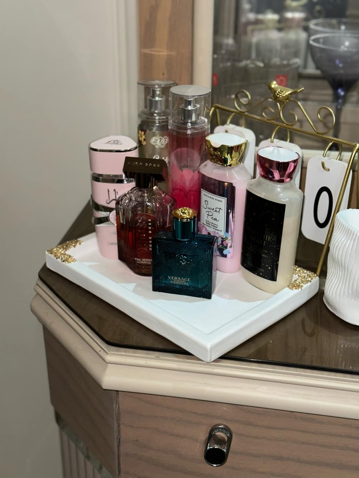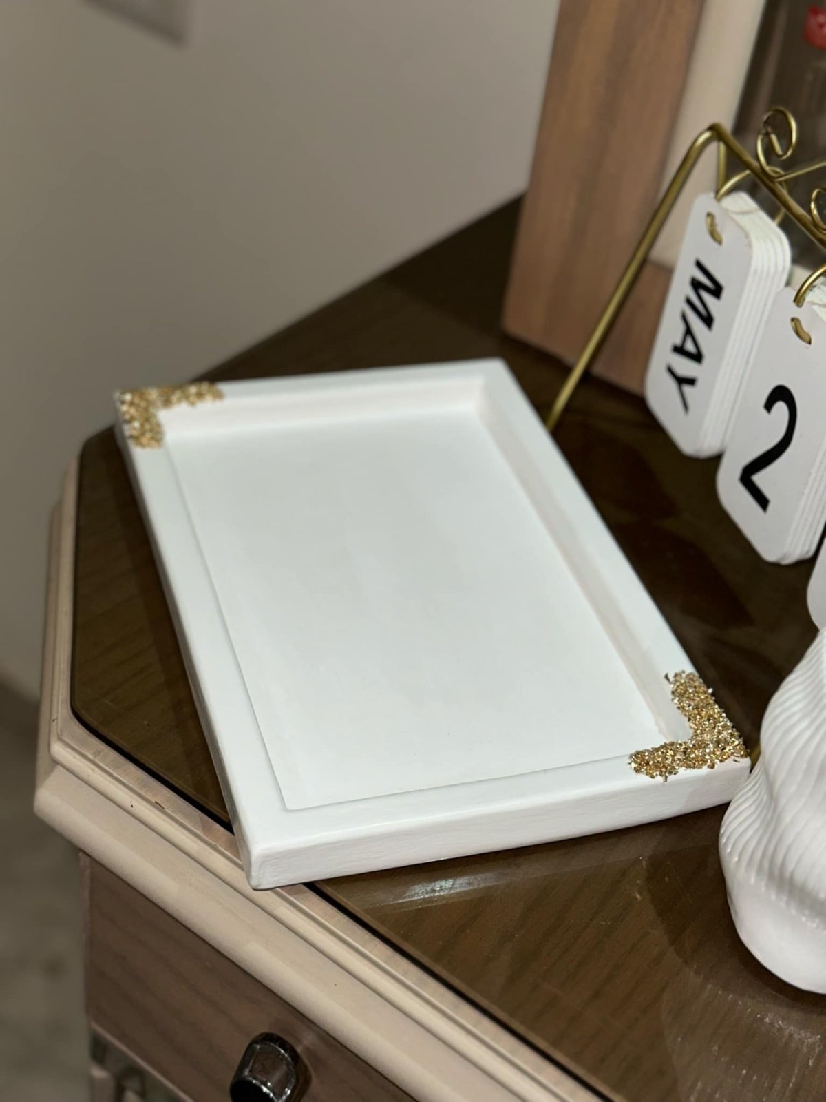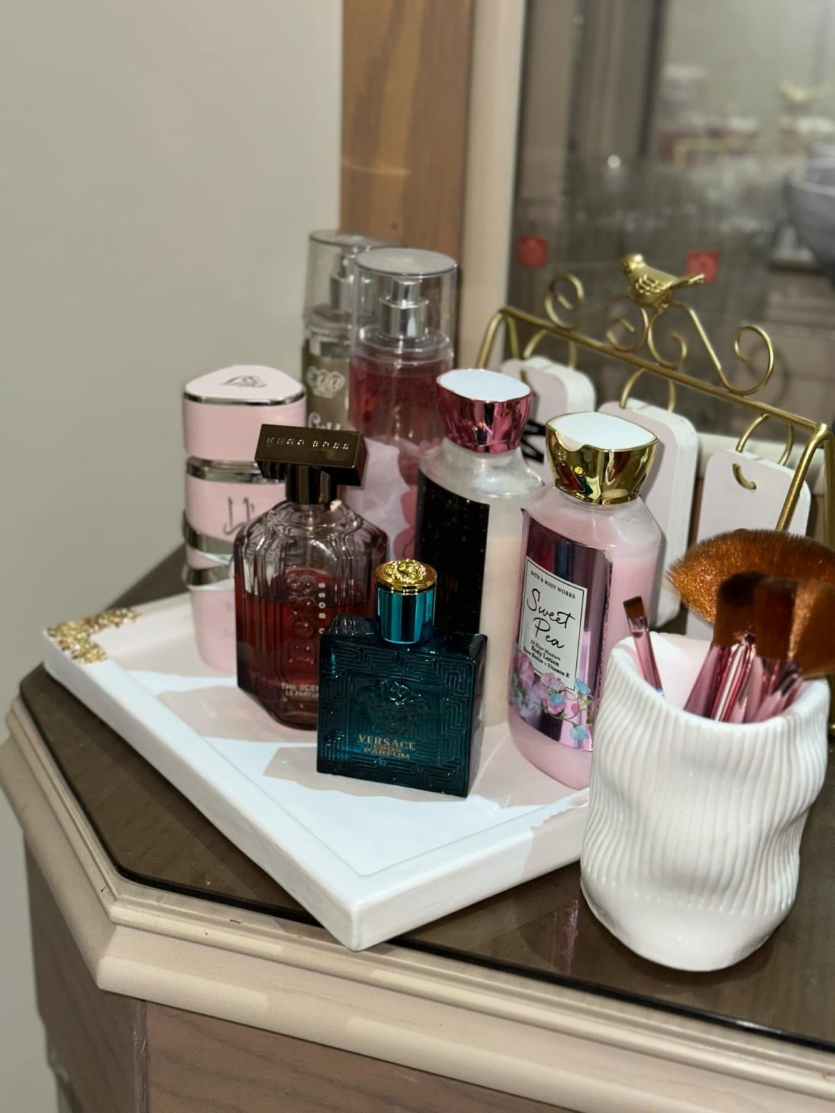🧴✨ ** طقم تنظيم فاخر لمستحضرات التجميل والعطور وفرش الميك اب** أضيفي لمسة من الأناقة والترتيب لركن التجميل الخاص بكِ مع هذا الطقم المميز، المصمم ليجمع بين العملية والديكور الراقي. 📦 **مكونات الطقم:** - صينية ديكورية أنيقة باللون الأبيض مع زخارف ذهبية في الزوايا المقاس : 28سم * 20 سم الخامه : كونكريت (متاح التنفيذ بخامه البوليستر حسب الطلب) - حامل فرش ميك اب باللون الأبيض بتصميم عصري مموج المقاس : 10.5سم * 8.5 سم الخامه : كونكريت (متاح التنفيذ بخامه البوليستر حسب الطلب) 💡 **المميزات:** - مثالي لترتيب العطور، اللوشن، والإكسسوارات اليومية - يساعد على تنظيم المساحة بطريقة أنيقة ومرتبة - تصميم عصري يناسب مختلف أنماط الديكور - عملي للاستخدام اليومي ويمكن وضعه على التسريحة أو الكومود 🎁 **مثالي كهدية مميزة لمحبي التنظيم والجمال** *متاح تغيير الالوان حسب الطلب*