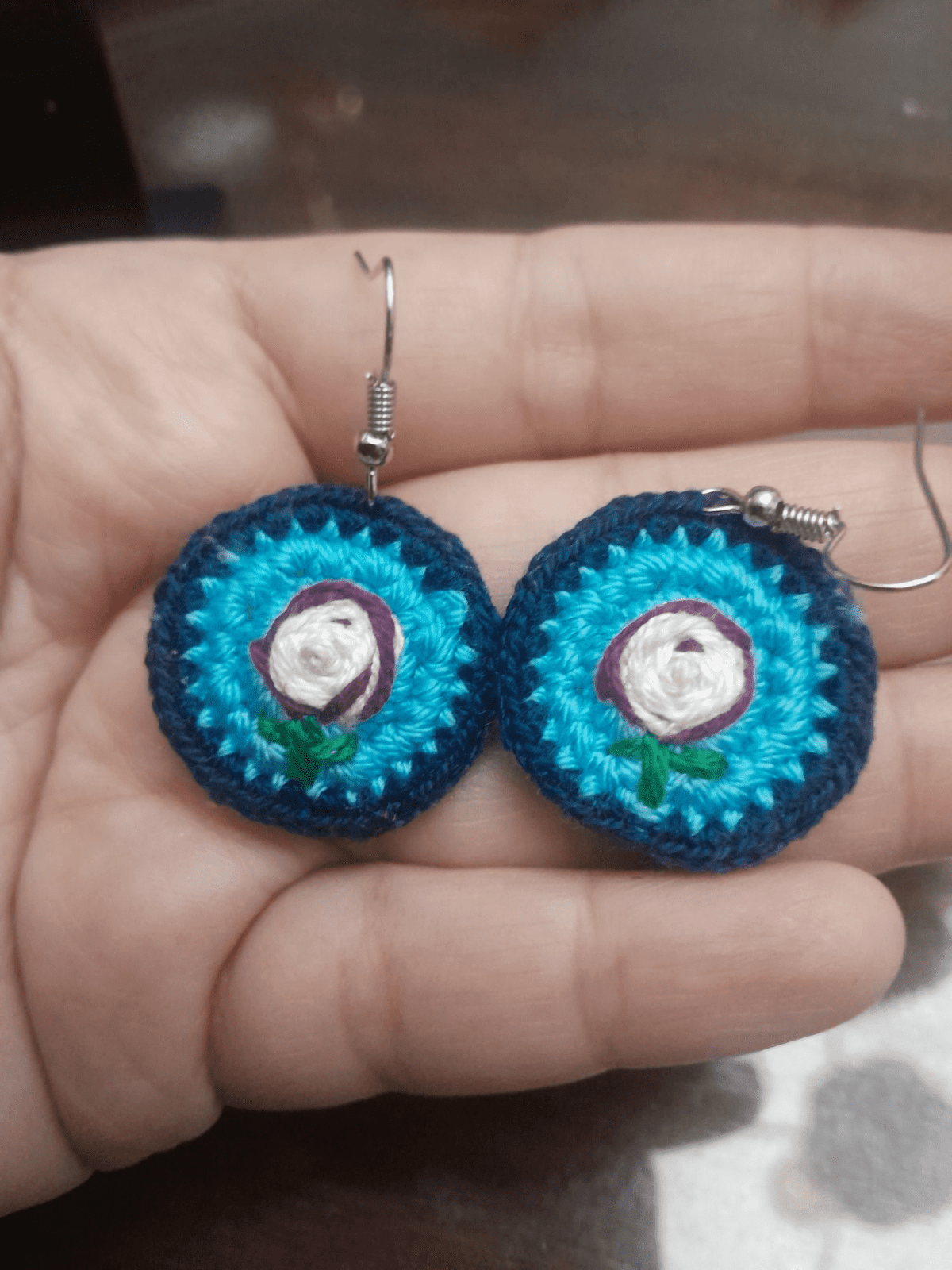 حلق كروشيه صناعة يدوي من خيوط قطن ناعمة وخفيفة على الاذن مطعم بالتطريز منتهى الرقة مميز جداااا مقاس ٢.٥×٢.٥ سم متاح قطعه واحدة من اللون ده ويمكن اعادة تنفيذه بألوان كتيره