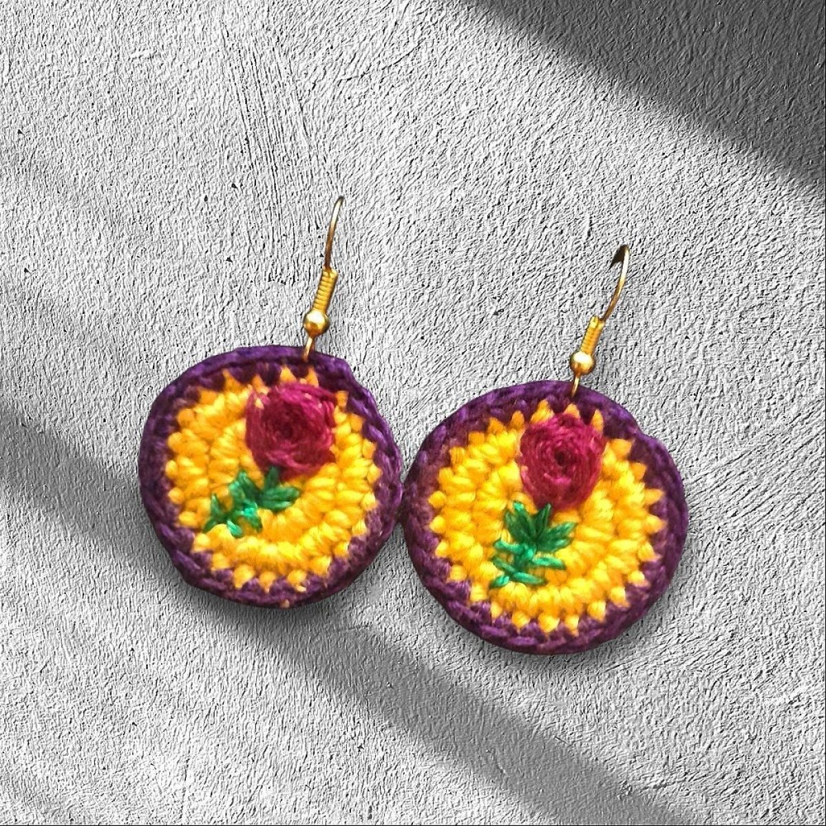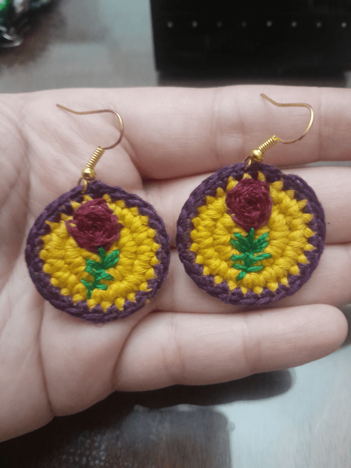 حلق كروشيه صناعة يدوي من خيوط قطن ناعمة وخفيفة على الاذن مطعم بالتطريز منتهى الرقة مميز جداااا مقاس ٣×٣ سم متاح قطعه واحدة من اللون ده ويمكن اعادة تنفيذه بألوان كتيره