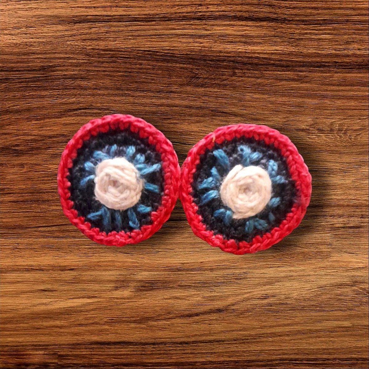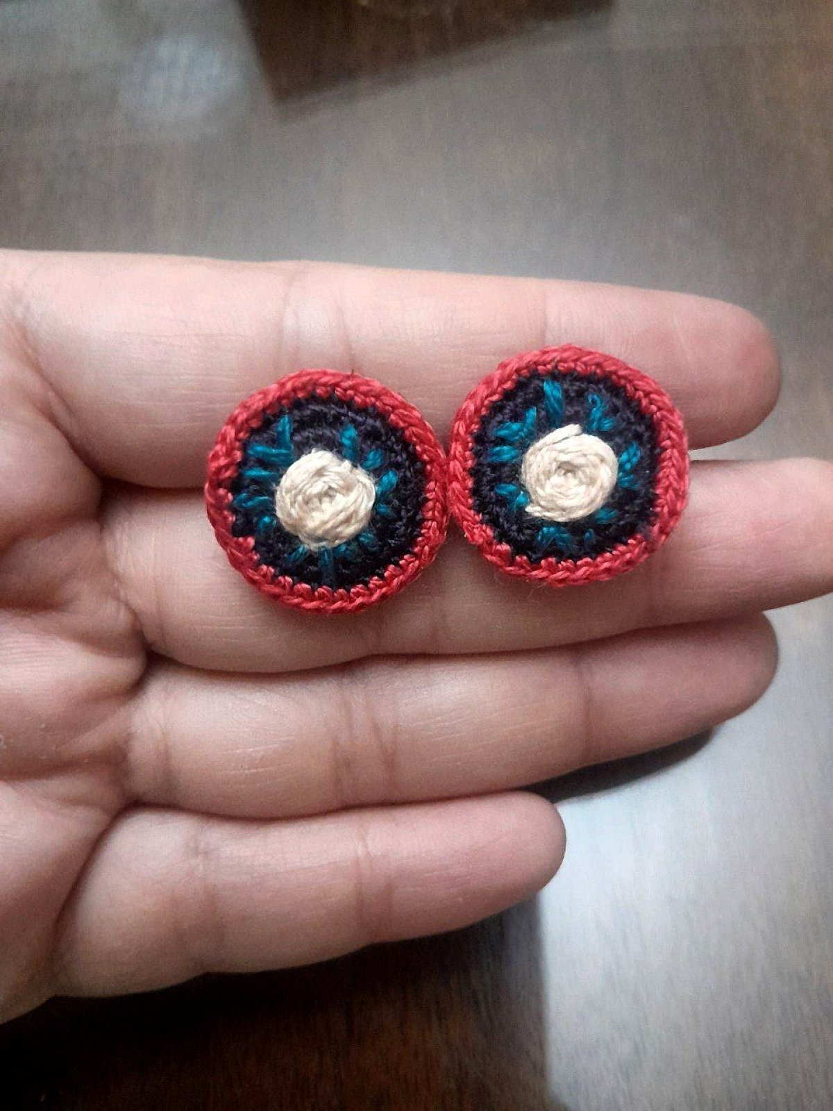حلق كروشيه صناعة يدوي من خيوط قطن ناعمة وخفيفة على الاذن مطعم بالتطريز منتهى الرقة مميز جداااا مقاس ٢.٥×٢.٥ سم متاح قطعه واحدة من اللون ده ويمكن اعادة تنفيذه بألوان كتيره