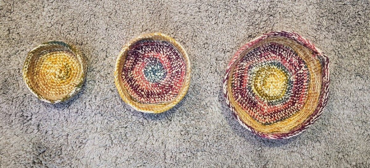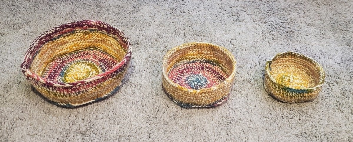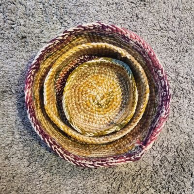 وحدات تخزين يدوية الصنع من خيط الصوف عالي الجودة يستخدم في تخزين الاكسسوار و الماكياج او اغراض دورة المياه يمنح مظهرا انيقا و مرتب ٣ قطع مقاسات: ١١،١٥،١٩ سم