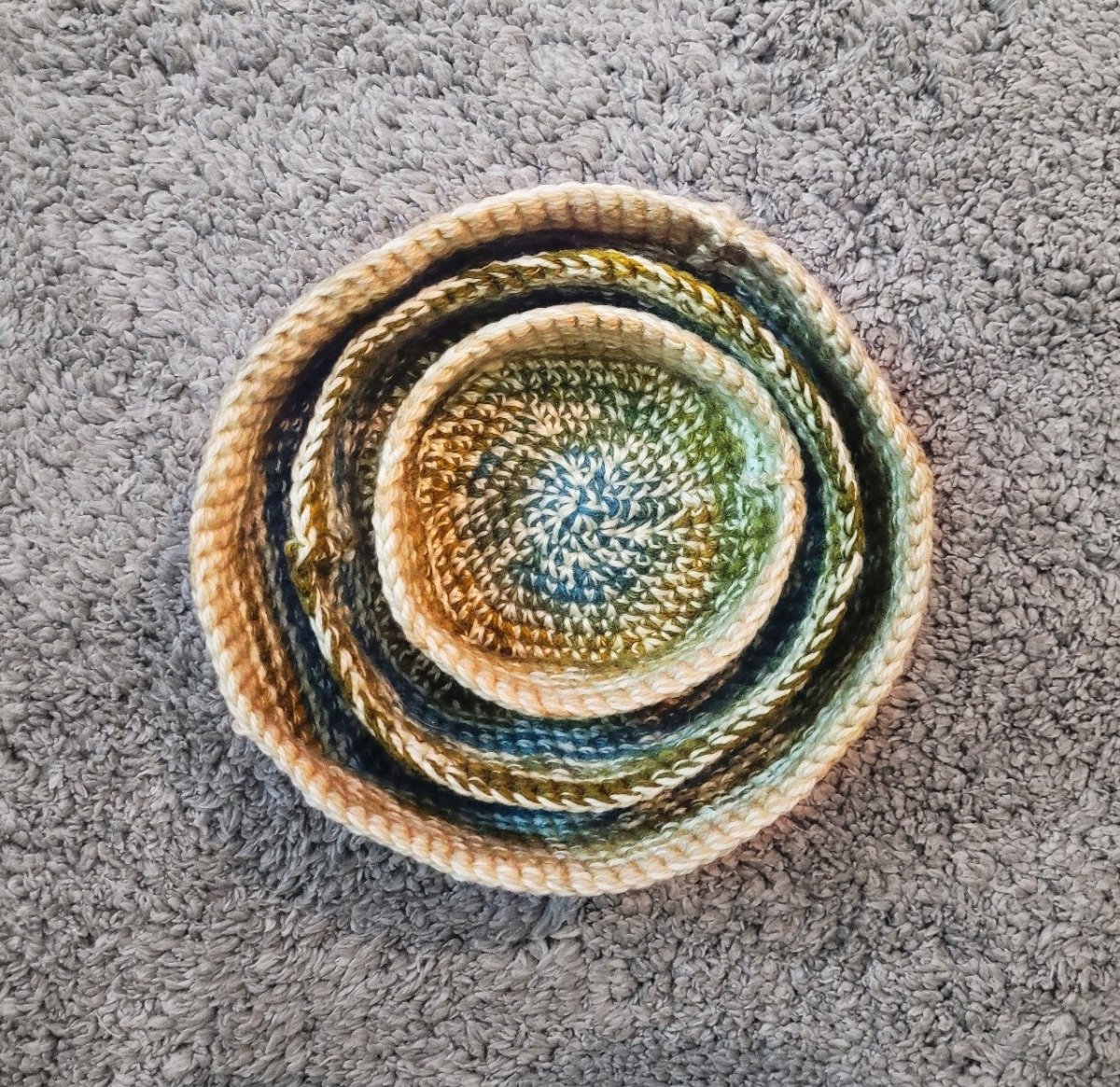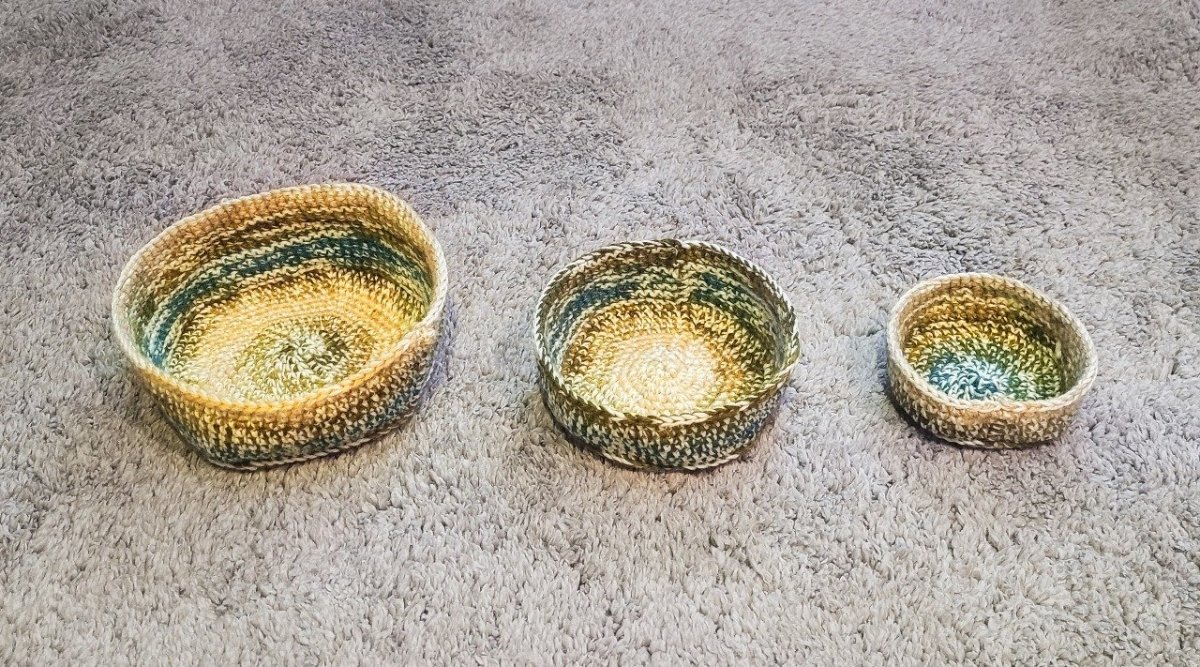 وحدات تخزين يدوية الصنع من خيط الصوف عالي الجودة يستخدم في تخزين الاكسسوار و الماكياج او اغراض دورة المياه يمنح مظهرا انيقا و مرتب ٣ قطع مقاسات: ١١،١٤،١٧ سم