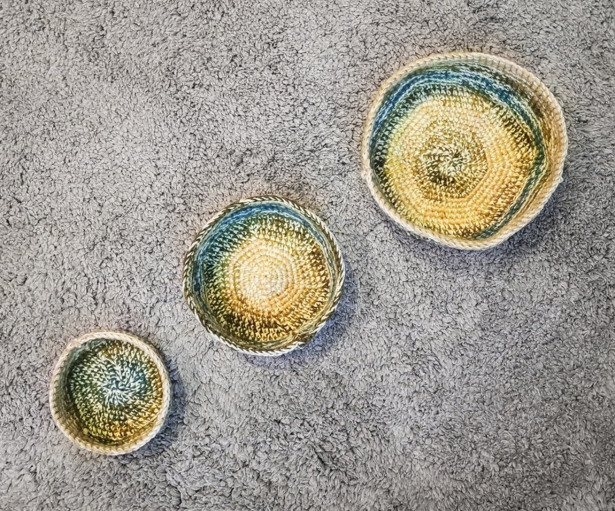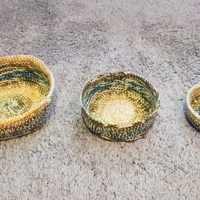 وحدات تخزين يدوية الصنع من خيط الصوف عالي الجودة يستخدم في تخزين الاكسسوار و الماكياج او اغراض دورة المياه يمنح مظهرا انيقا و مرتب ٣ قطع مقاسات: ١١،١٤،١٧ سم