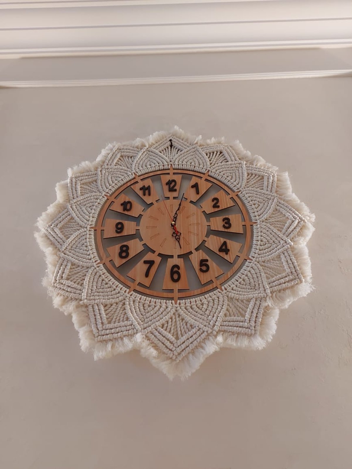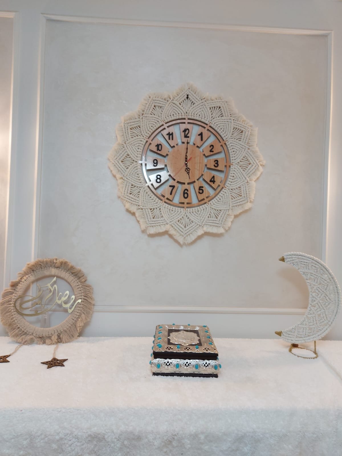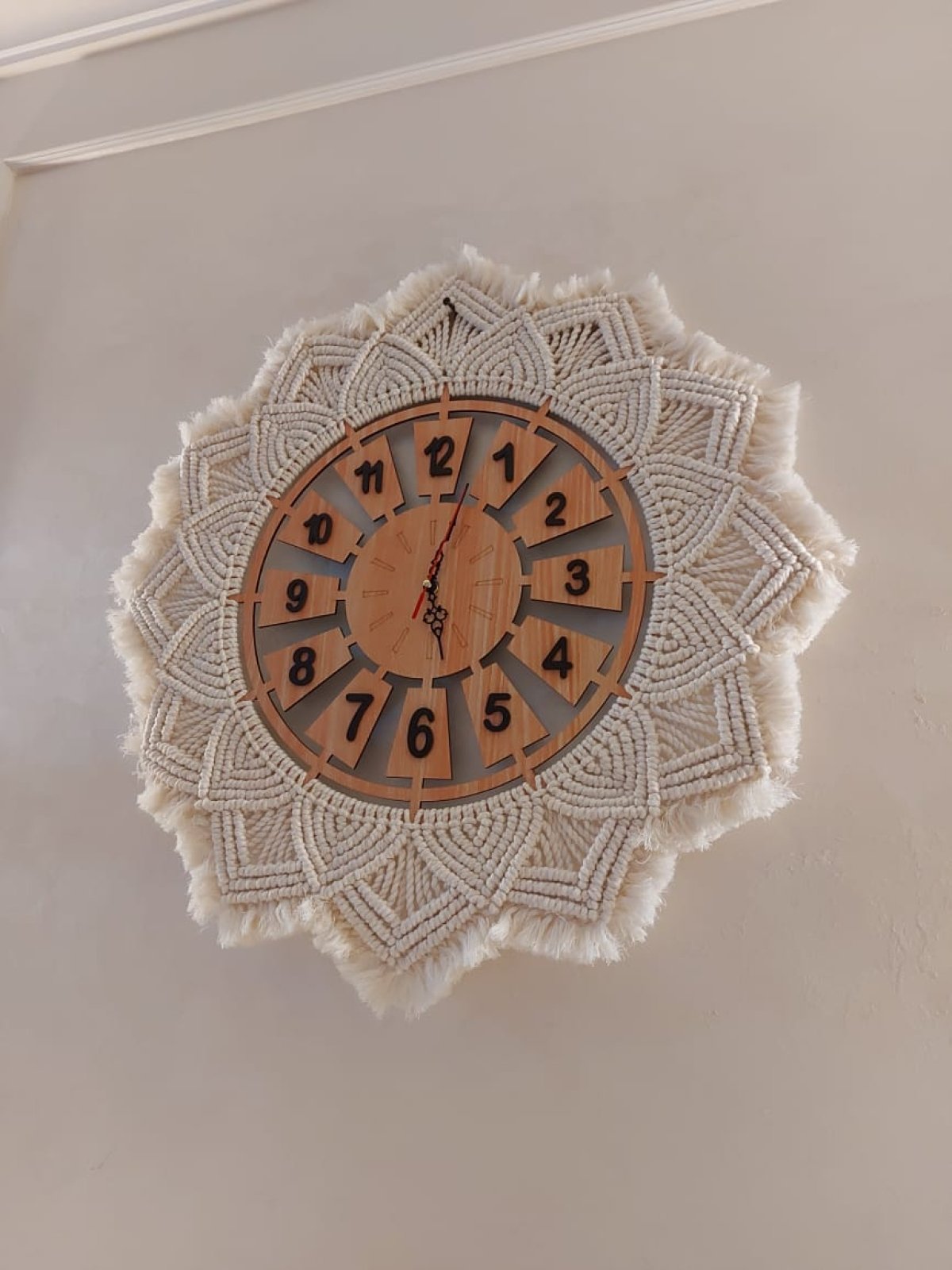 ساعة حائط بتصميم مميز بعقد المكرمية ديكور تحفه وعملية جدا مقاس الساعه ٤٠ سم والمقاس بالكامل ٦٠ سم