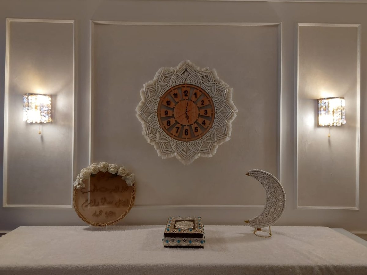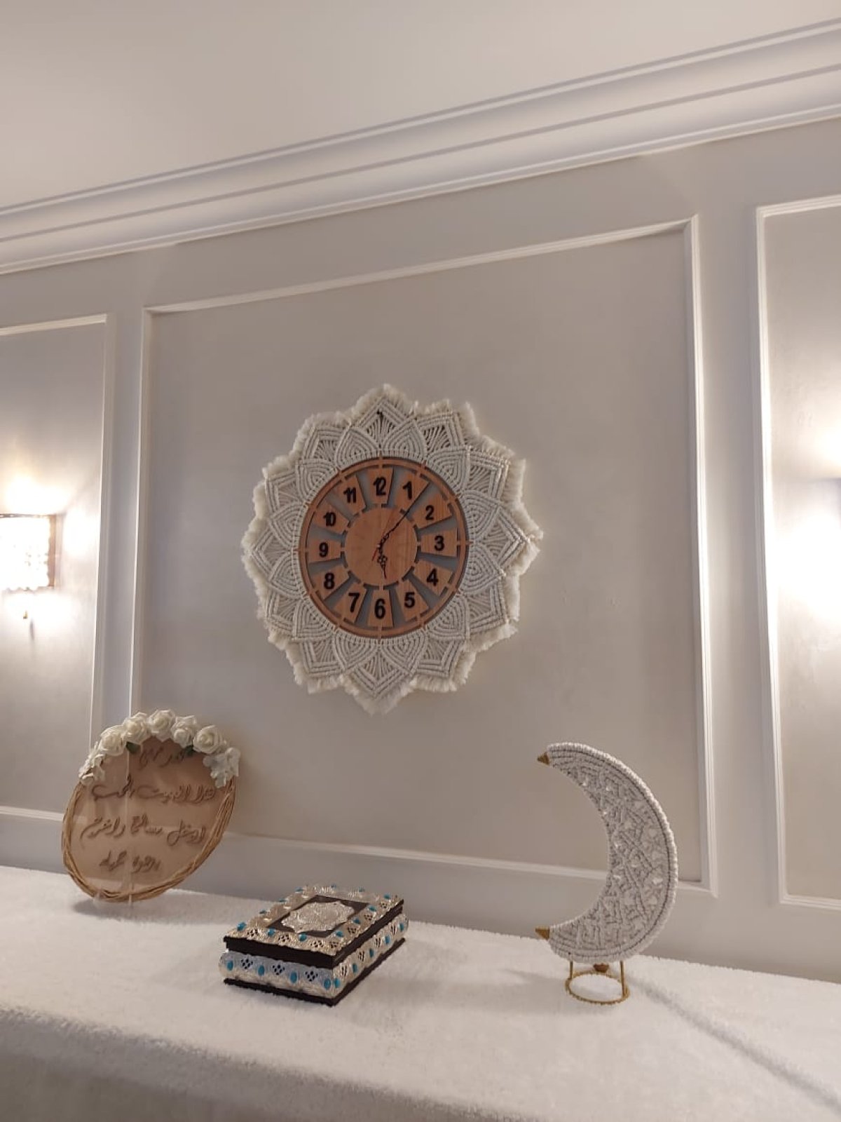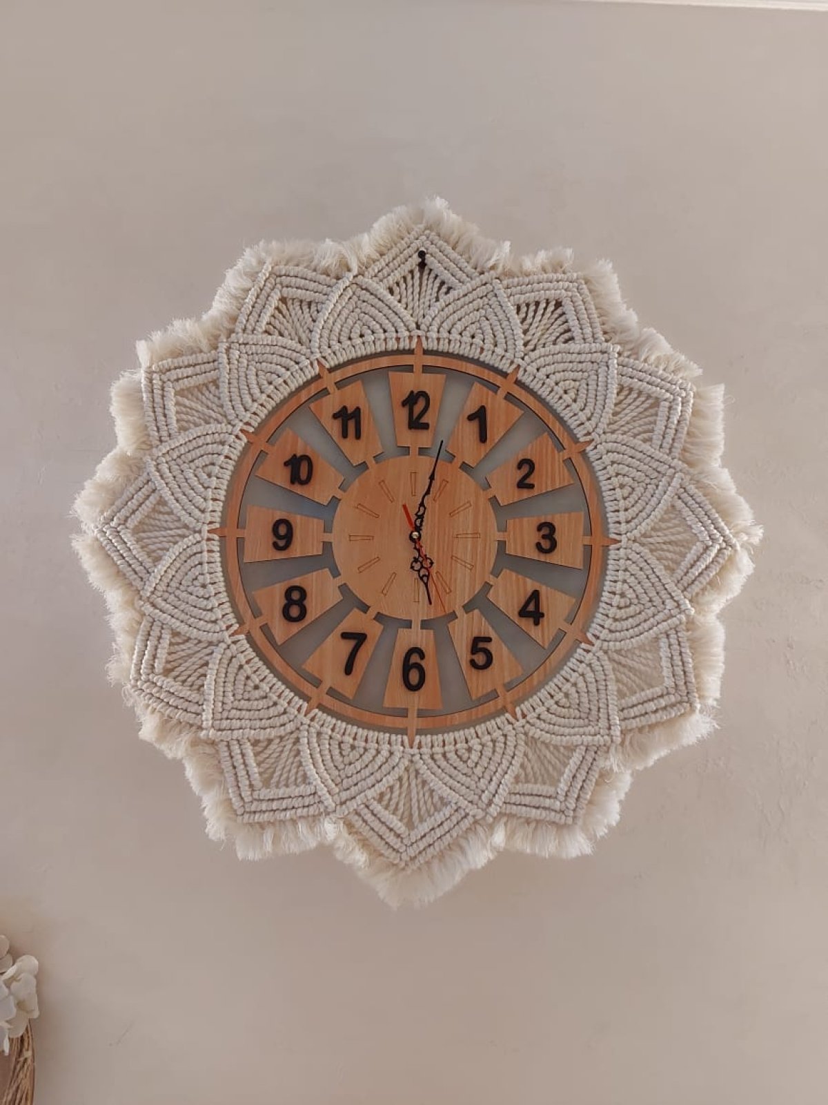 ساعة حائط بتصميم مميز بعقد المكرمية ديكور تحفه وعملية جدا مقاس الساعه ٤٠ سم والمقاس بالكامل ٦٠ سم