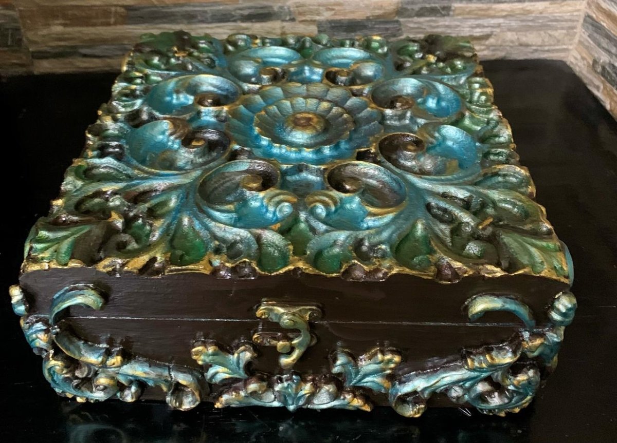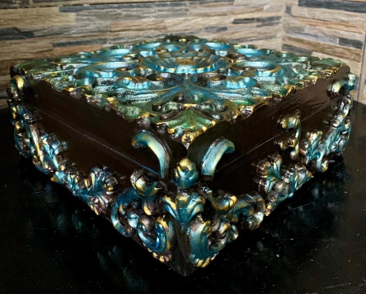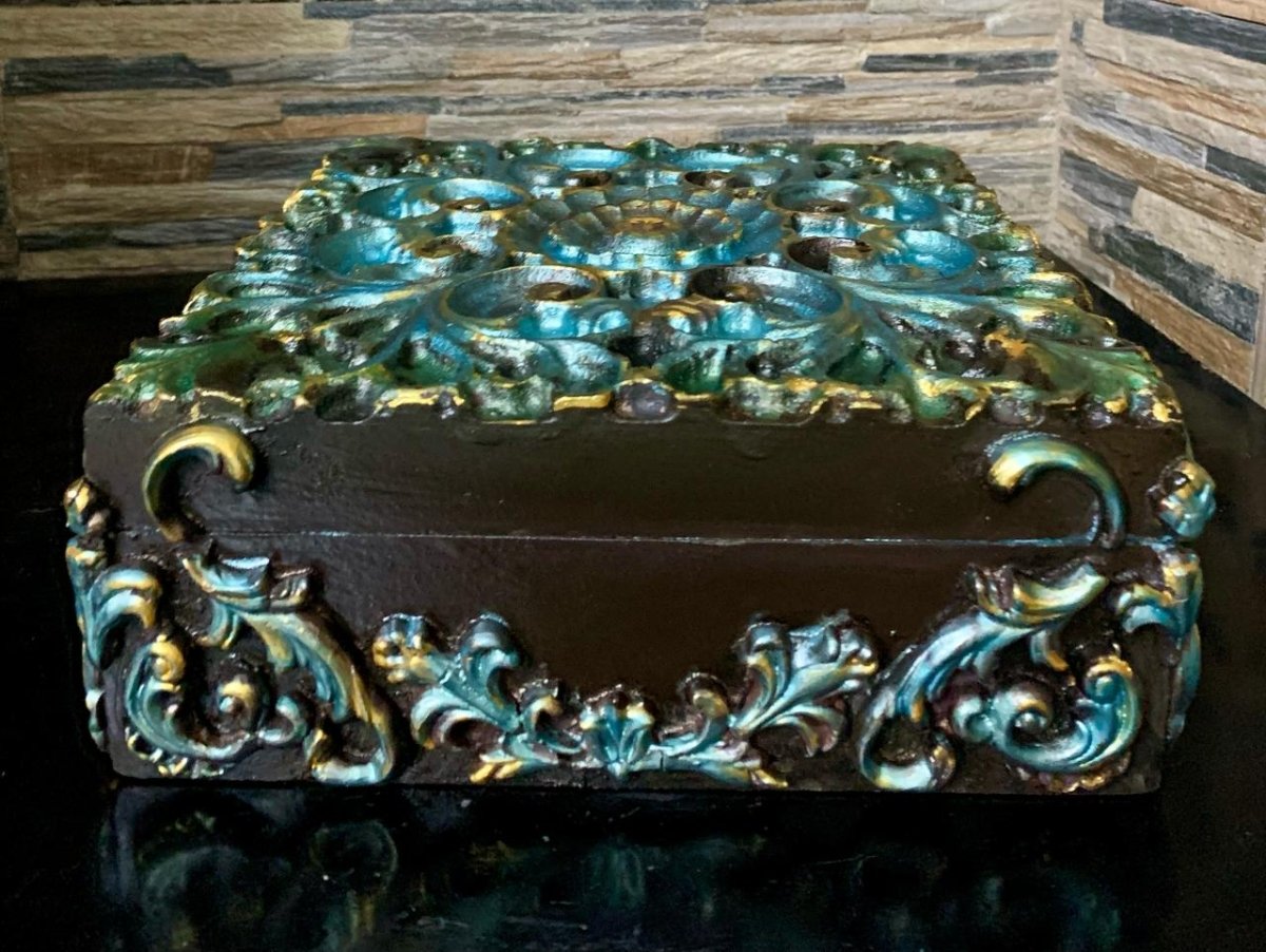 استمتعي بالأناقة الخالدة لصندوق المجوهرات هذا المصنوع يدويًا بتقنية الديكوباج، والمُزين بتفاصيل ذهبية باروكية معقدة على سطح أسود مزخرف. هذا المنظم الرائع مثالي لتخزين حُليكِ الثمينة، أو مجوهراتكِ، أو تذكاراتكِ. بفضل تصميمه المستوحى من الطراز القديم وحرفيته الفاخرة، يُضفي لمسةً رائعةً على ديكور منزلكِ أو هديةً مميزة.