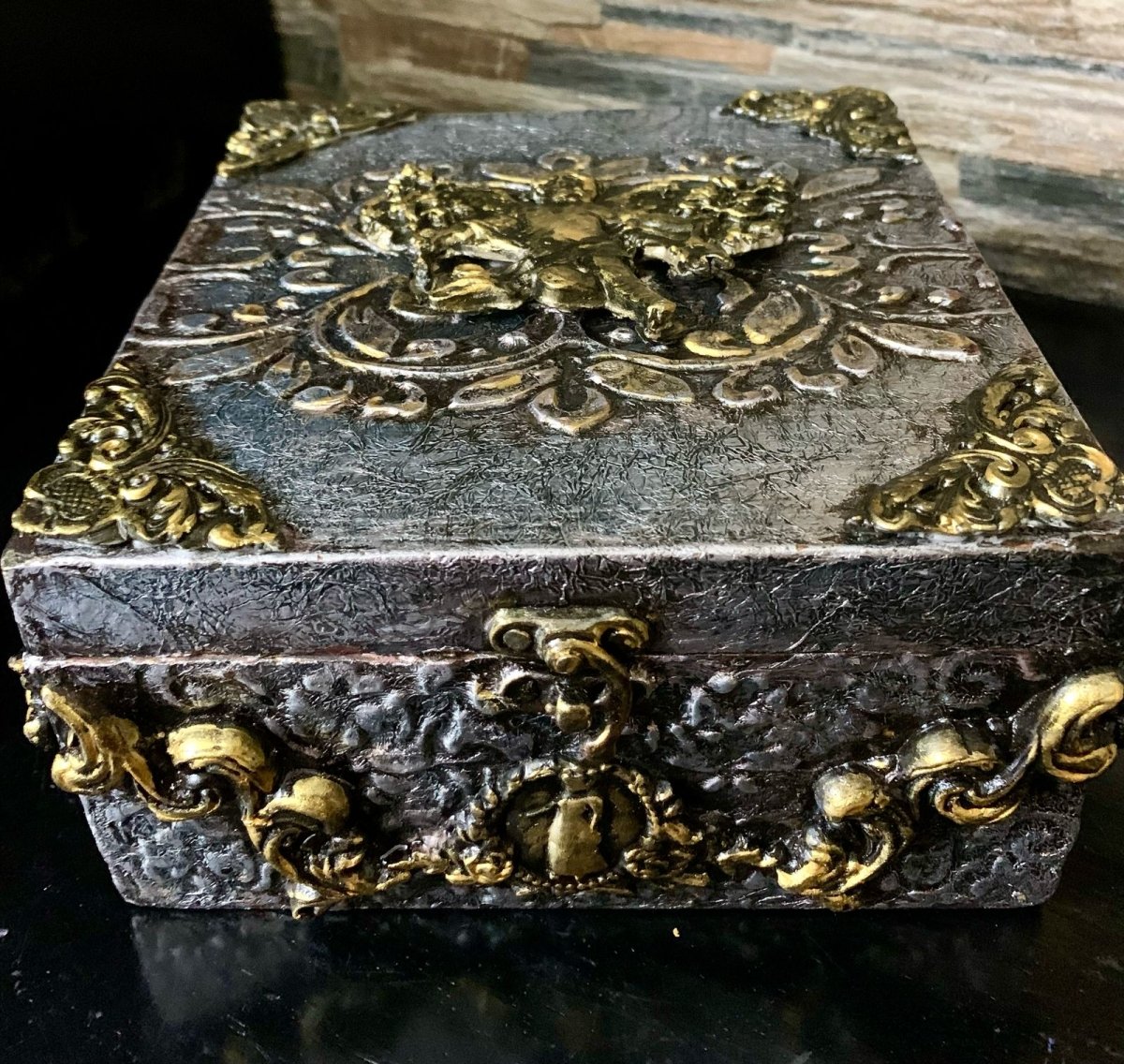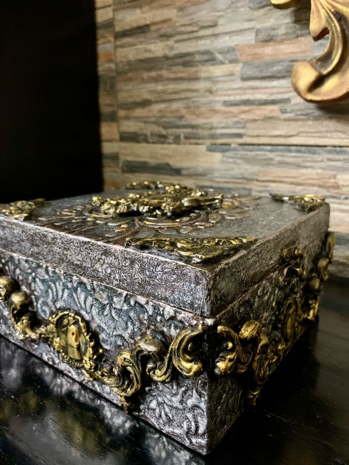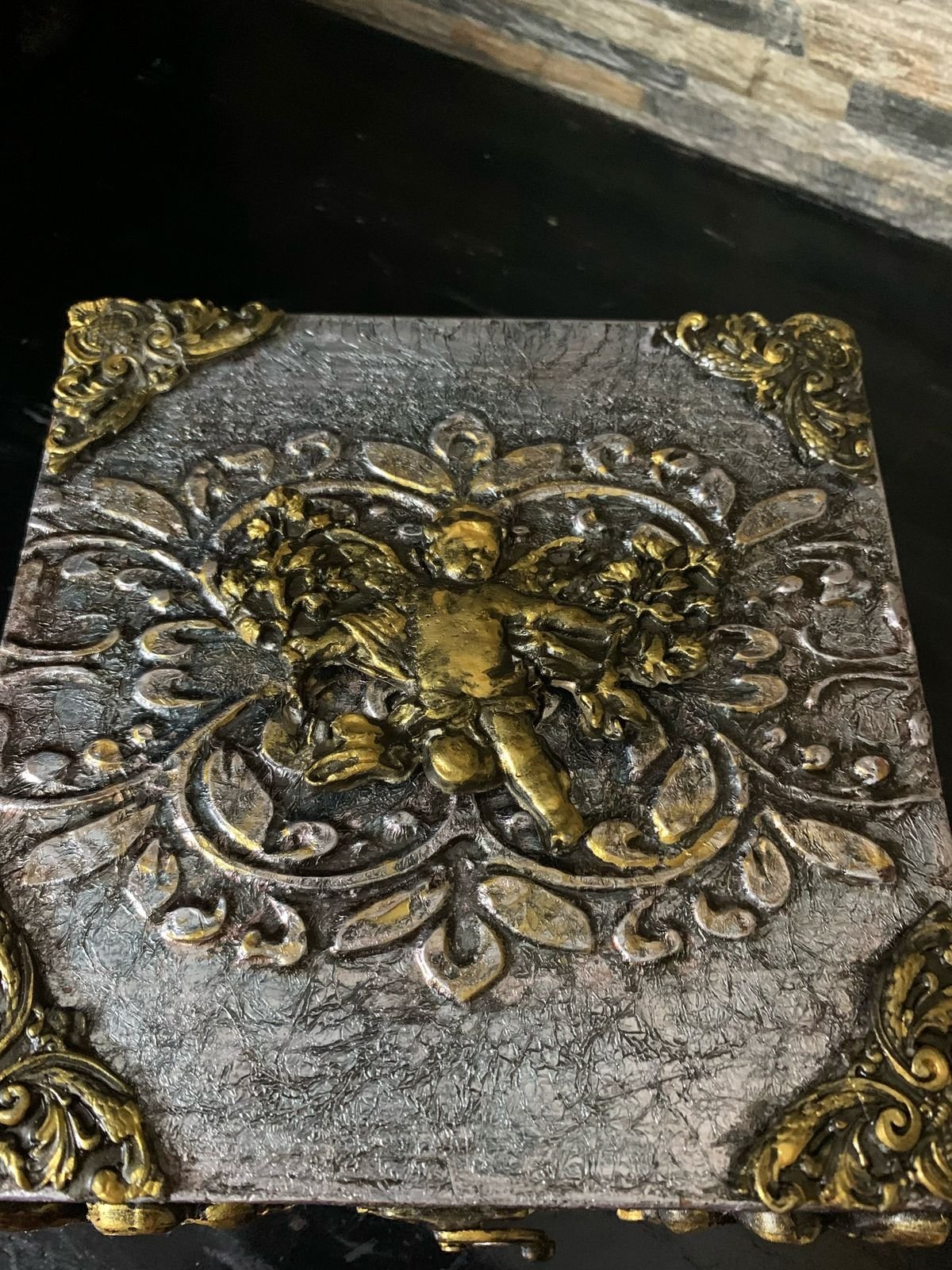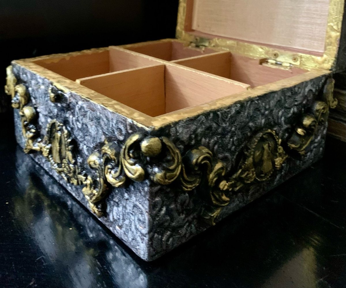 استمتعي بالأناقة الخالدة لصندوق المجوهرات هذا المصنوع يدويًا بتقنية الديكوباج، والمُزين بتفاصيل ذهبية باروكية معقدة على سطح أسود مزخرف. هذا المنظم الرائع مثالي لتخزين حُليكِ الثمينة، أو مجوهراتكِ، أو تذكاراتكِ. بفضل تصميمه المستوحى من الطراز القديم وحرفيته الفاخرة، يُضفي لمسةً رائعةً على ديكور منزلكِ أو هديةً مميزة.