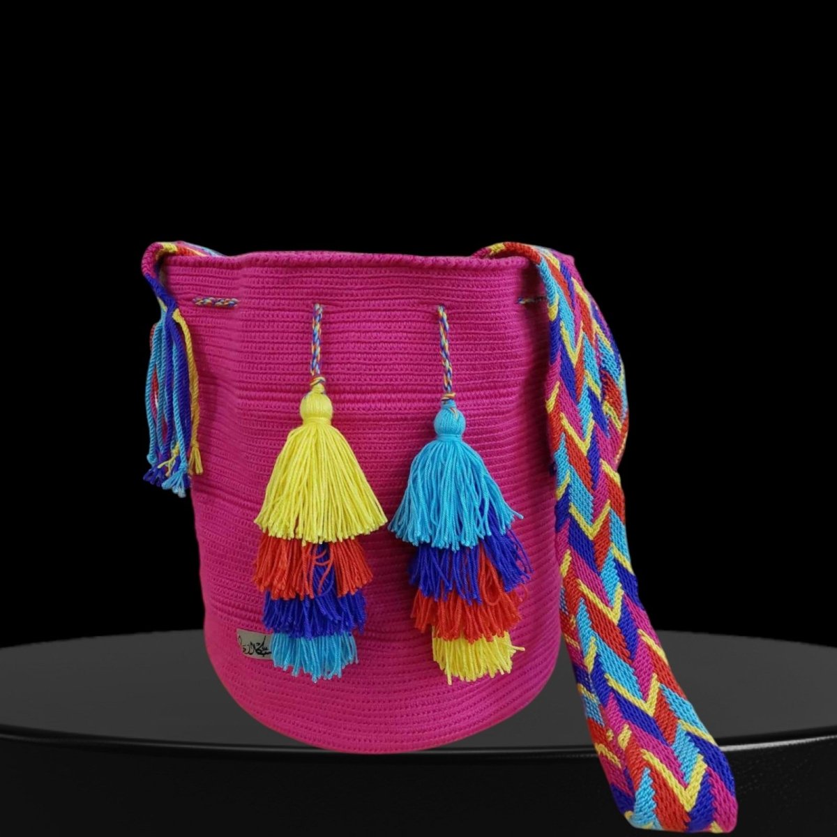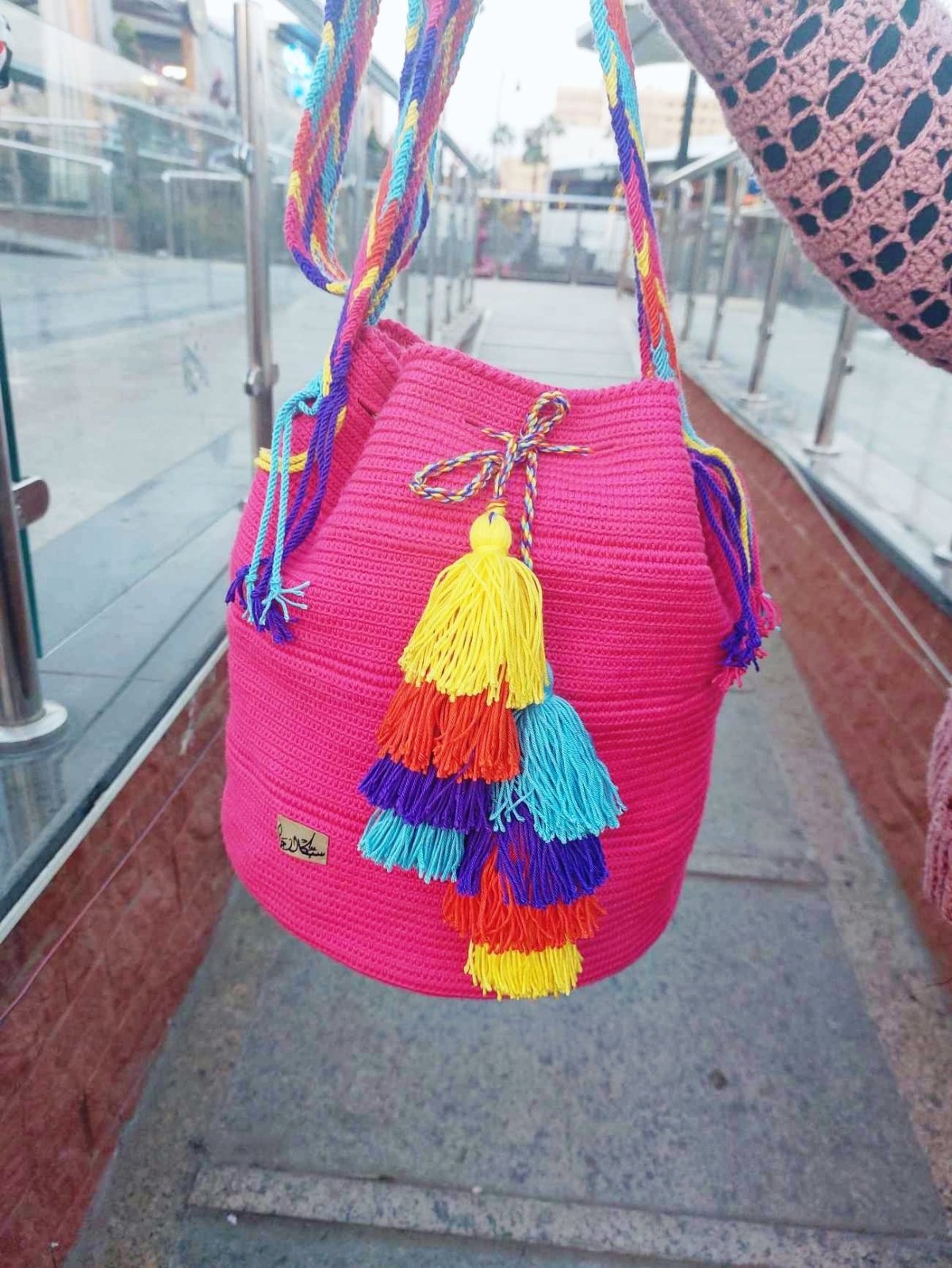 حقيبة موتشيلا 100% صناعة يدوية الطول 30 سم وقطر القاعدة 25 سم الخامة: خيط اكريليك ملمس القطن بألوان ثابته وزاهيه وضد الوبرة يمكنك تخصيص الألوان والحجم