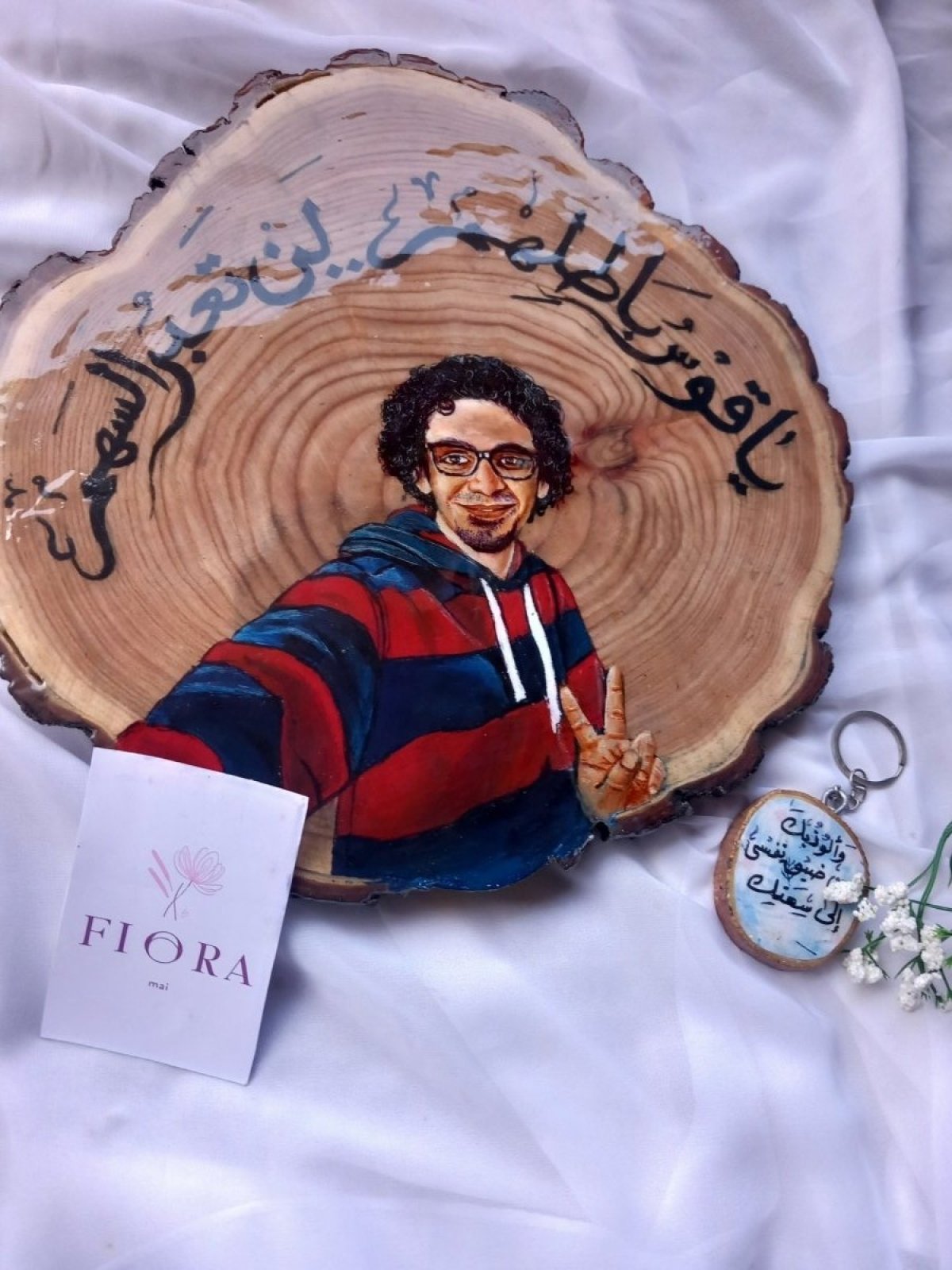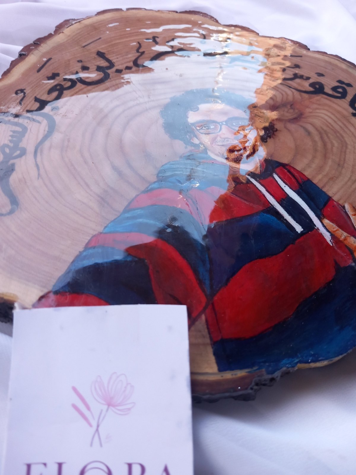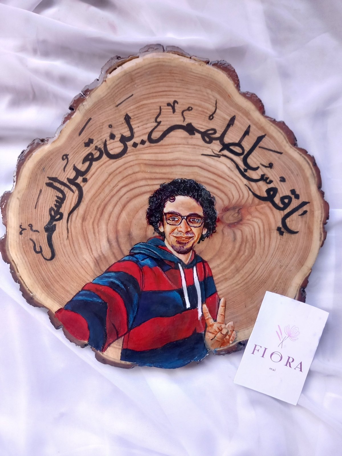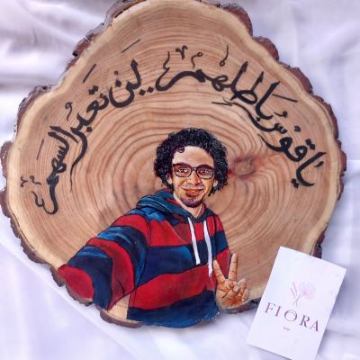>رسمة احترافية بالوان الاكريليك على جزع شجر بالإضافة إلى مادة الايبوكسي واستاند خشب مميز بالاسم والتغليف