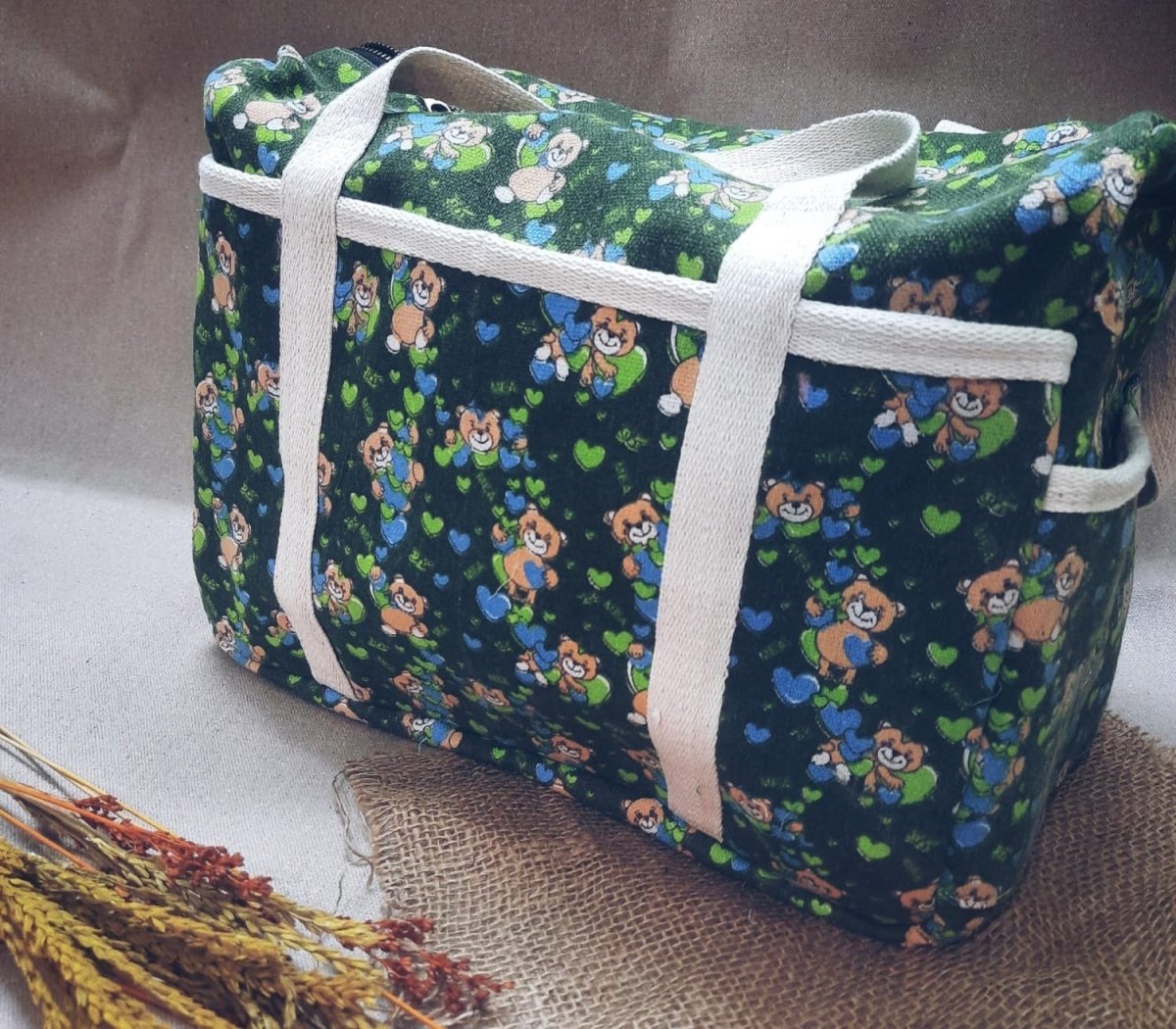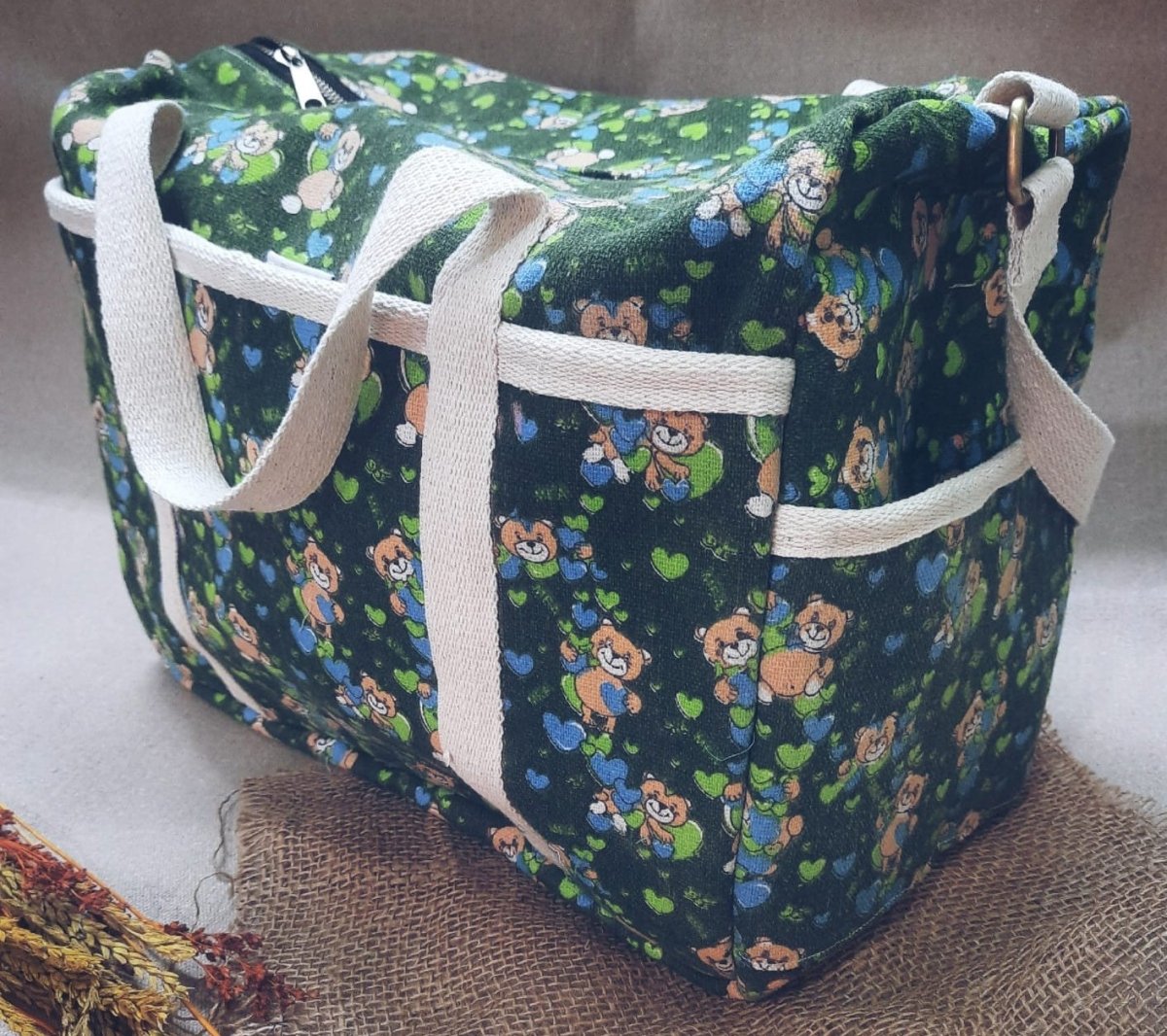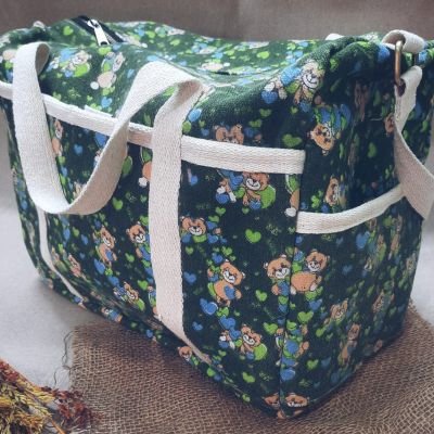 شنطة من قماش الدك ، بها 2 جيب جانبى و3 جيوب أمامية ، وسوستة داخلية بيد قصيرة ويد طويلة مقاس 40*42