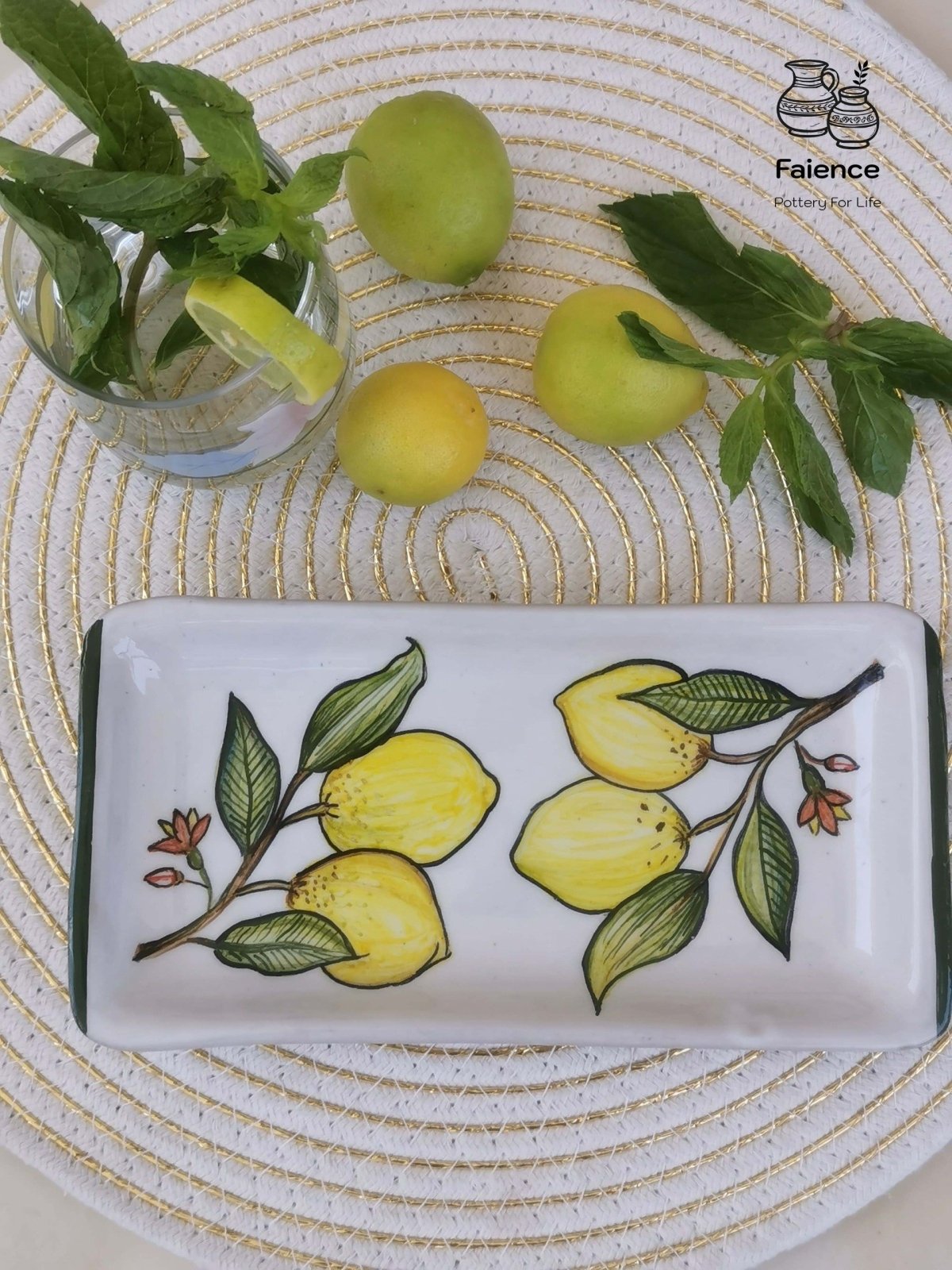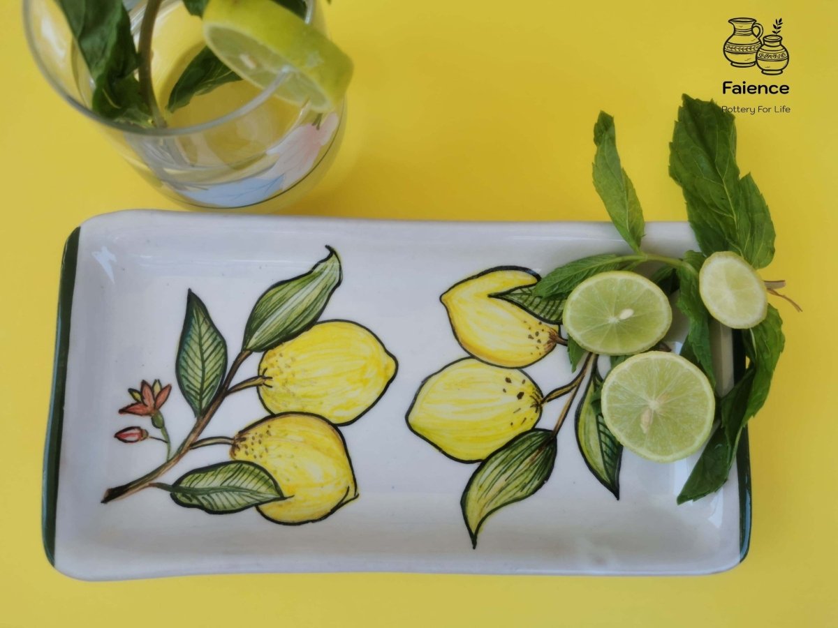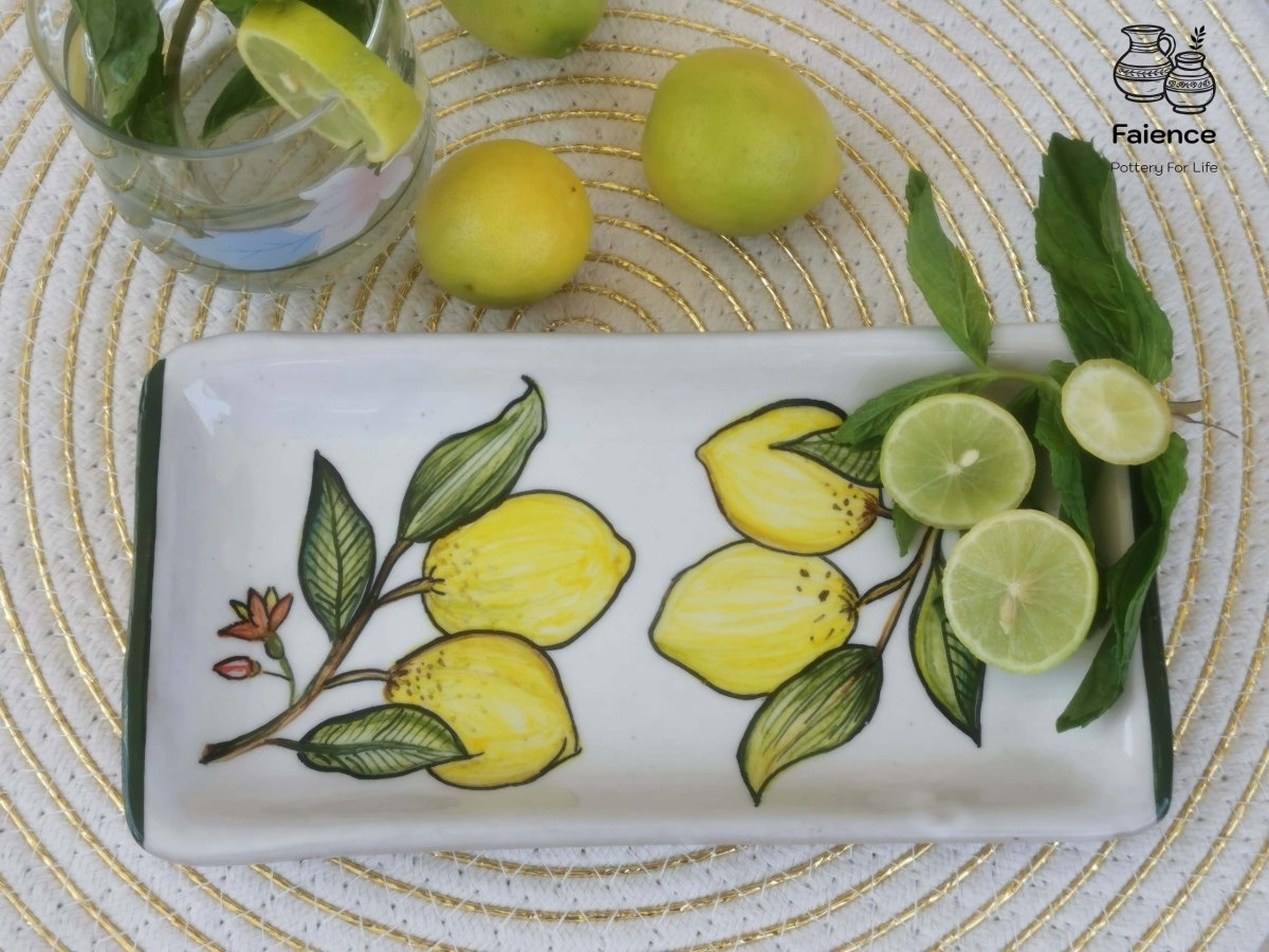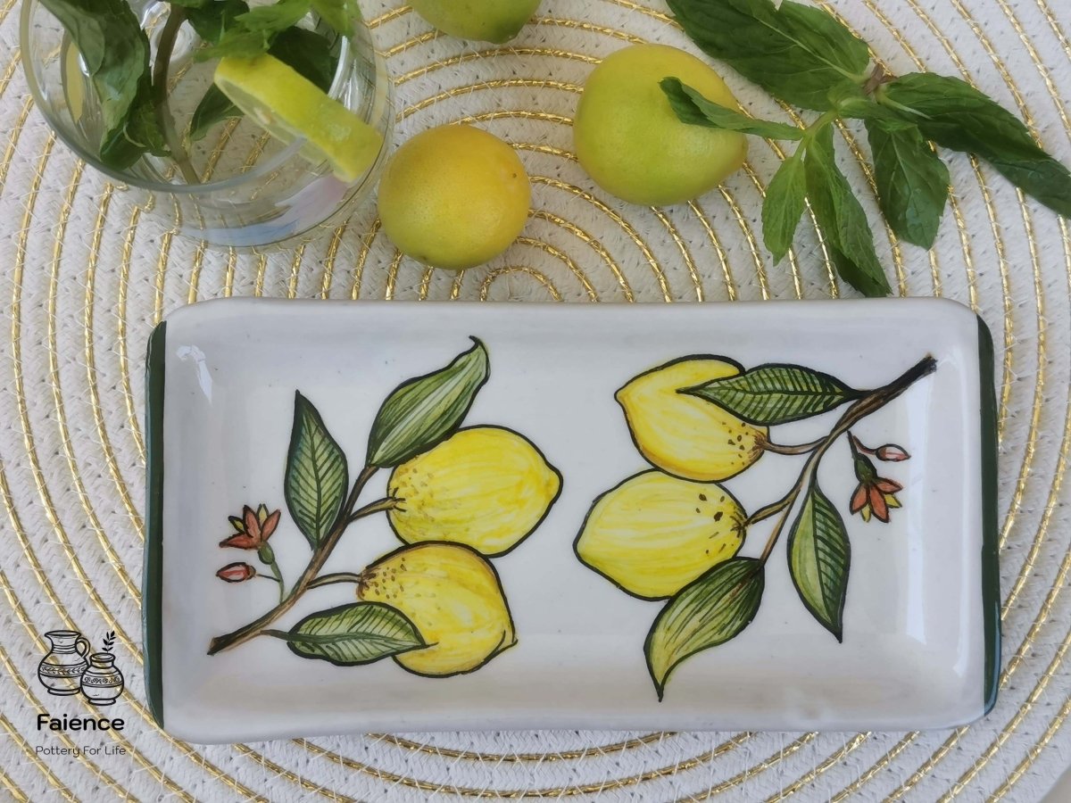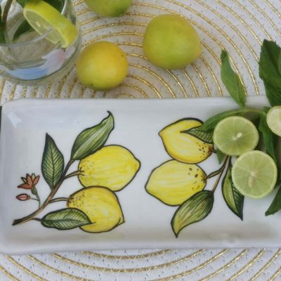 طبق خزفى مستطيل الشكل مقاس 10×21 مزخرف بثمار الليمون تم صناعته فى أفران خاصة تضمن ثبات الطبقة اللونية، والطبق قابل للاستخدام اليومى فى الطعام ويمكن تنظيفه بالمنظفات دون أى تأثير على لمعان الألوان كما يمكن دخوله للميكرويف