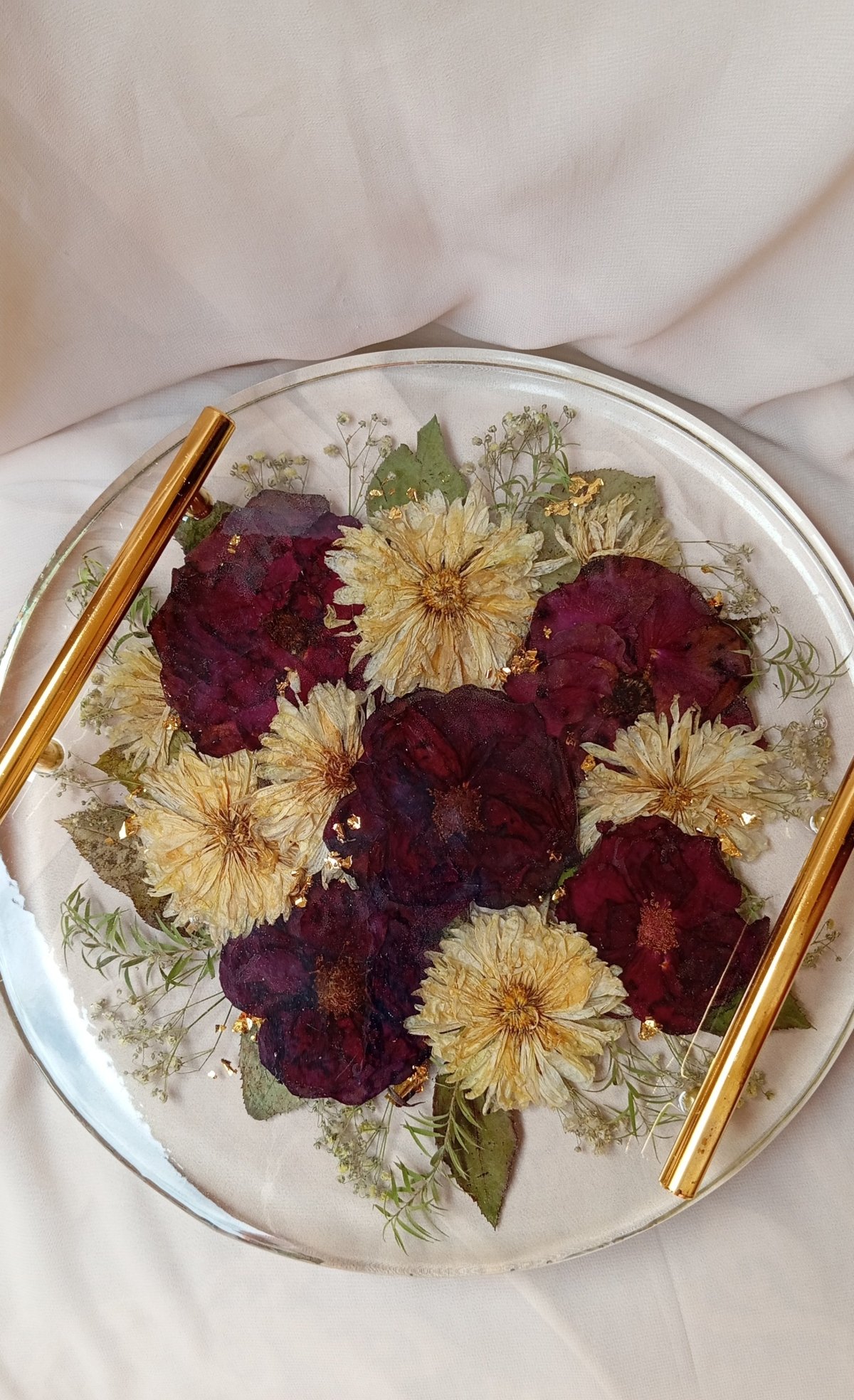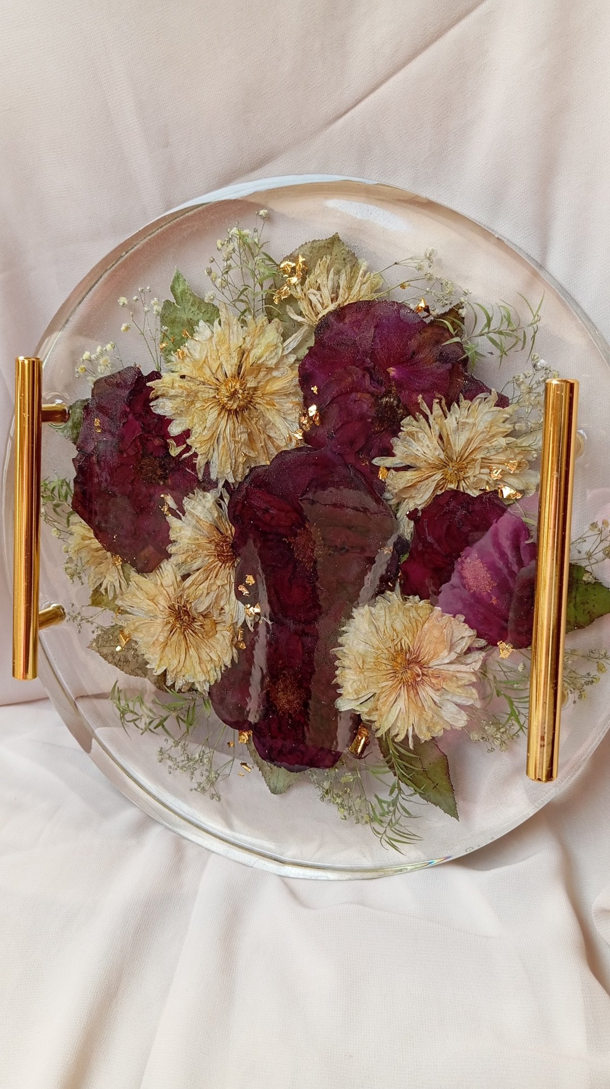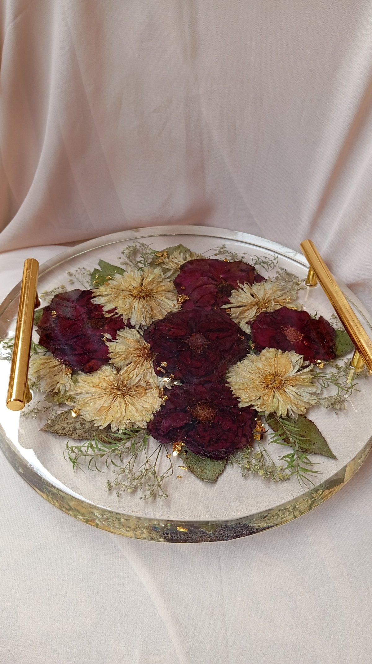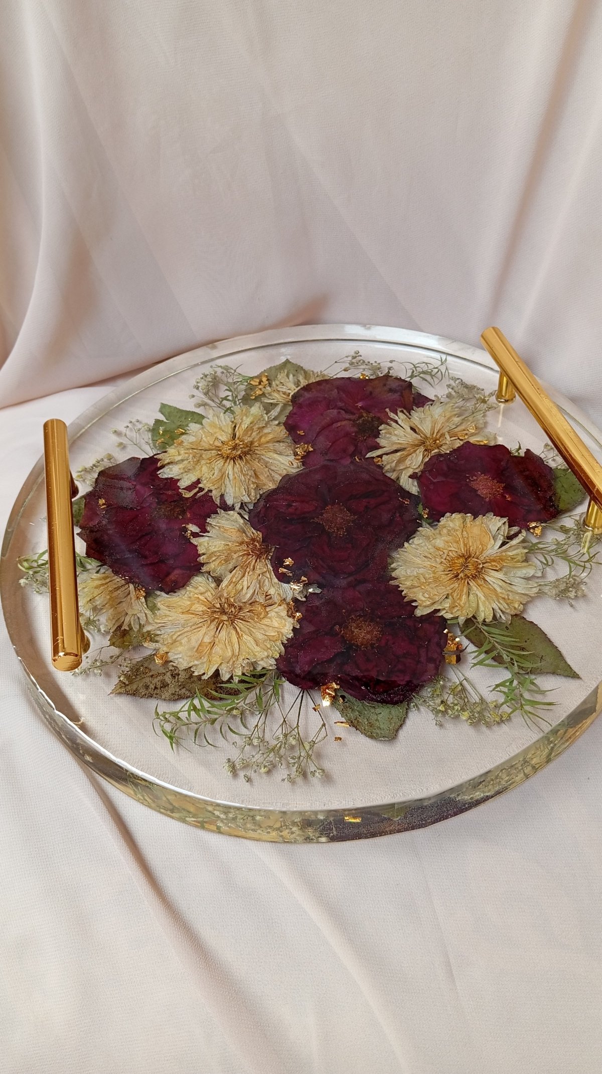 صنية ريزن مقاس 30 سم ارتفاع الصنيه 3 سم ورق ذهب مقابض ذهبيه ورد طبيعى مجفف