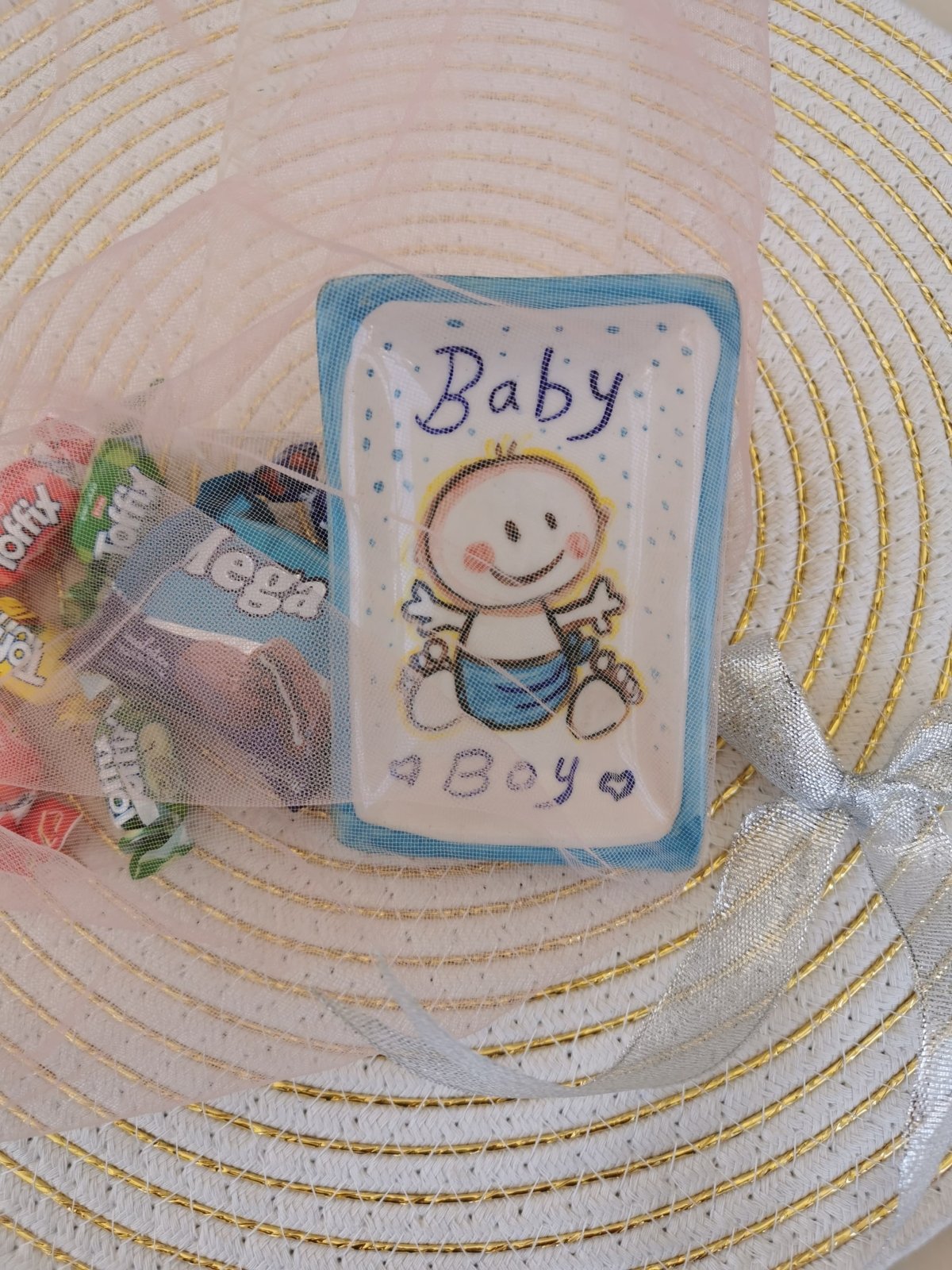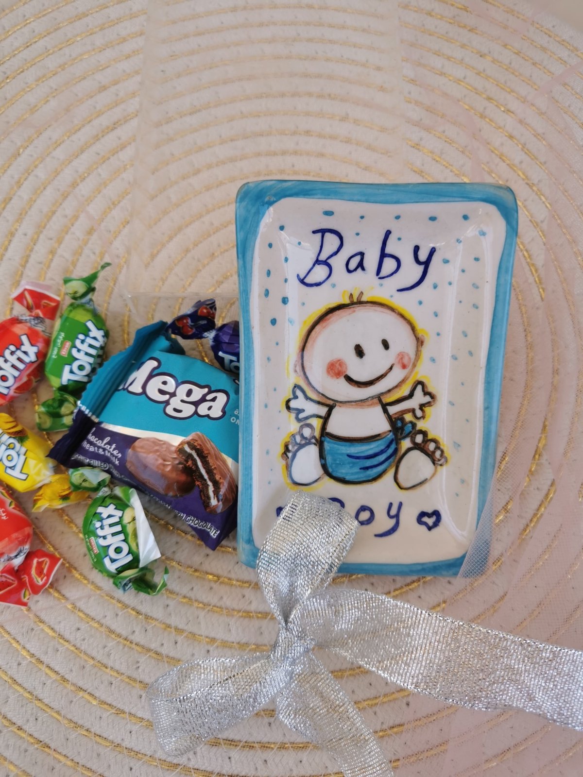 طبق خزفى مستطيل الشكل بأبعاد 11×8 سم مصنوع ومرسوم يدويا، يصلح لتوزيعات السبوع ومتاح إضافة اسم المولود وتاريخ الميلاد، تم صناعته فى أفران خاصة بطلاءات زجاجية ملونة وثابتة، صحى وآمن لوضع حلوى السبوع