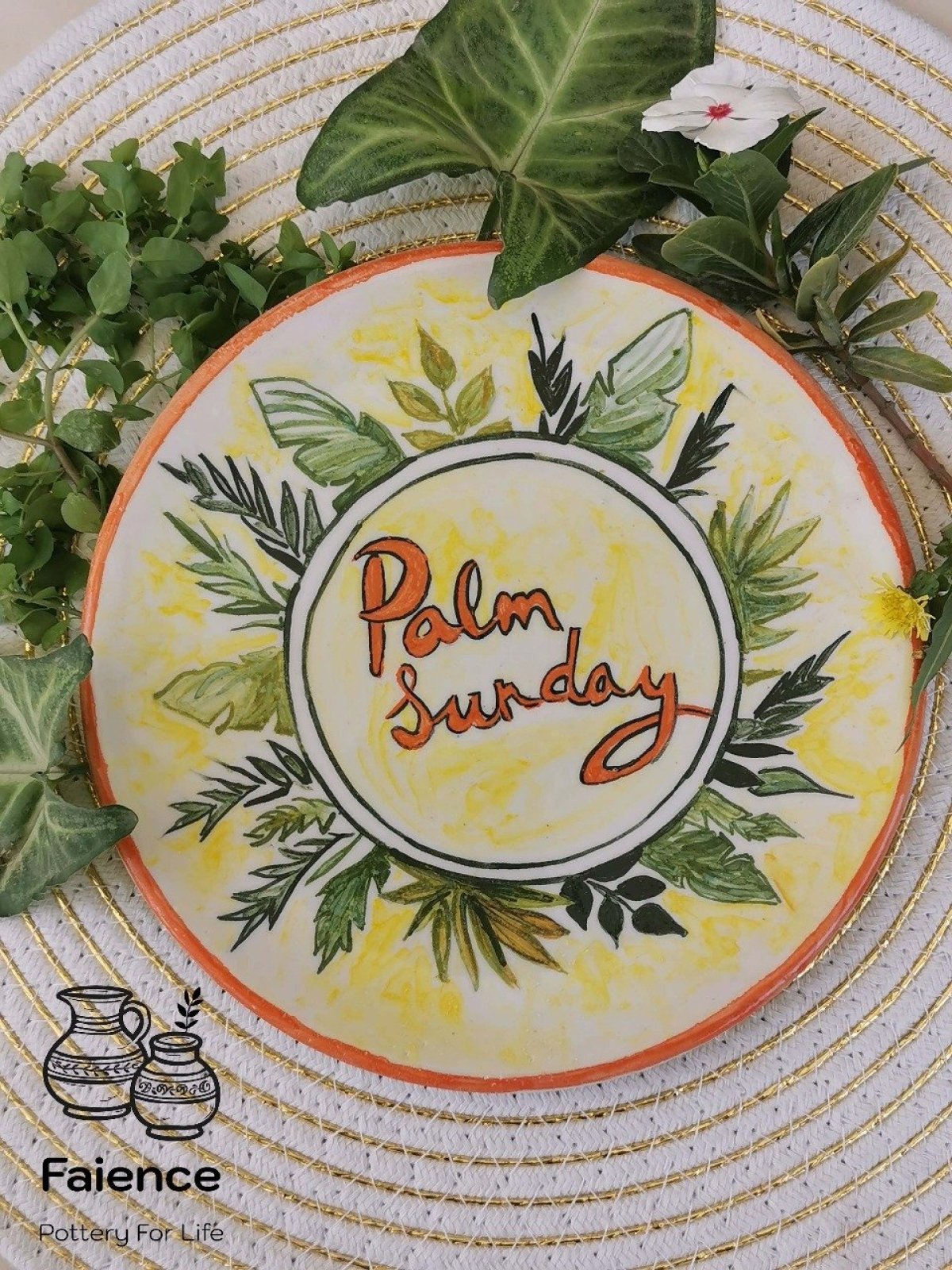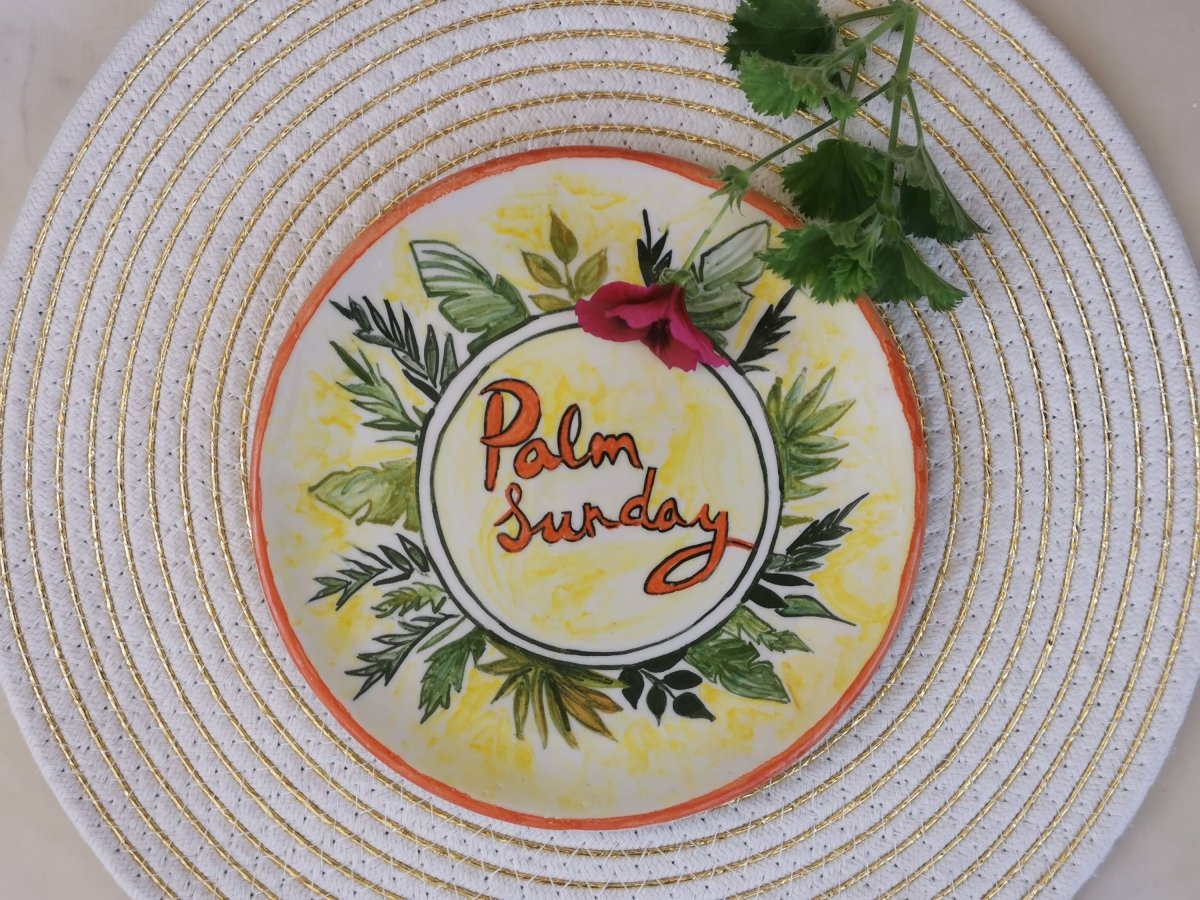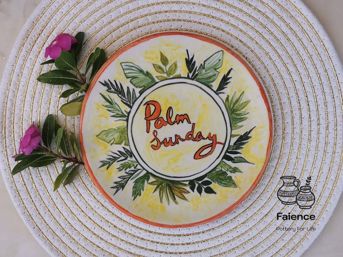 طبق خزفى دائري الشكل قطر 20 سم مصنوع ومرسوم يدويا، للتهنئة بعيد أحد السعف، تم صناعته فى أفران خزفية على درجات حرارة عالية تضمن ثبات الطبقة اللونية، صحى وآمن للاستخدام فى الطعام، أو التعليق كديكور، ويمكن تنظيفه بالمنظفات دون أى تأثير على بريق ولمعان الألوان كما يمكن دخوله للميكرويف