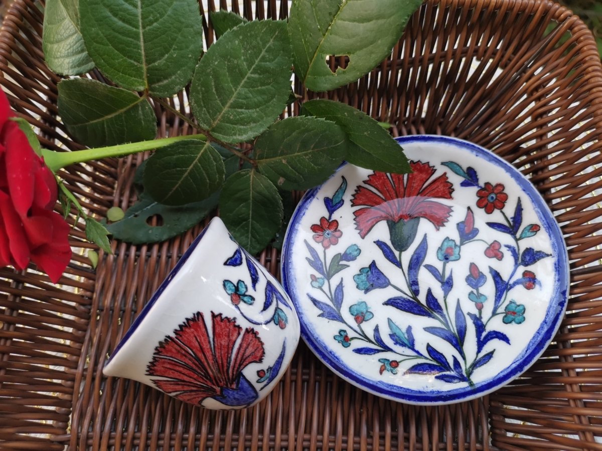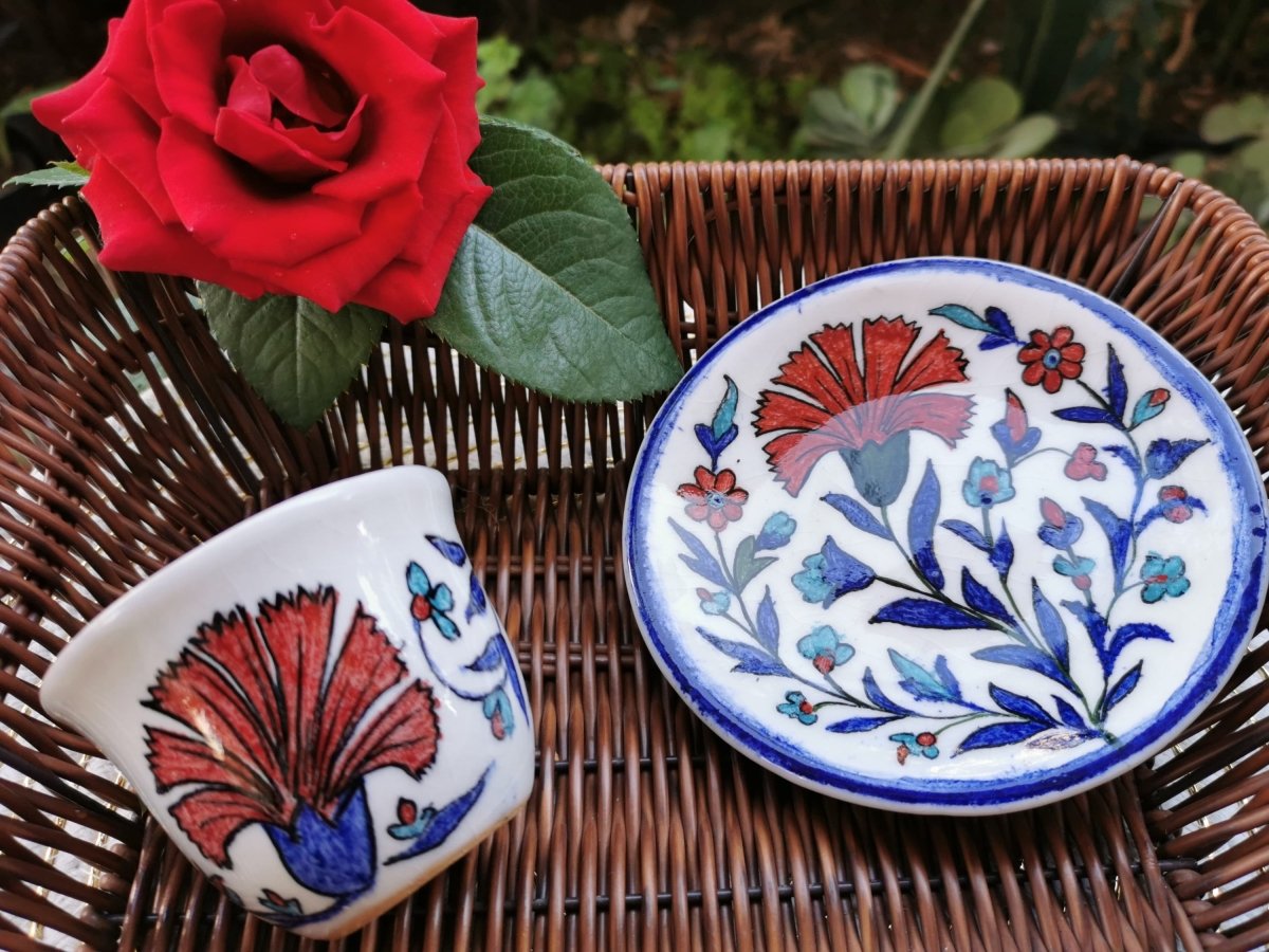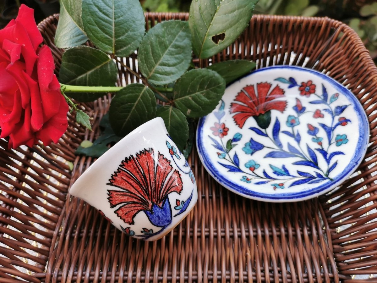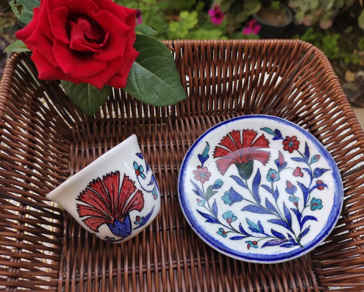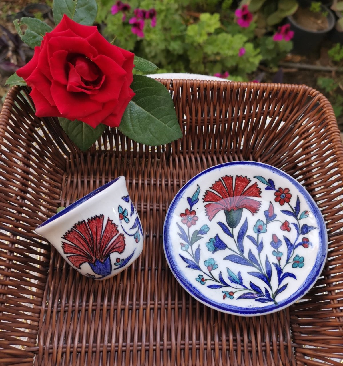 فنجان قهوة مع الطبق مرسوم يدويا ومزين بزهرة القرنفل، ومستوحى من الزخرفة الاسلامية، الفنجان سعة 100 مل، مصنوع فى أفران خاصة على درجة حرارة مرتفعة تضمن ثبات الألوان، صحى وآمن للشرب، يمكن تنظيفه بالمنظفات دون أى تأثير على بريق ولمعان الألوان ، كما يمكن دخوله للميكرويف