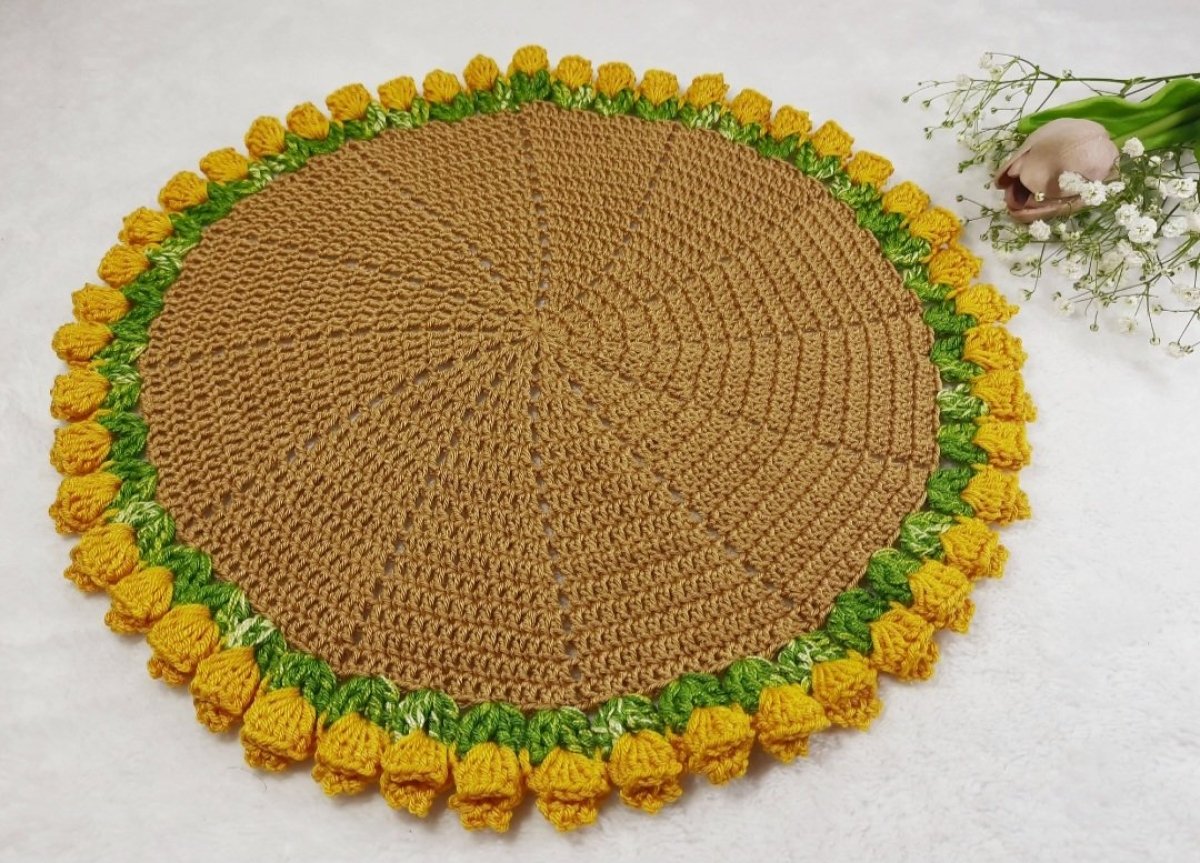 المفرش مشغول من خيط قطن ١٠٠% قطر المفرش ٣٠ سم ممكن استخدامة كمفرش او كوستر للسفرة واذا اطلب تنفيذه بحجم كبير ممكن يكون ثرو على الكنبة كديكور لطيف . او مفرش كبير . متاح تنفيذ المفرش او الورد باى لون او مقاس حسب الطلب ومتاح عمل المفرش بورد الجورى .