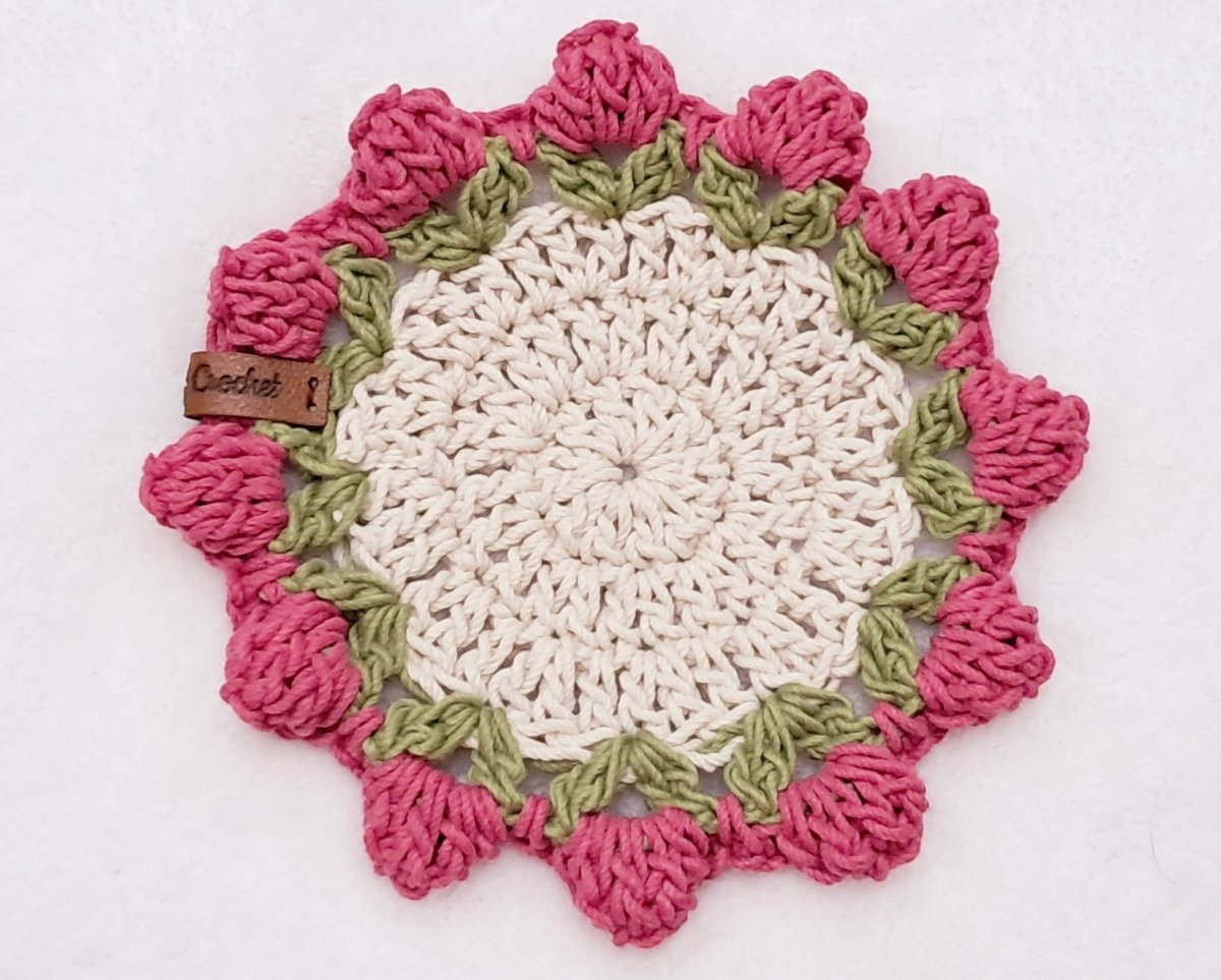 الكوستر مشغول بخيط قطن . مقاس قطر الكوستر ١٥ سم ومتاح تنفيذة بأى مقاس او لون للكوستر او الورد .