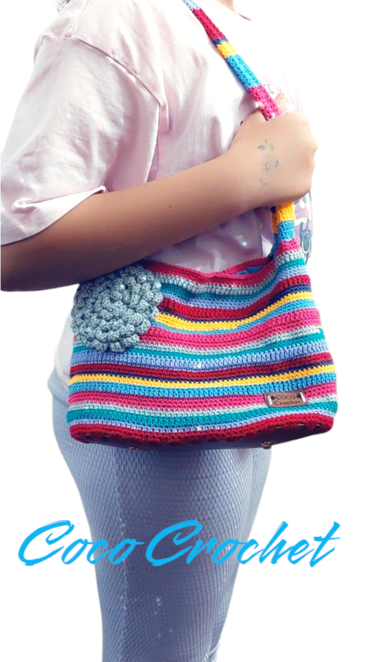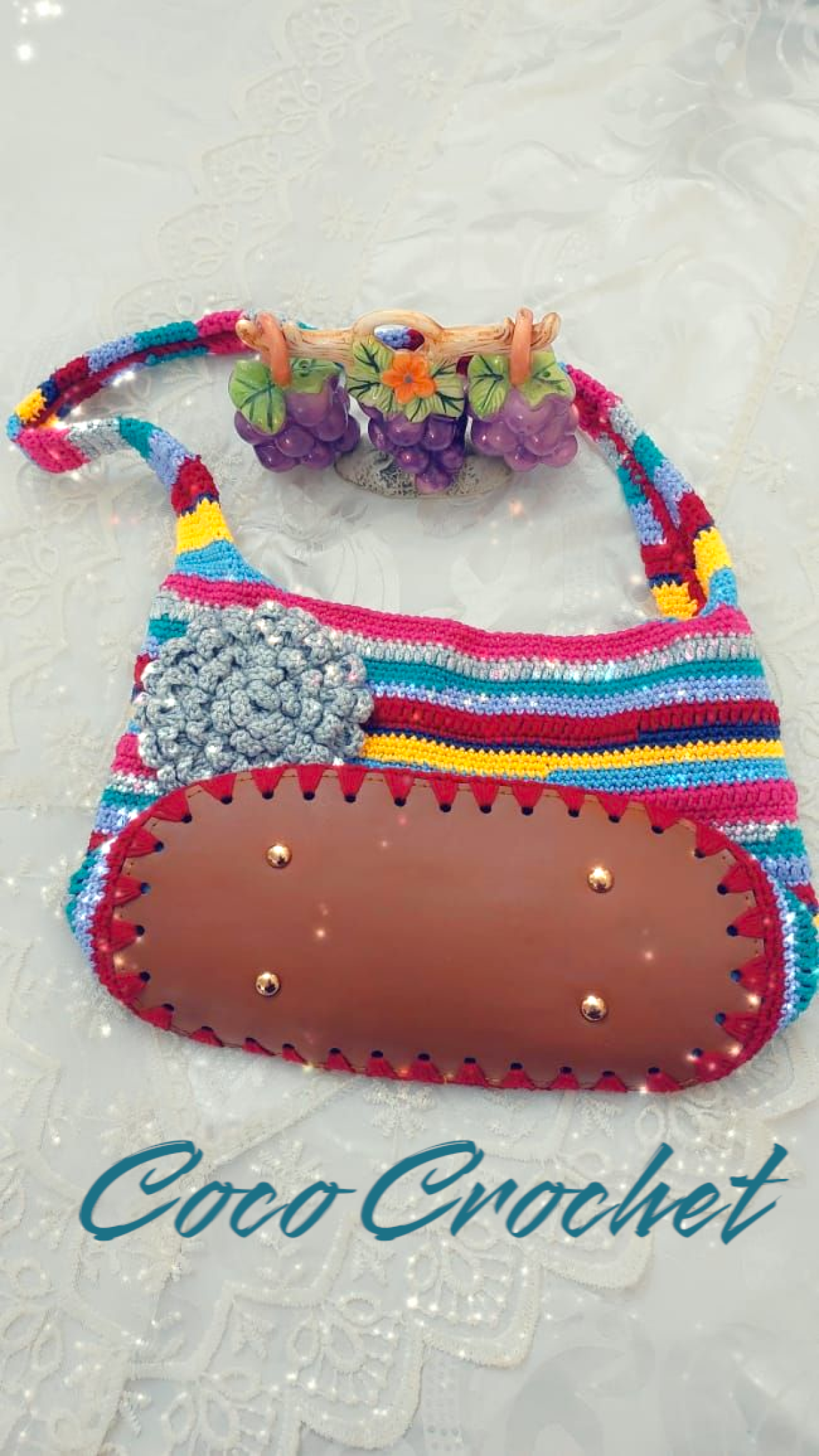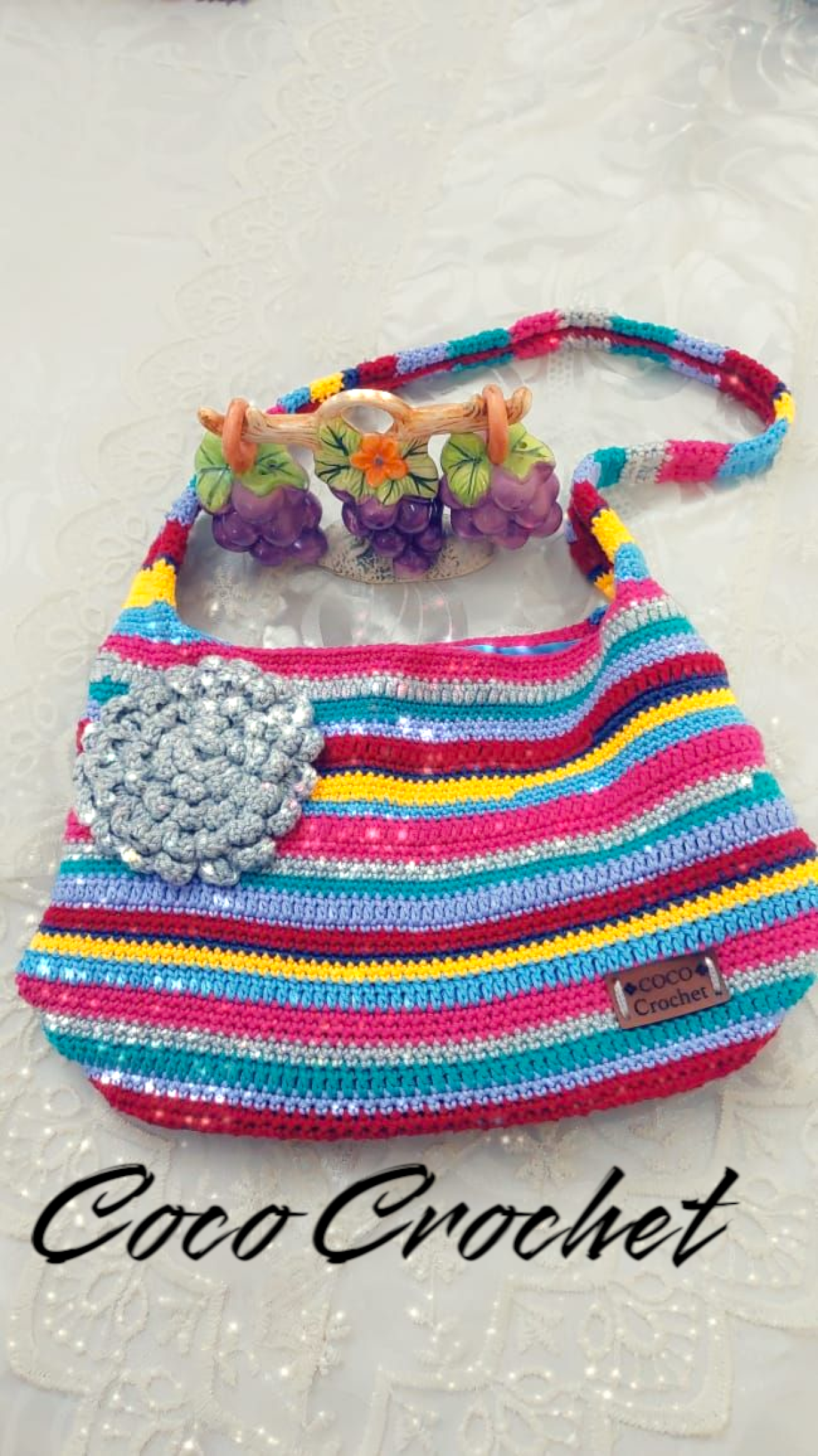 شنطة كروشيه مميزة و مبهجة جداا صناعة يدوي من خيوط قطن ناعمة وبطانه ستان متاح قطعه واحدة مقاسها ١٩ × ٣٠ سم