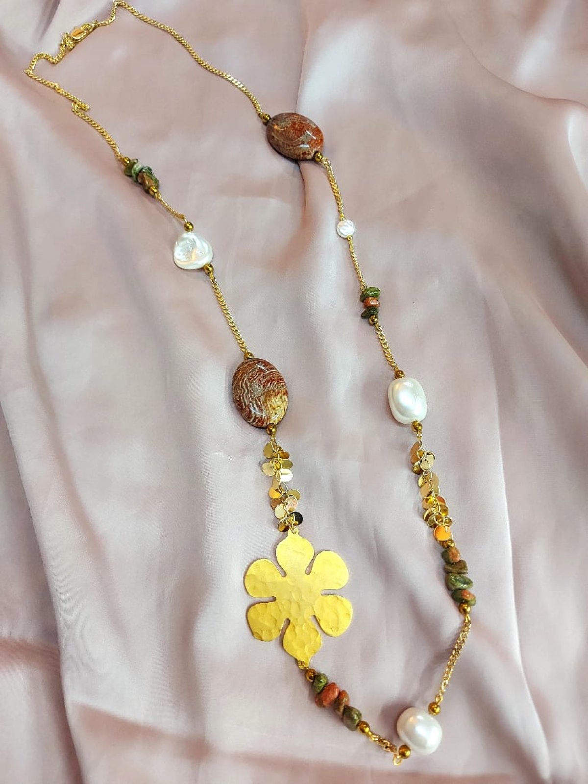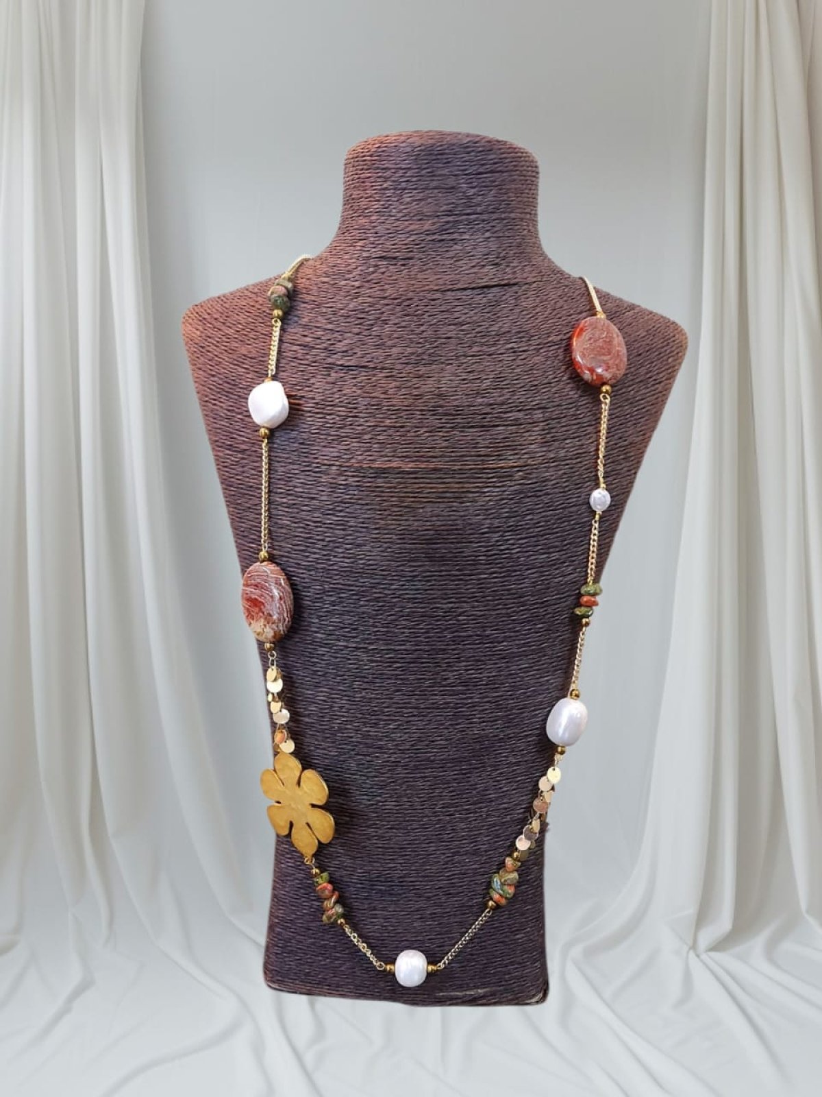عقد طويل من احجار العقيق والجاسبر واللولى الشل بيرل بدلايه نحاس بيور مطلى دهب وسلاسل دهب صينى جولد