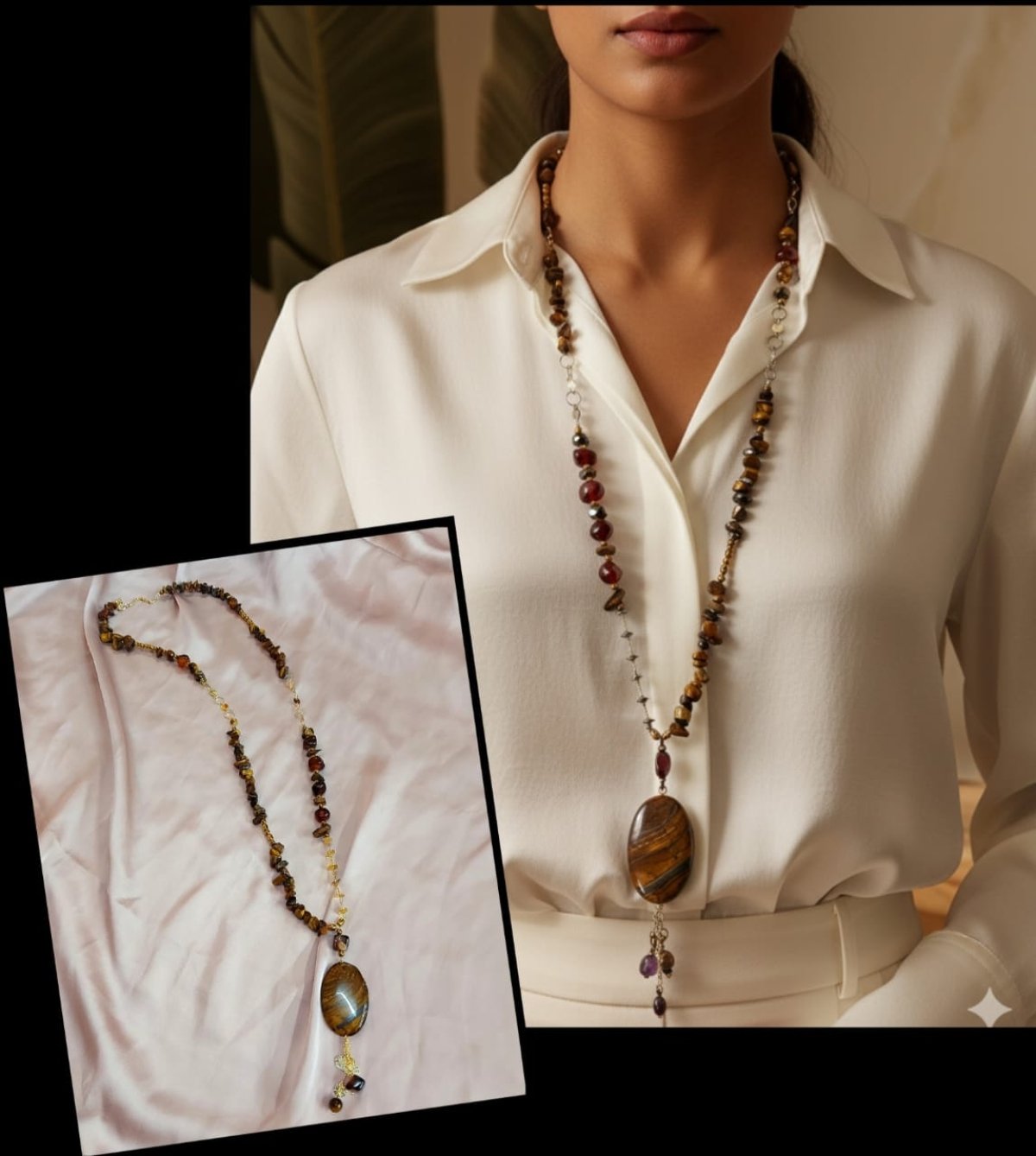 عقد ديزاين طويل من احجار العقيق وتايجر آى عين النمر وفواصل هيماتيت والسلاسل والحلقات والاقفال دهب صينى جولد مش بتغير لون متاح اى طول ومتاح عمل انسيال وحلق بنفس الديزاين بنفس الحجر