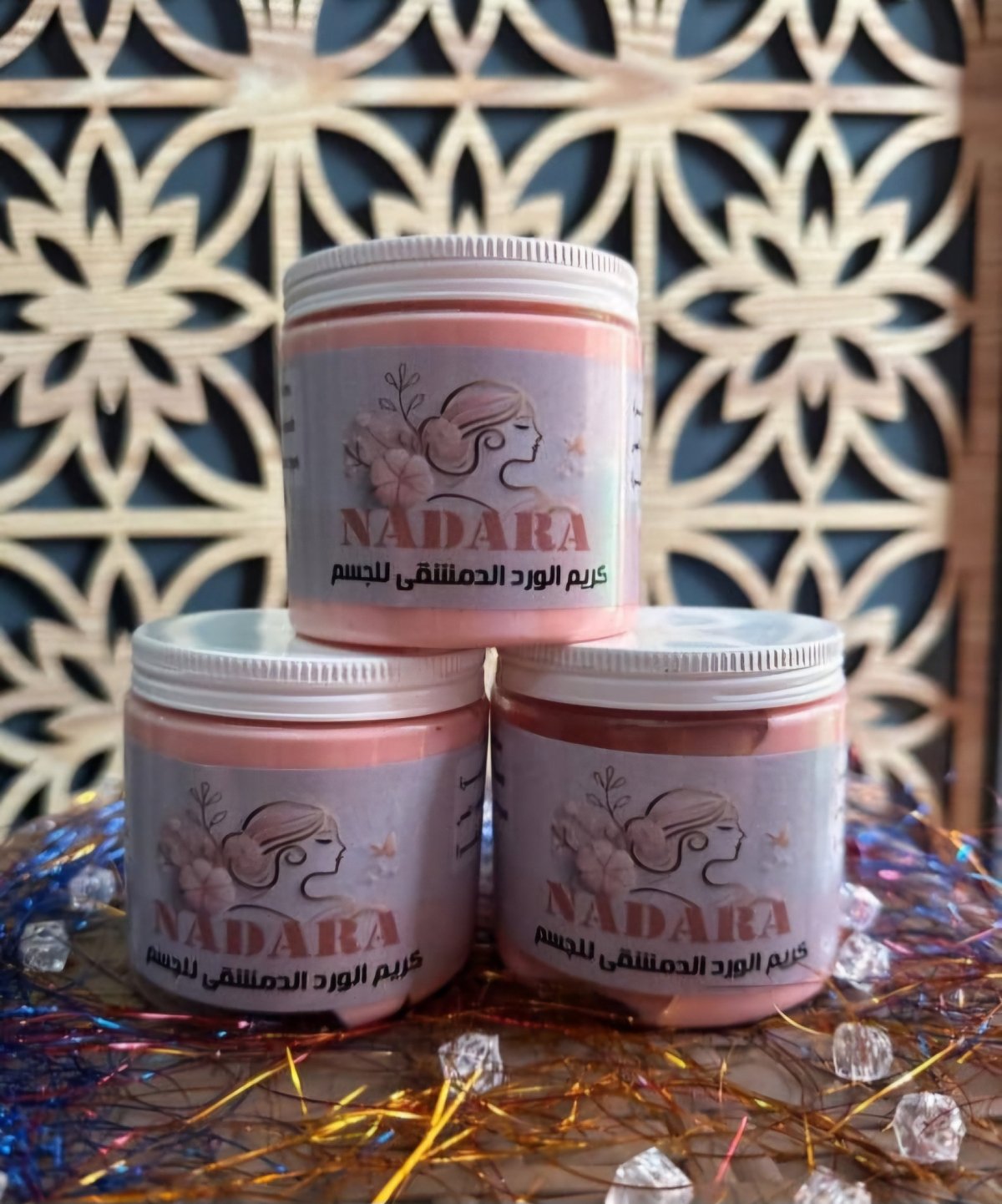 كريم الجسم بالورد الدمشقي (لوشن الجسم) الوزن 200 جرام مكوناته: مجموعة من الزيوت الطبيعية مثل زيت الجوجوبا، زيت اللوز، زيت الزيتون، زيت السمسم، زبدة الشيا، زيت الورد، مستحلبات تعمل على ترطيب الجسم وتفتيحه وتتركه ناعما عند اللمس.