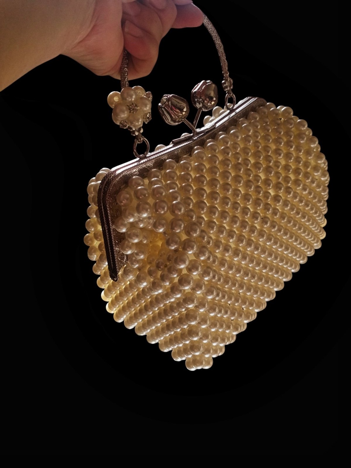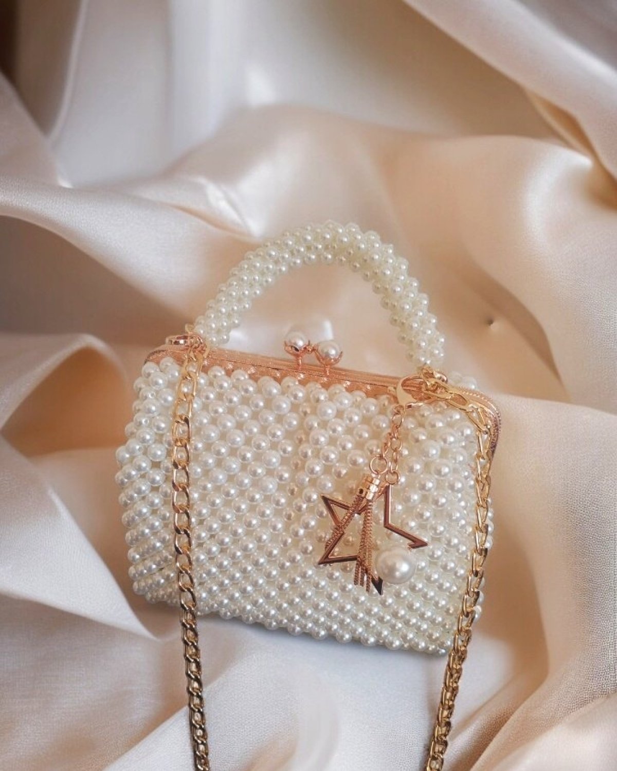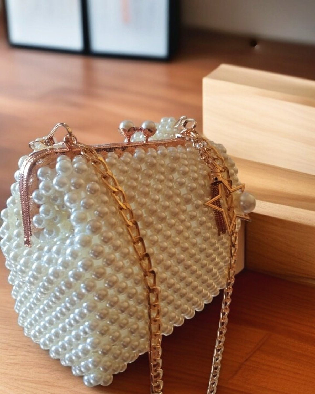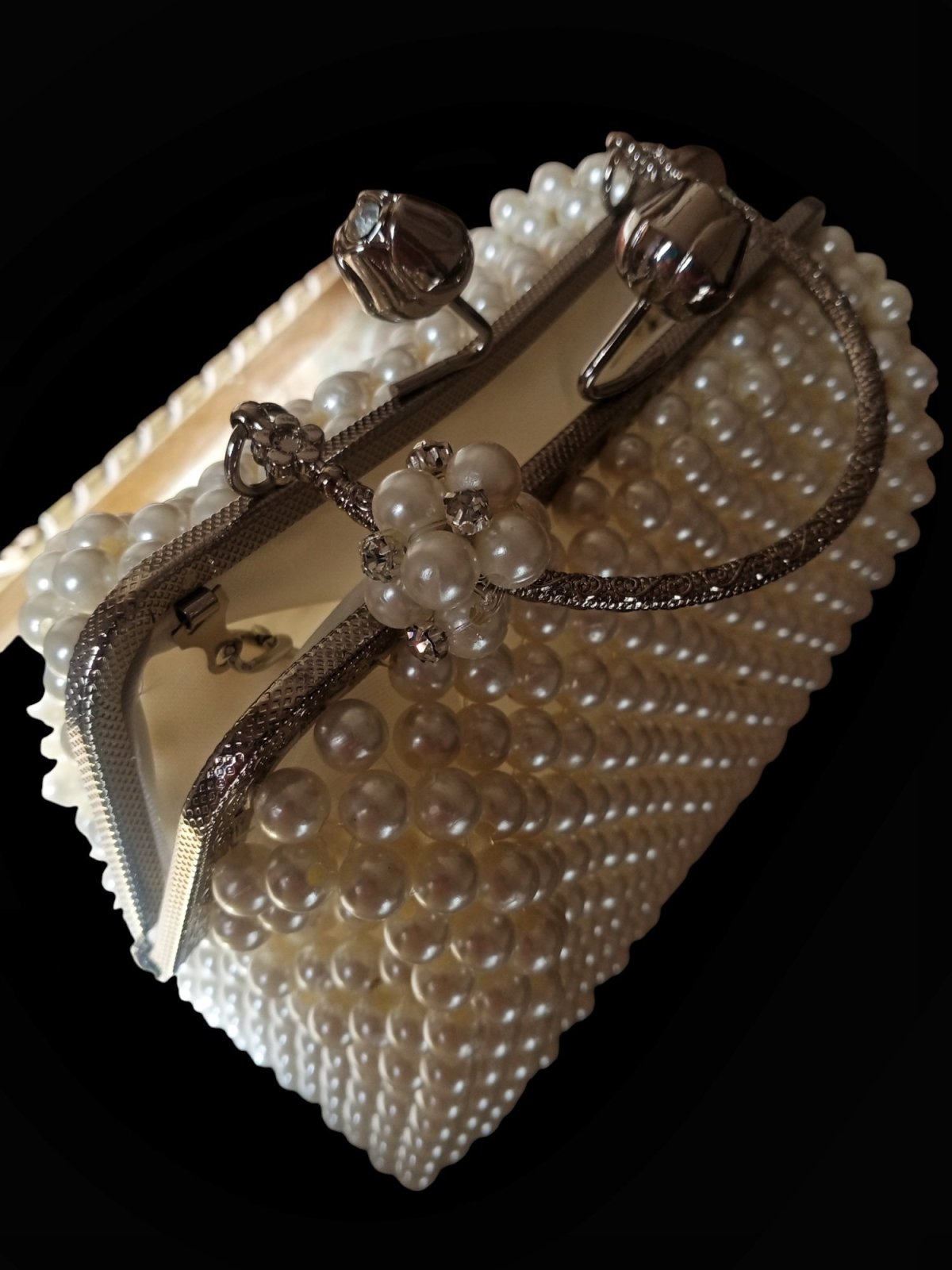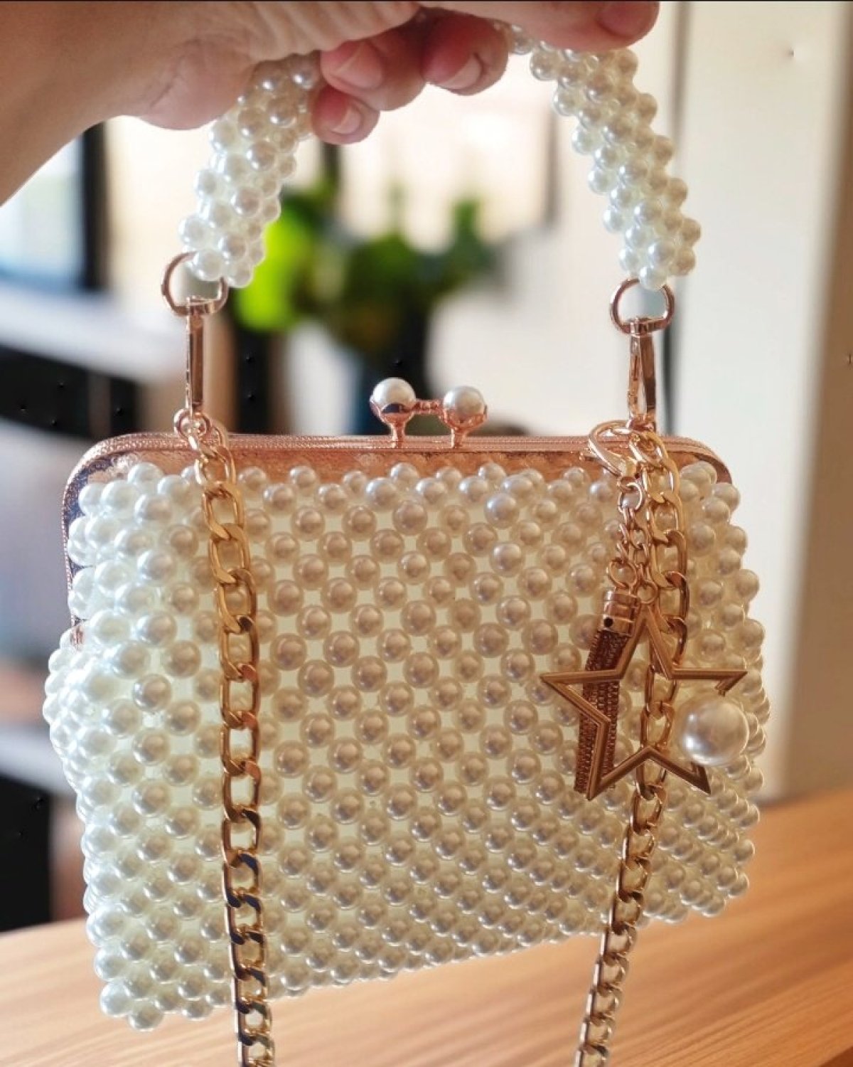 شنطه لولي بفريم معدن صنعت يدويا من حبات اللؤلؤ ccb المستورد لها بطانه داخليه من الستان ولها دراع كروس سلسله مقاس ٢٠/ ١٤