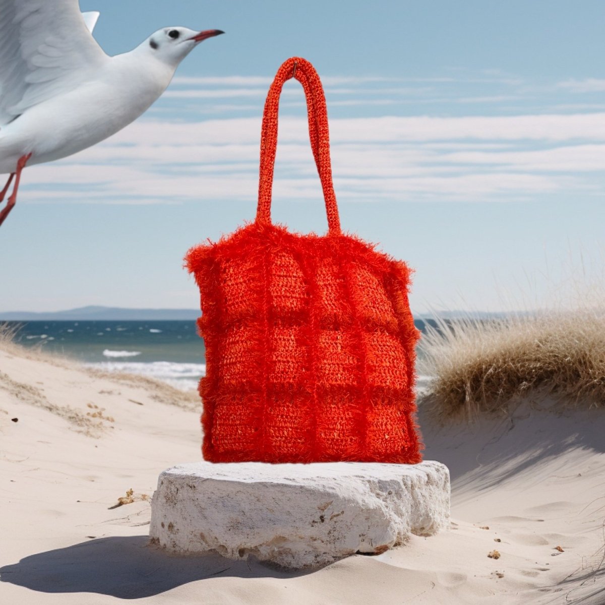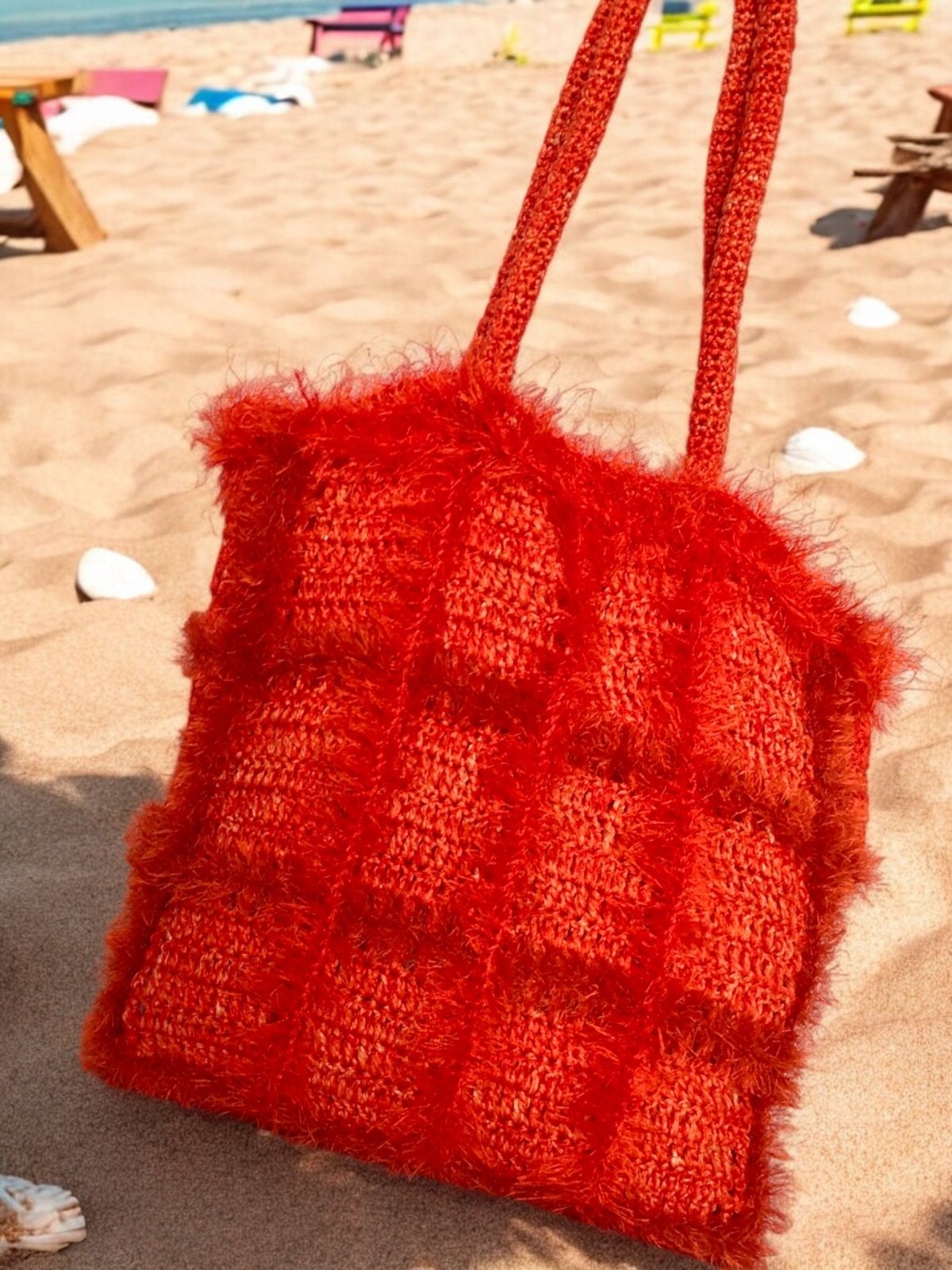حقيبه شاطئ برتقالية زاهية وعصرية، خفيفة الوزن للغاية. مصنوعة من خيط مكرمية رفيع، ومحاطة بخيط برتقالي شعر خيوط.