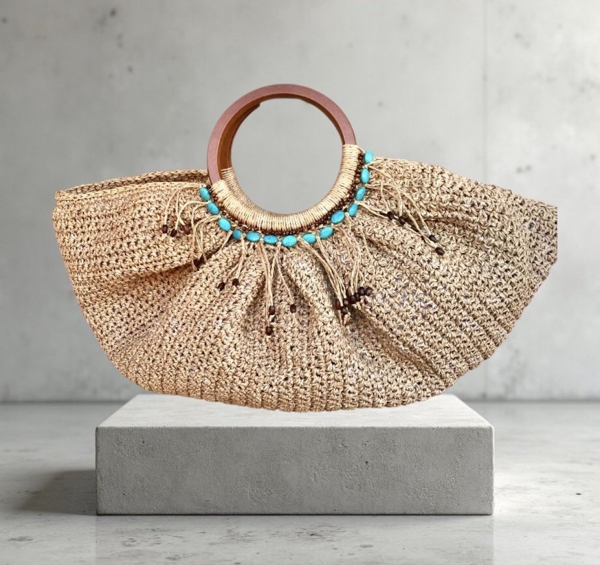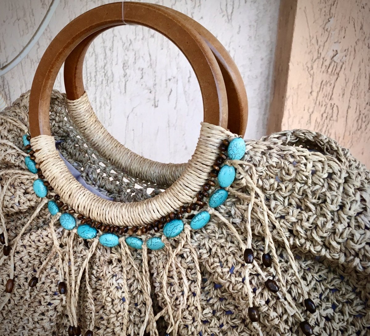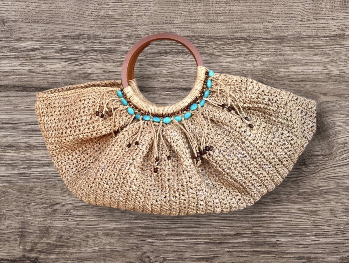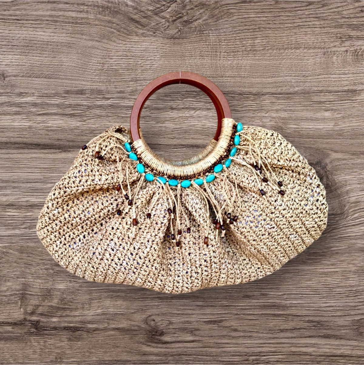 حقيبة كروشيه عصرية مصنوعة يدويًا ومزينة بخرز فيروز أزرق وخرز خشبي بني. الحقيبة مصنوعة من خيط رفاعي بيج طبيعي ومقابض خشبية دائرية. بطانة داخلية بسحاب وجيب.