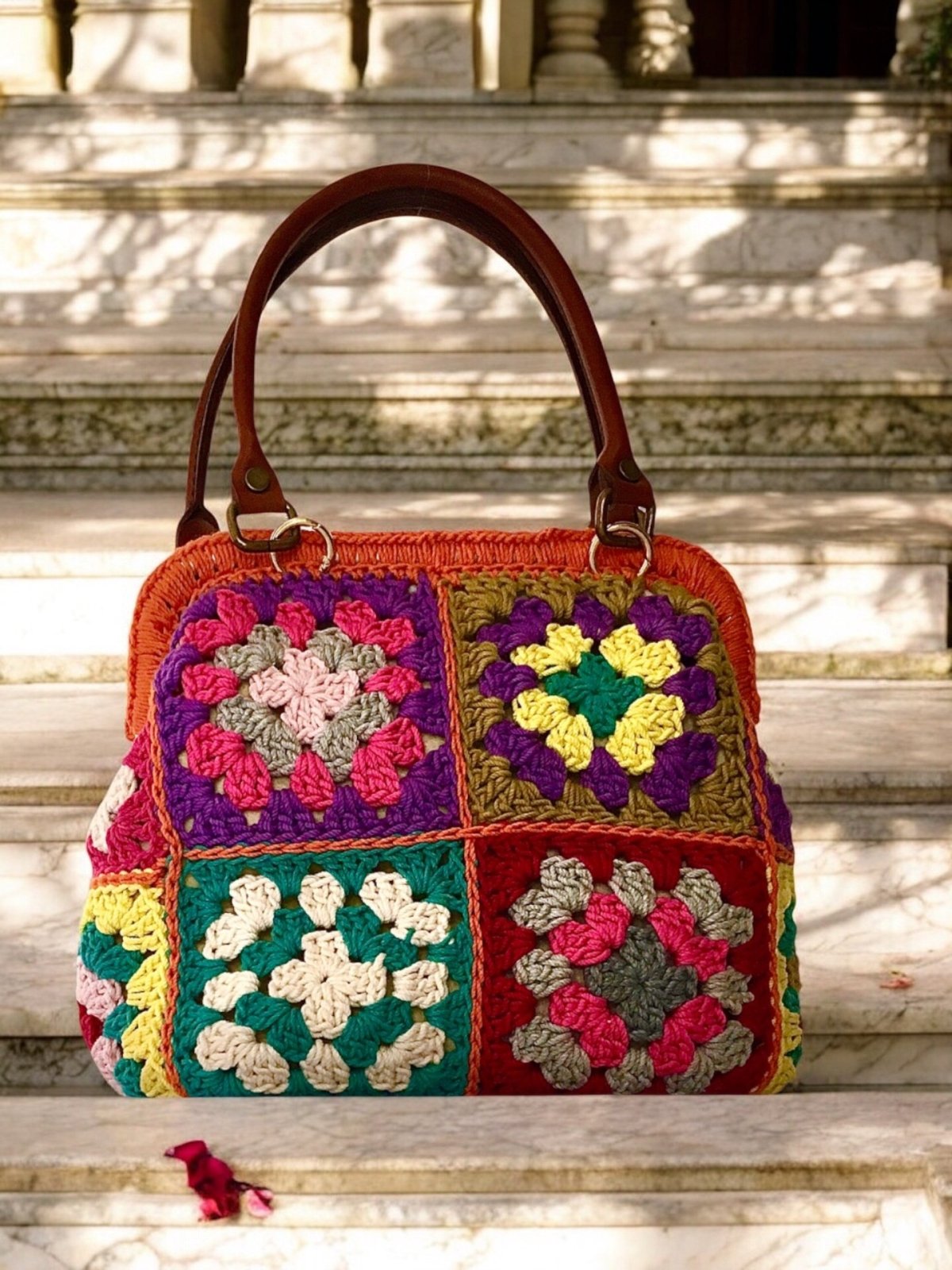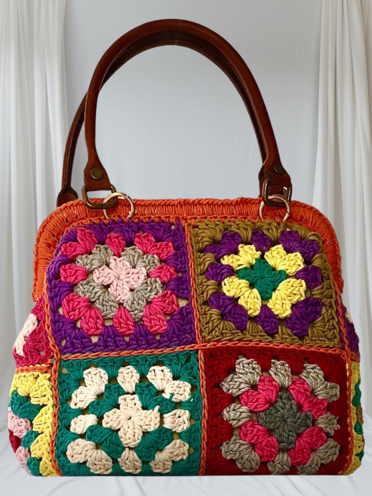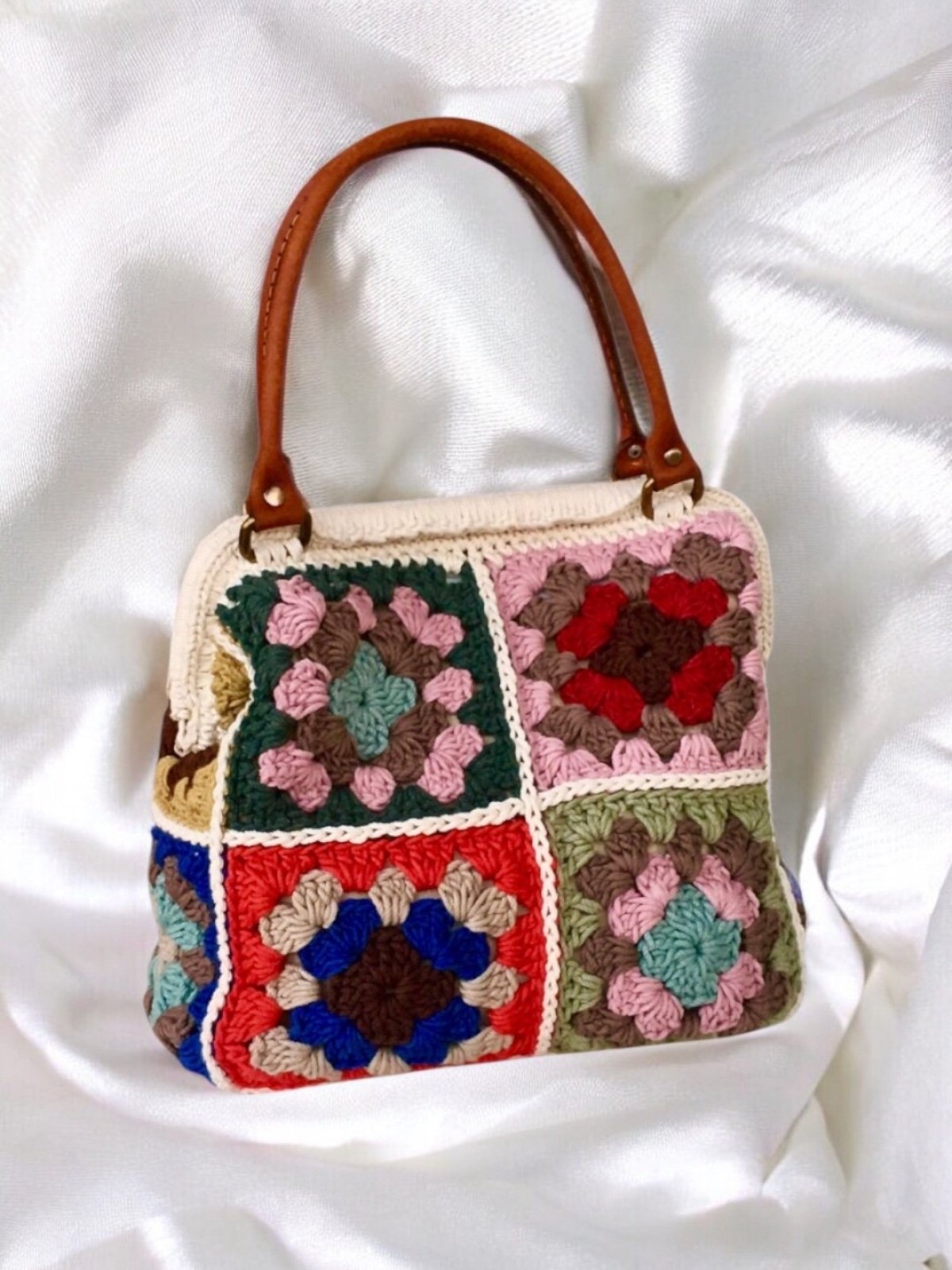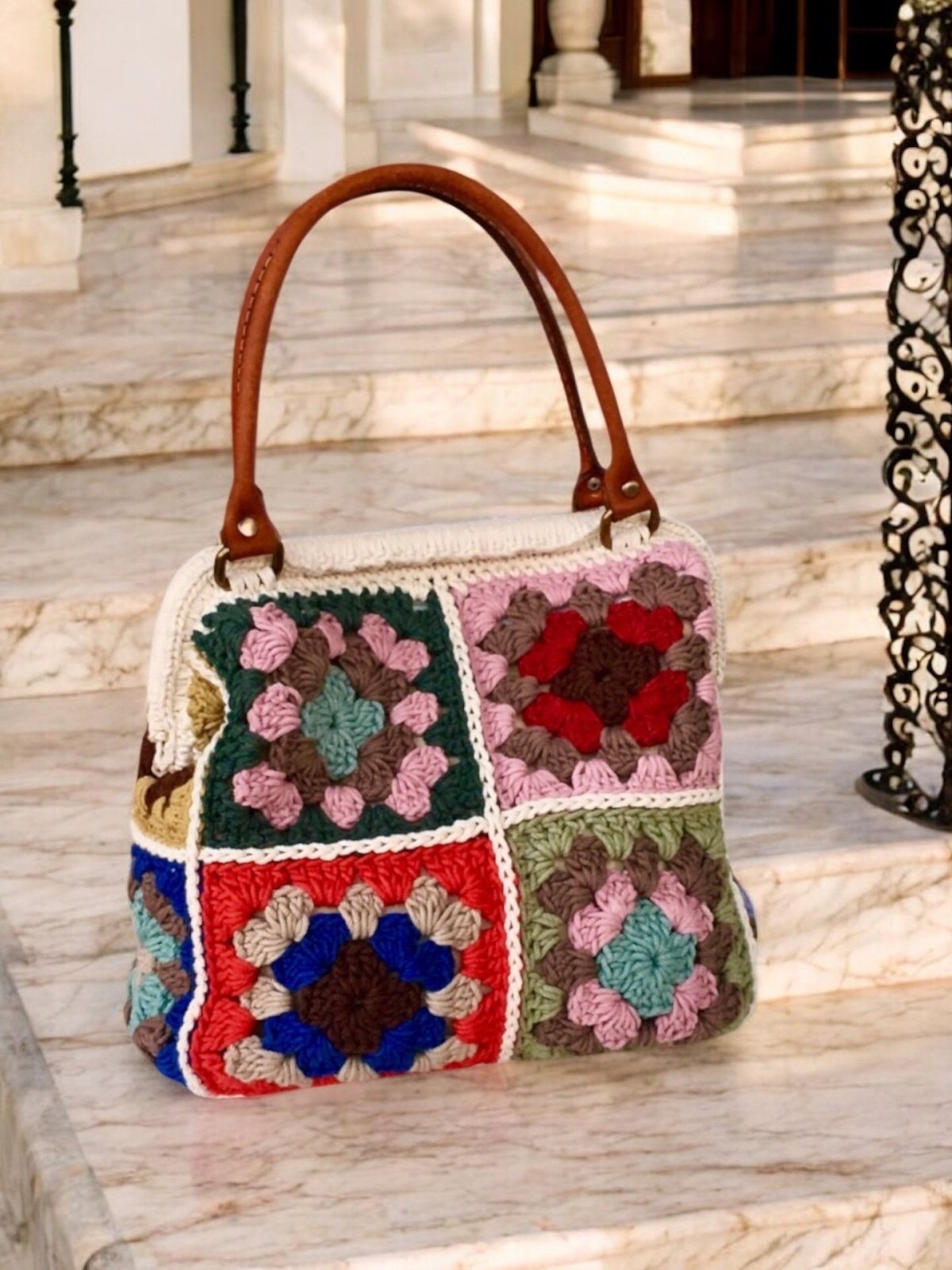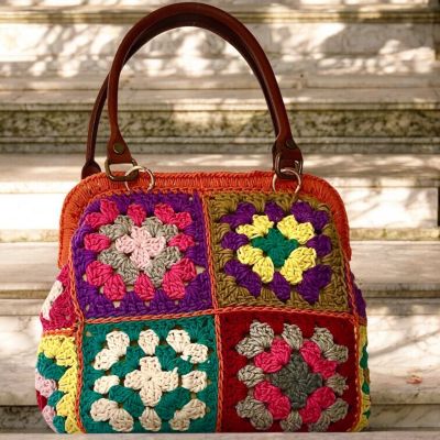 حقيبة كروشيه يدوية الصنع، مصنوعة من أجود أنواع خيوط القطن، مربعات متعددة الألوان، وقاعدة بلون أبيض عاجي. بطانة داخلية بسحاب وجيب. مقابض من الجلد الطبيعي. أبعاد الحقيبة: الارتفاع ٢٦ سم، العرض ٢٥ سم، القاعدة ١٣ سم.