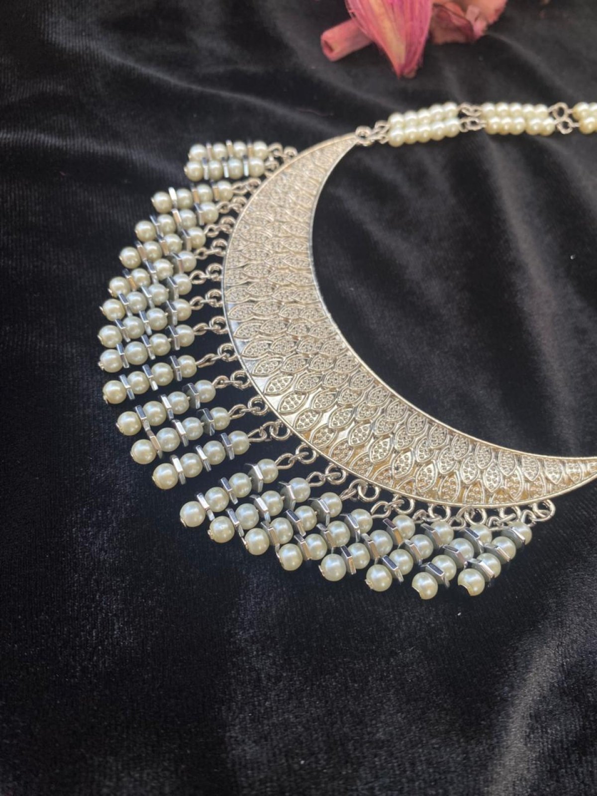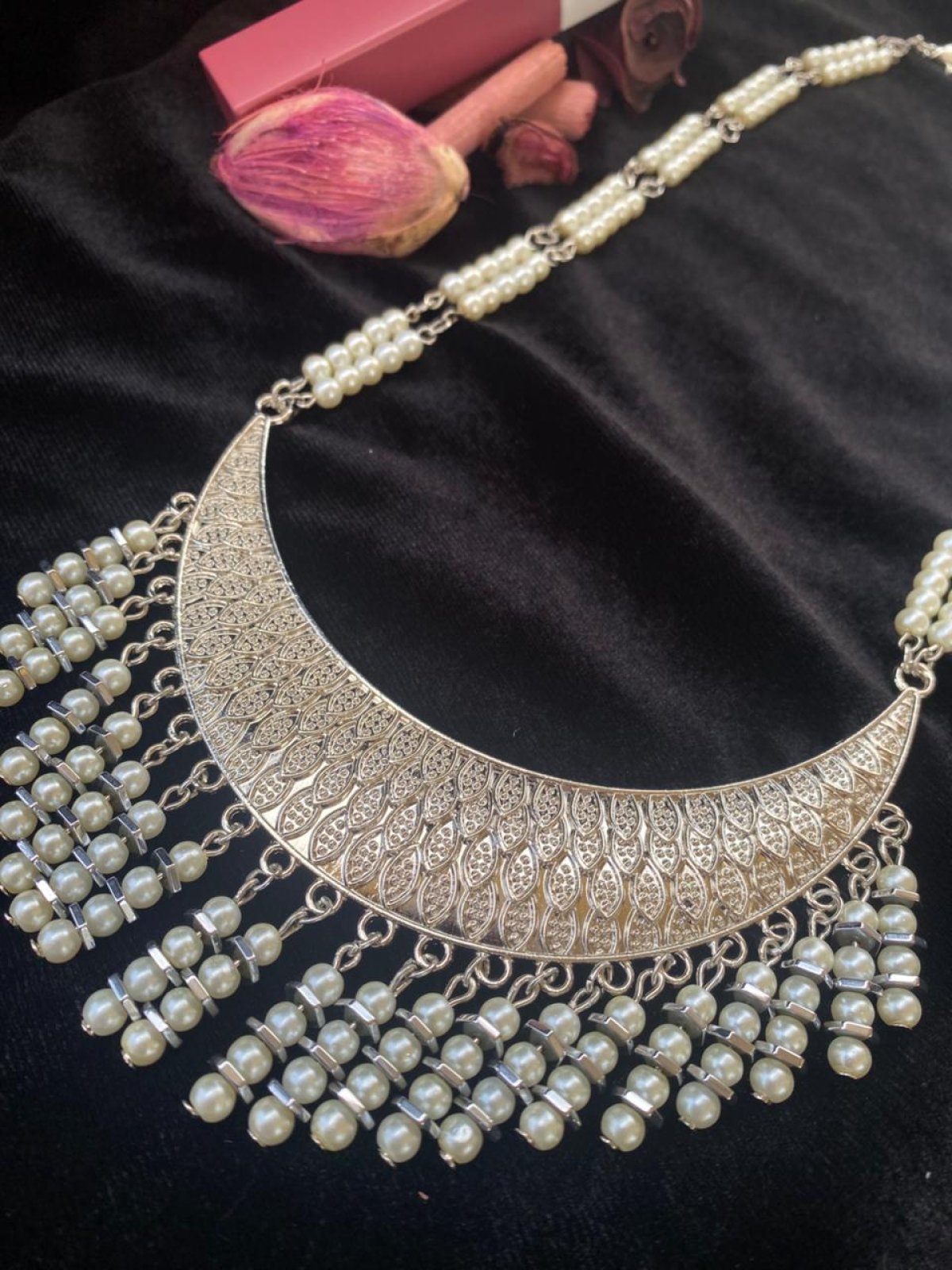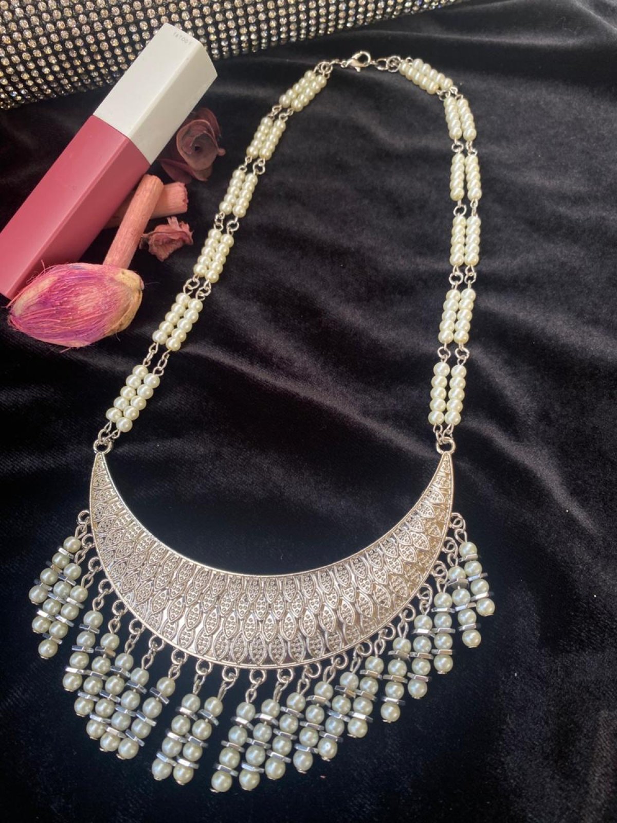 عقد مصنوع من طوق معدني مطلي فضة و اللولي و فواصل هيماتيت فضية