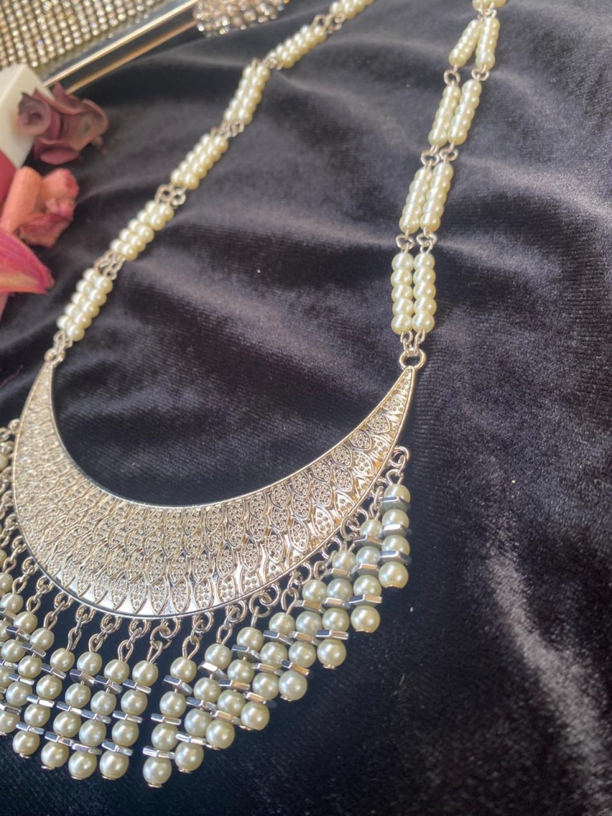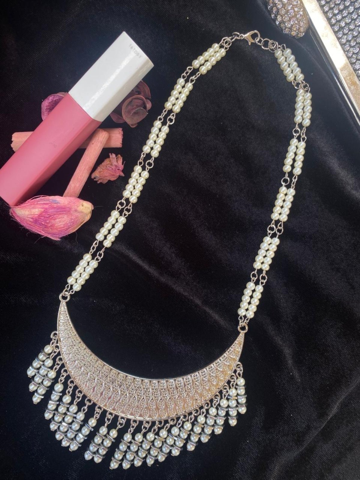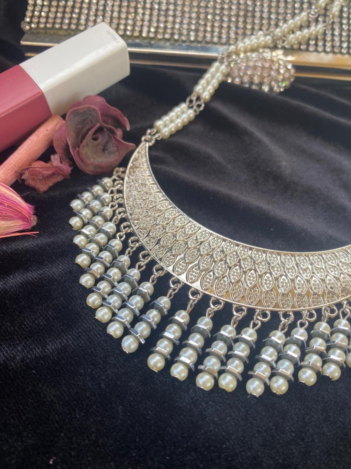 عقد مصنوع من طوق معدني مطلي فضة و اللولي و فواصل هيماتيت فضية