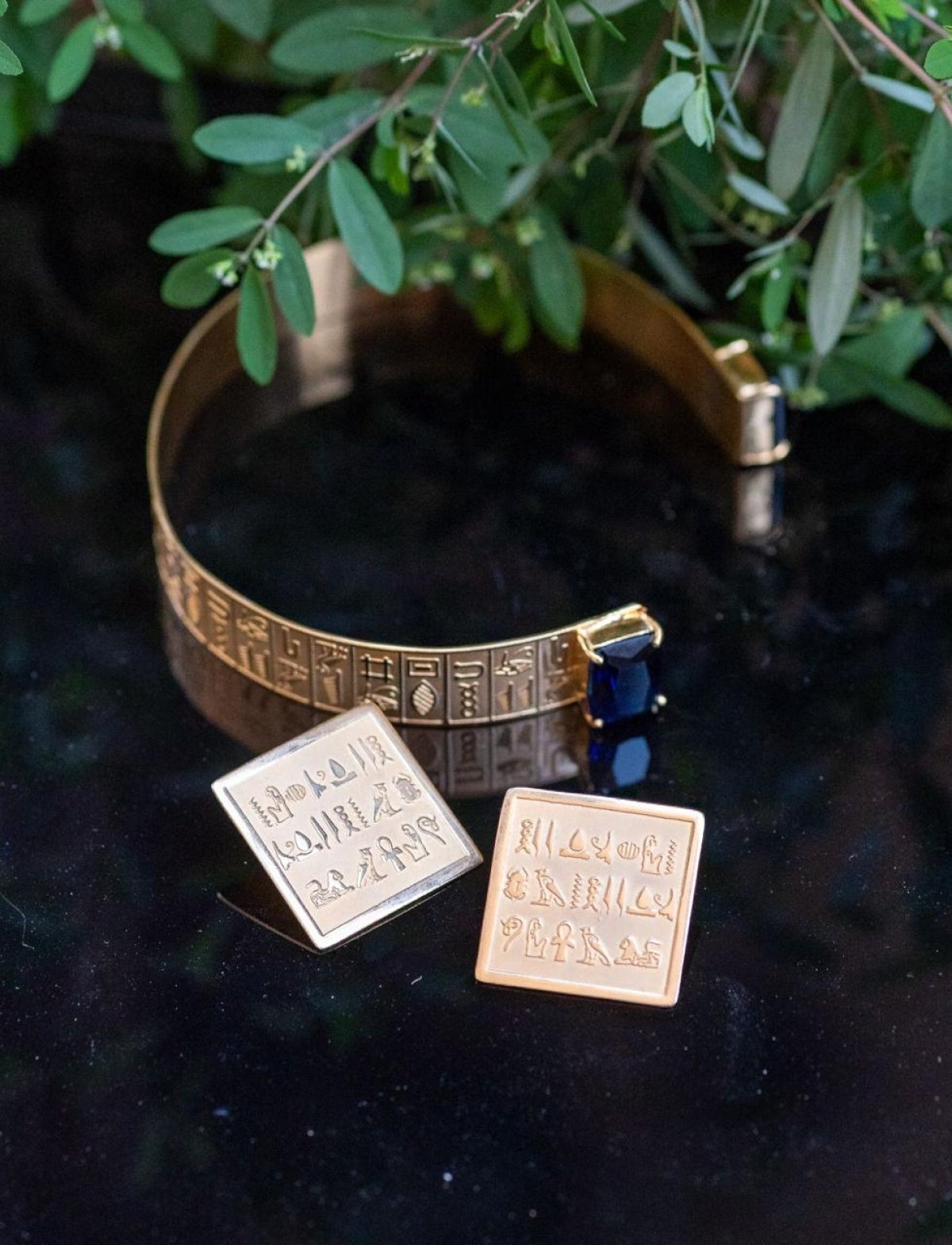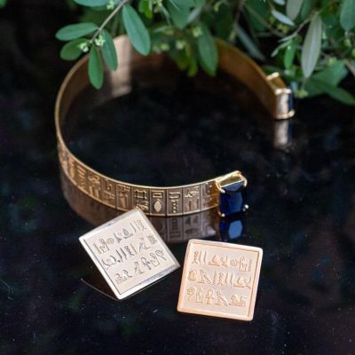 A 21-karat plated brass choker with a raised pharaonic inscription and blue agate stones for EGP 1,200. A 21-karat plated brass earring with raised pharaonic inscriptions for EGP 900.