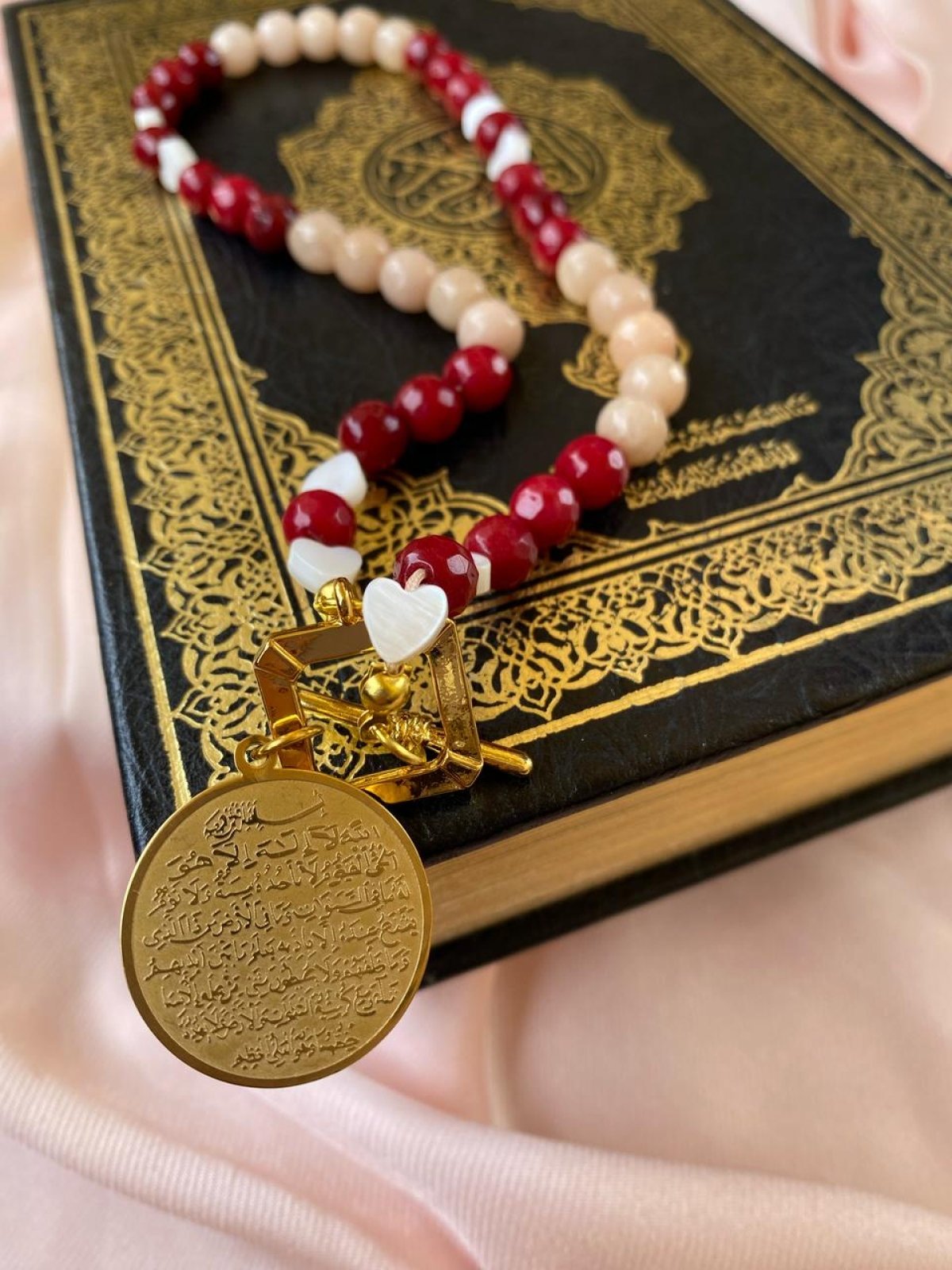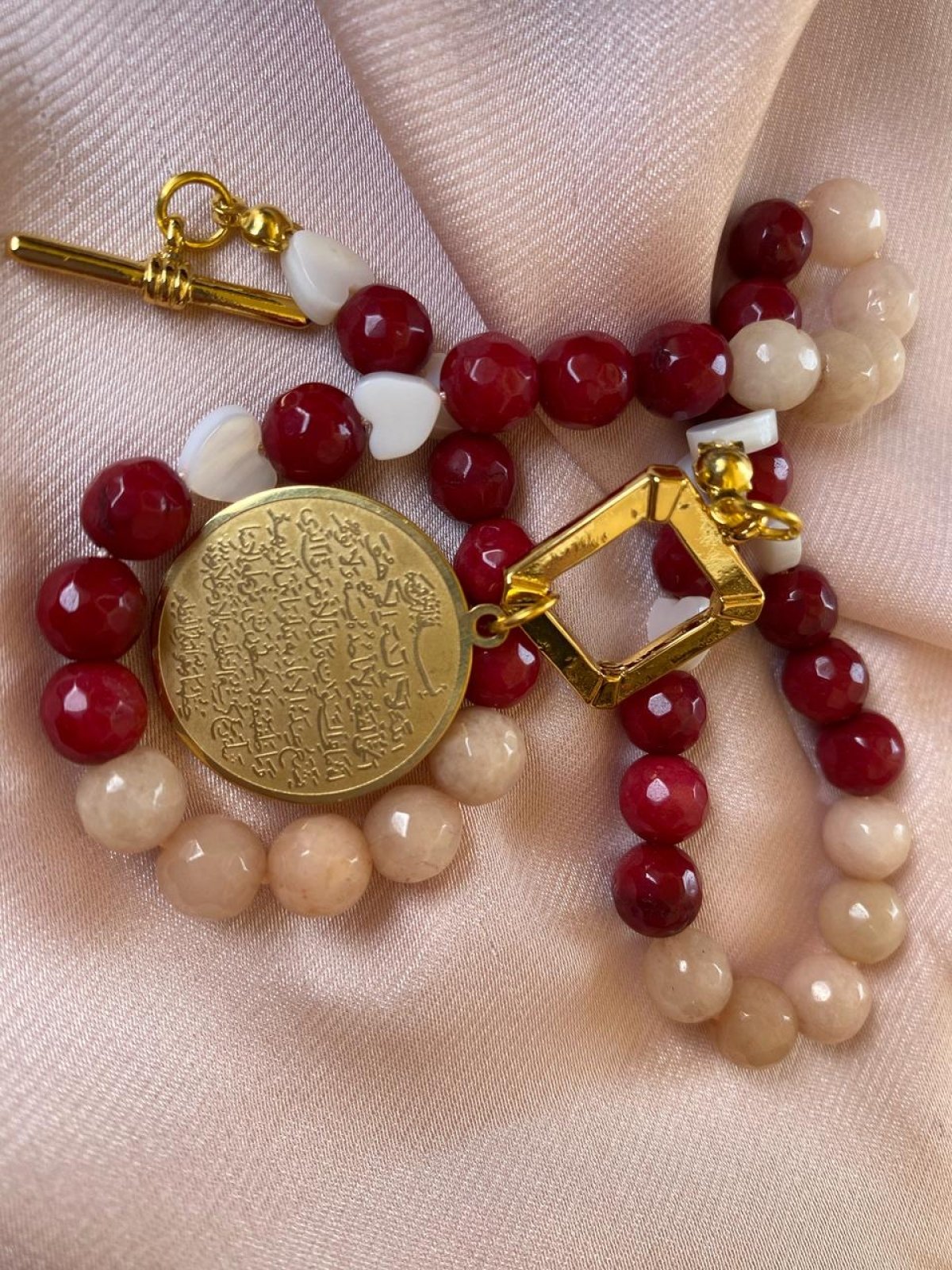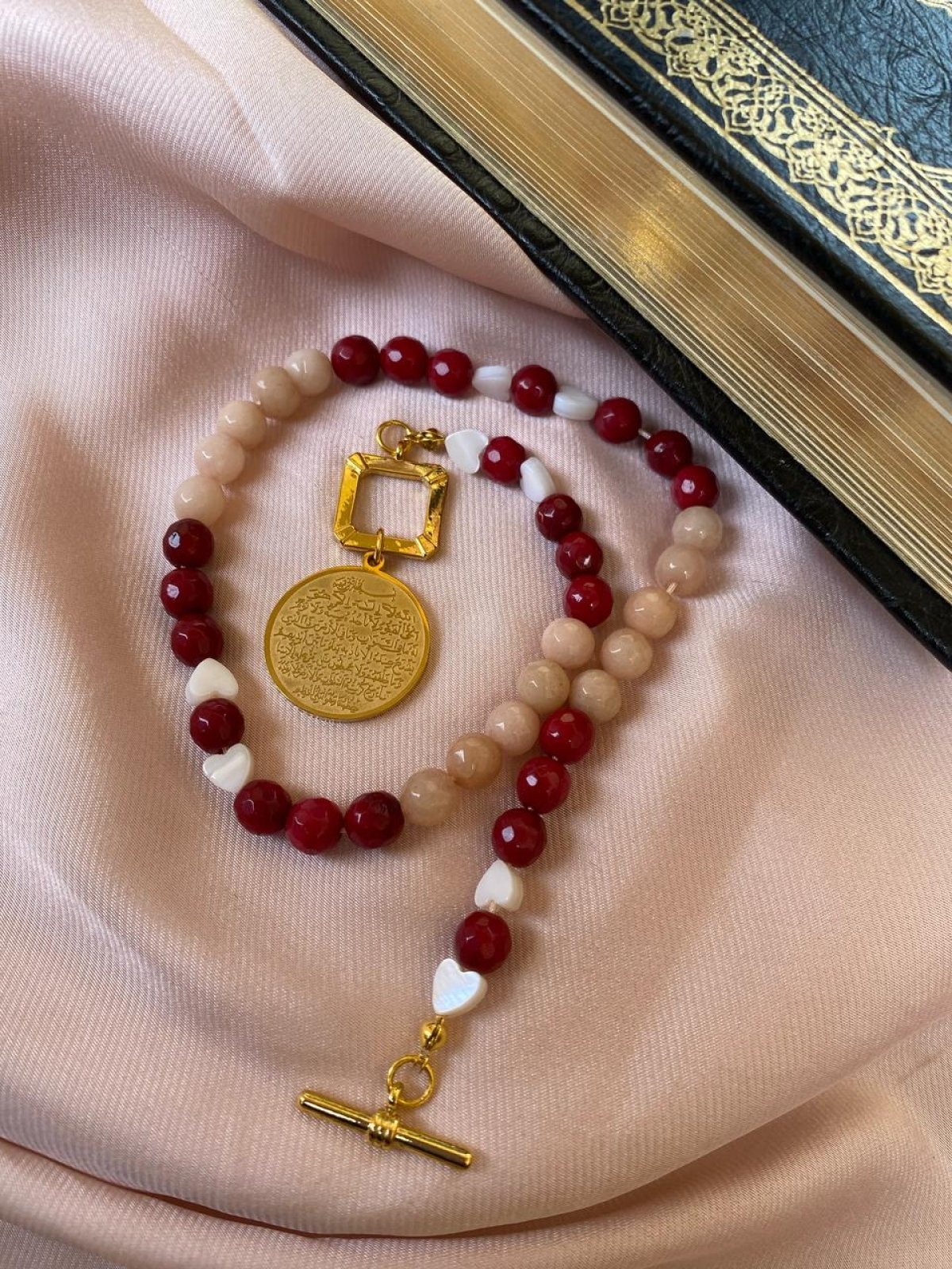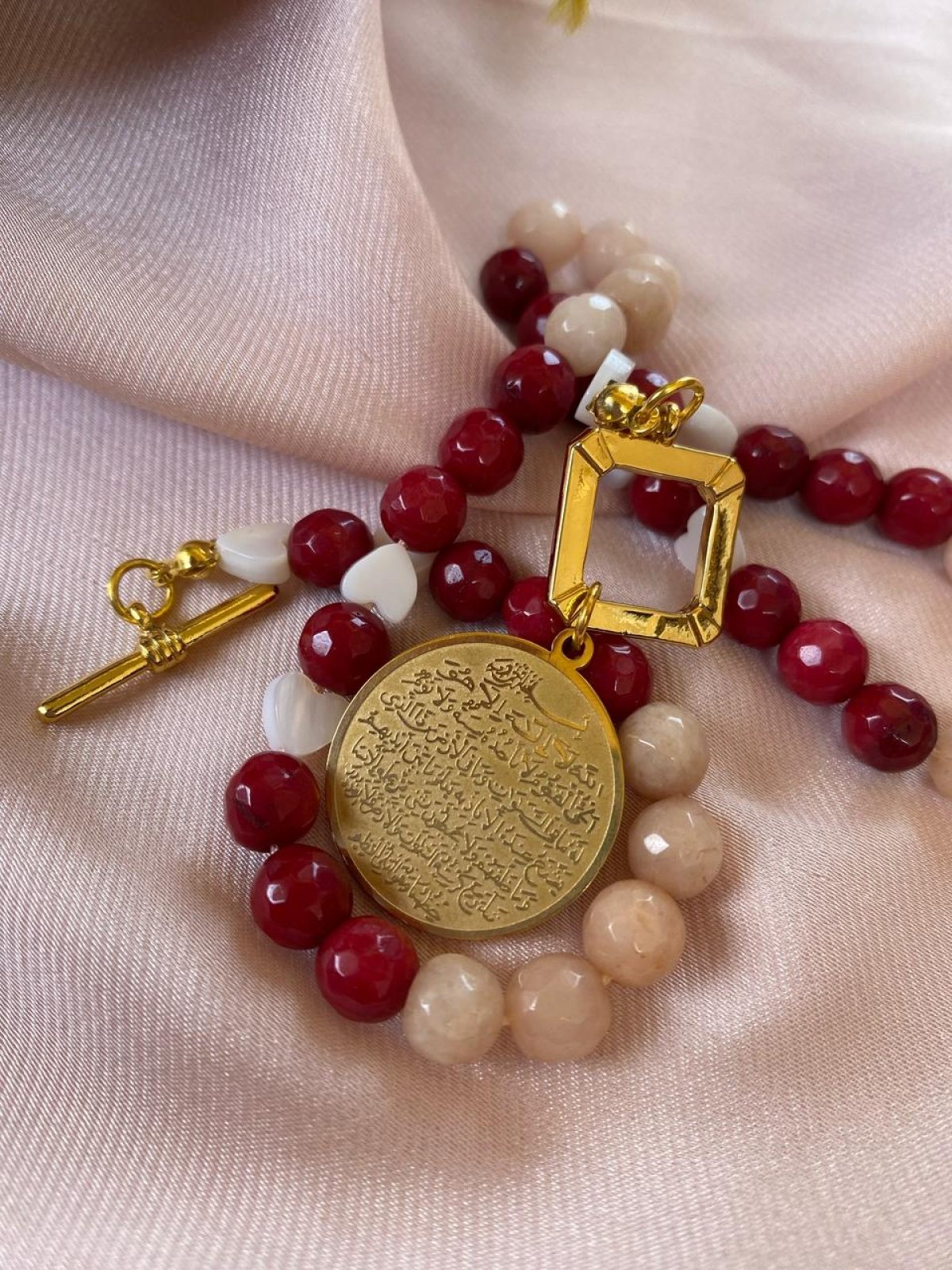 سبحة مصنوعة من حجر العقيق الطبيعي مقاس ٨ بالونين البيج و النبيتي و فواصل من الصدف علي شكل قلب و دلاية استانليس مطلية ذهب مكتوب عليها اية المرسي و قفل من الذهب الصيني