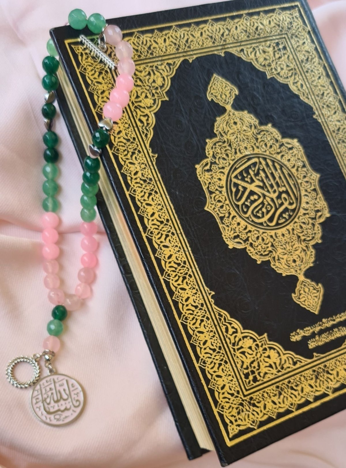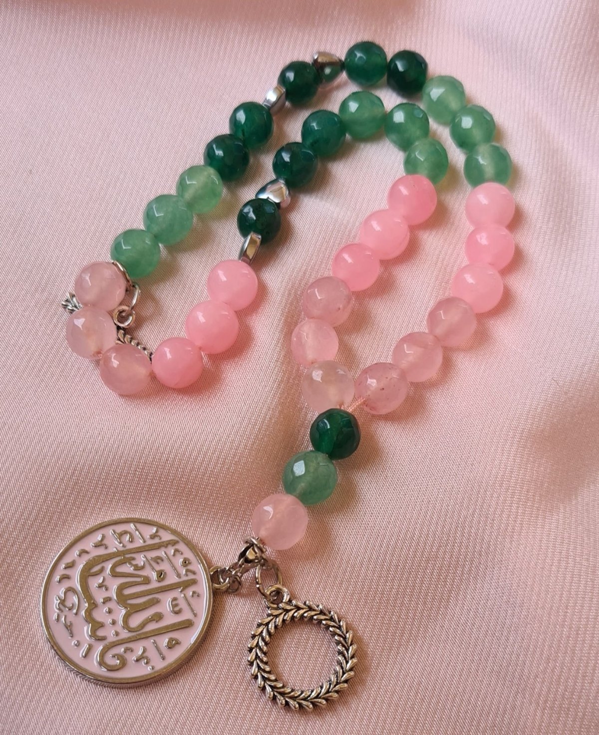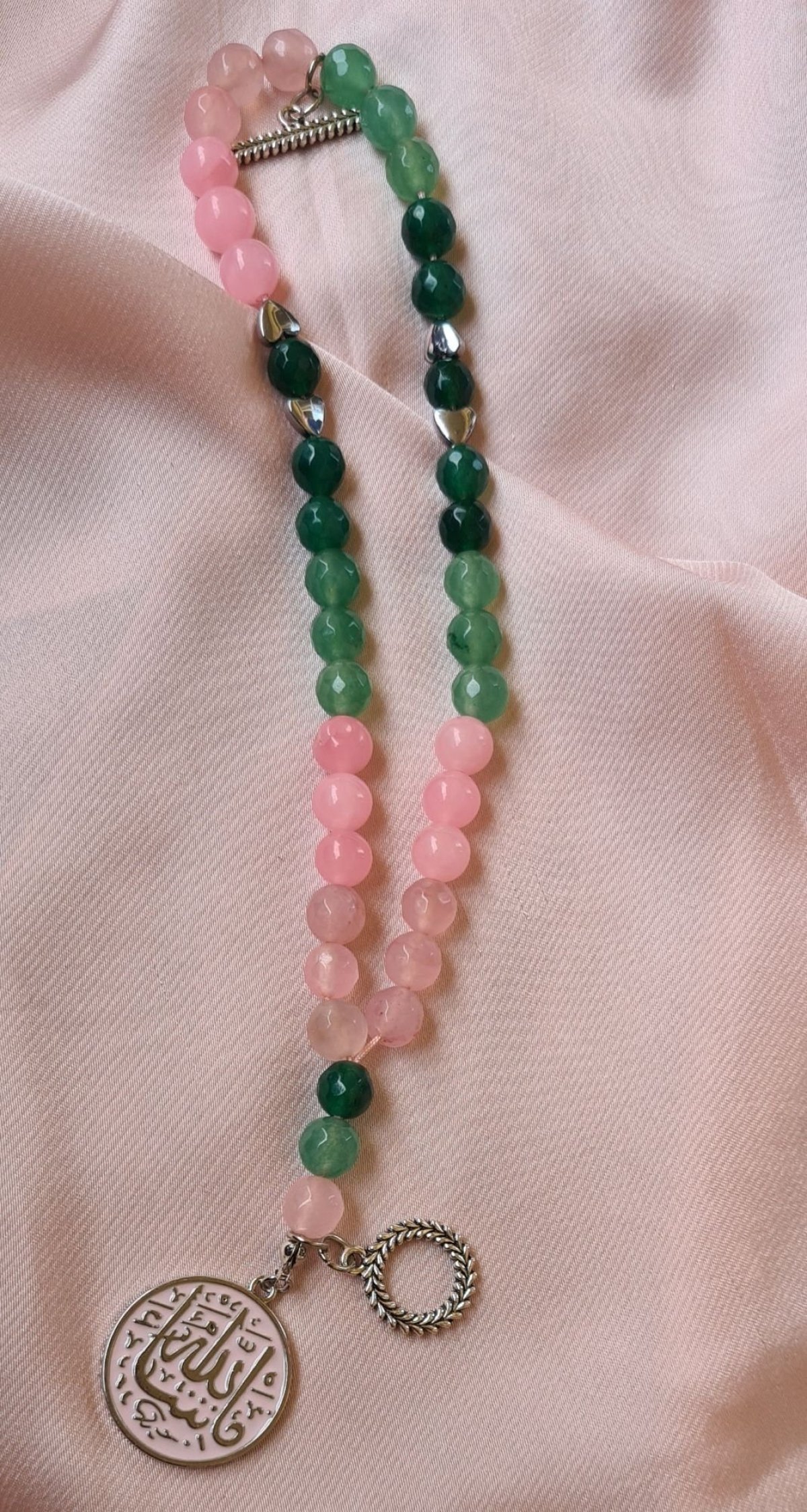 سبحة مصنوعة من حجر العقيق و الروز كواراتز و الافنتورين بدرجات البينك و الاخضر و فواصل من الهيماتيت بشكل قلب فضي اللون و دلاية استانليس باللون البينك مكتوب عليها ما شاء الله و يمكن استخدام السبحة كاسورة يد
