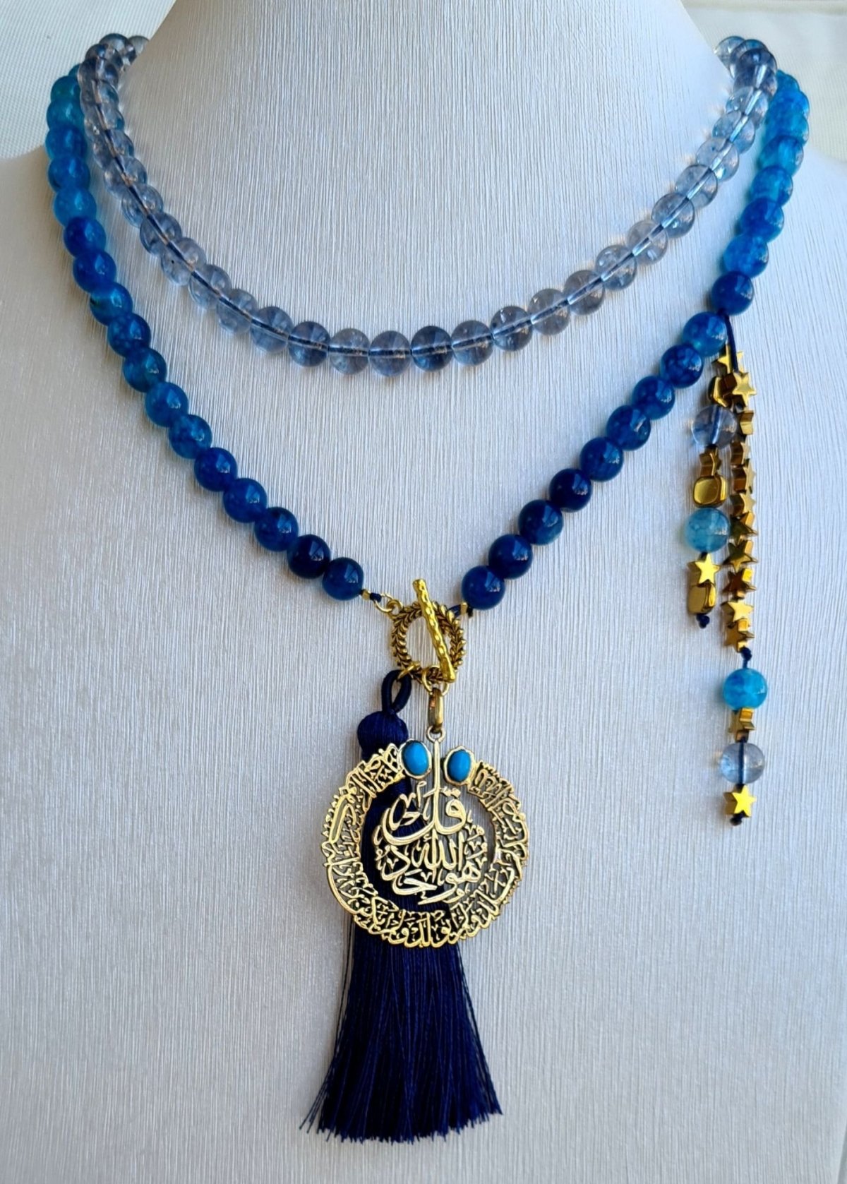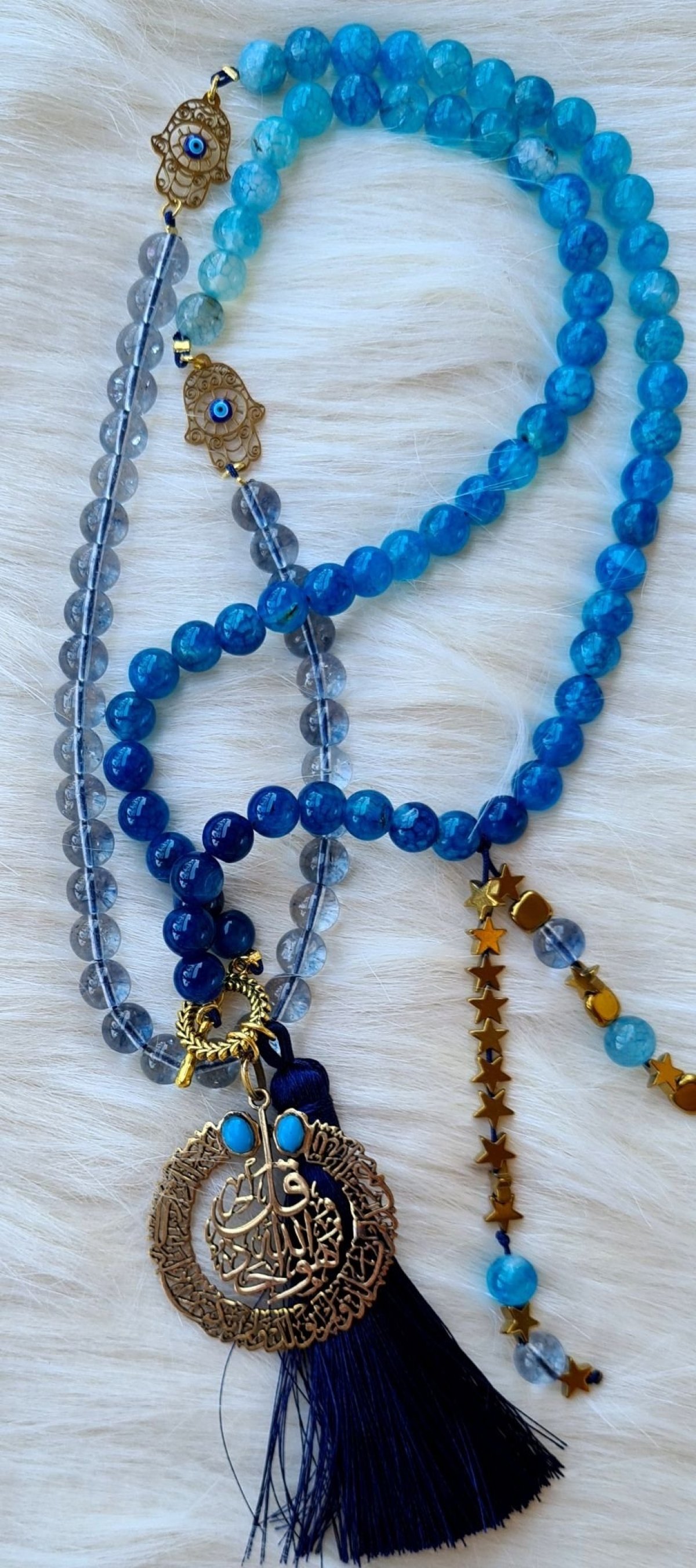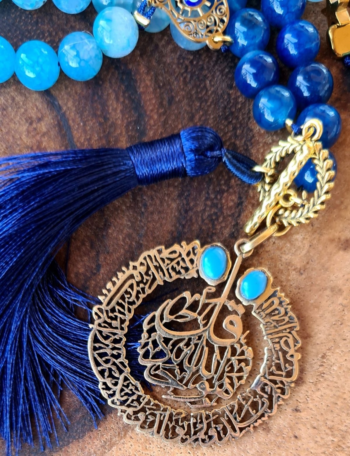 سبحة مصنوعة من عقيق اليمني و افانتورين حجر لابرادورايت طبيعي و فواصل علي شكل كف يد من الذهب الصيني و دلاية من النحاس سورة الاخلاص و قفل ذهبي اللون و عداد مصنوع من الهيماتيت و شرشوبه من الحرير و يمكن لبس السبحة كعقد
