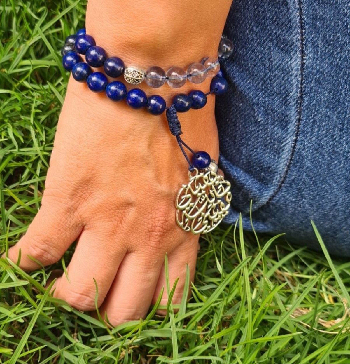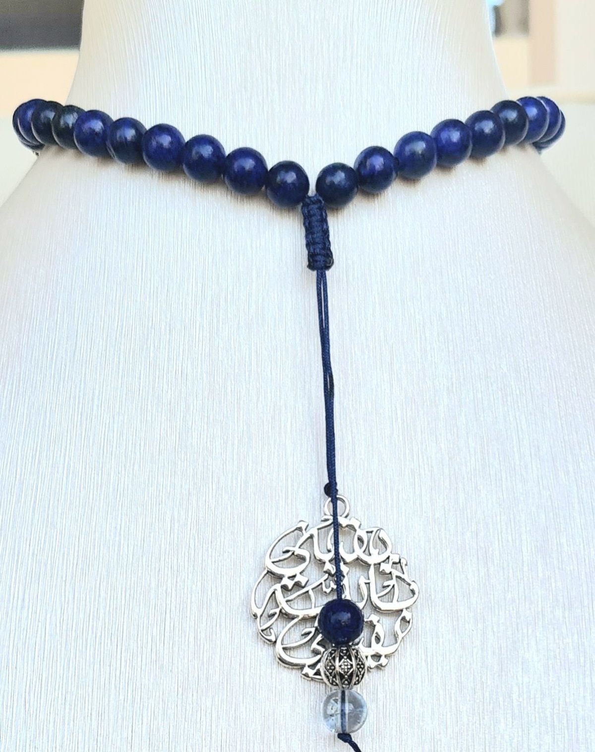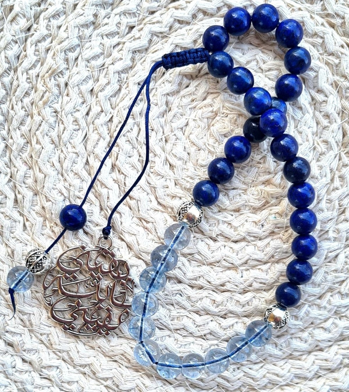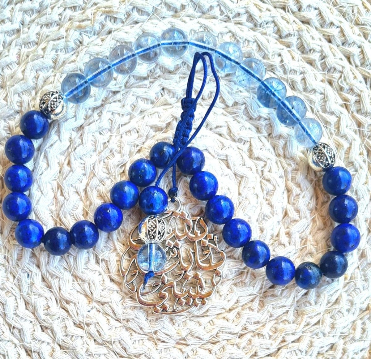 سبحة مصنوعة من حجر اللابيس لازورد الطبيعي و حجر لابرادورايت مكونه من ٣٣ حبة يمكن استخدامها كاسورة يد