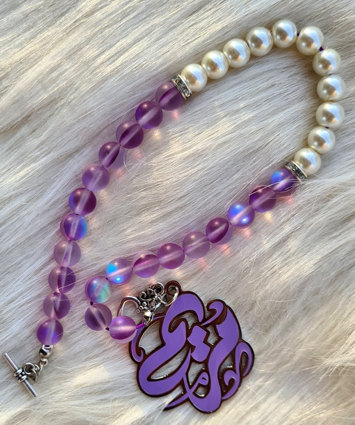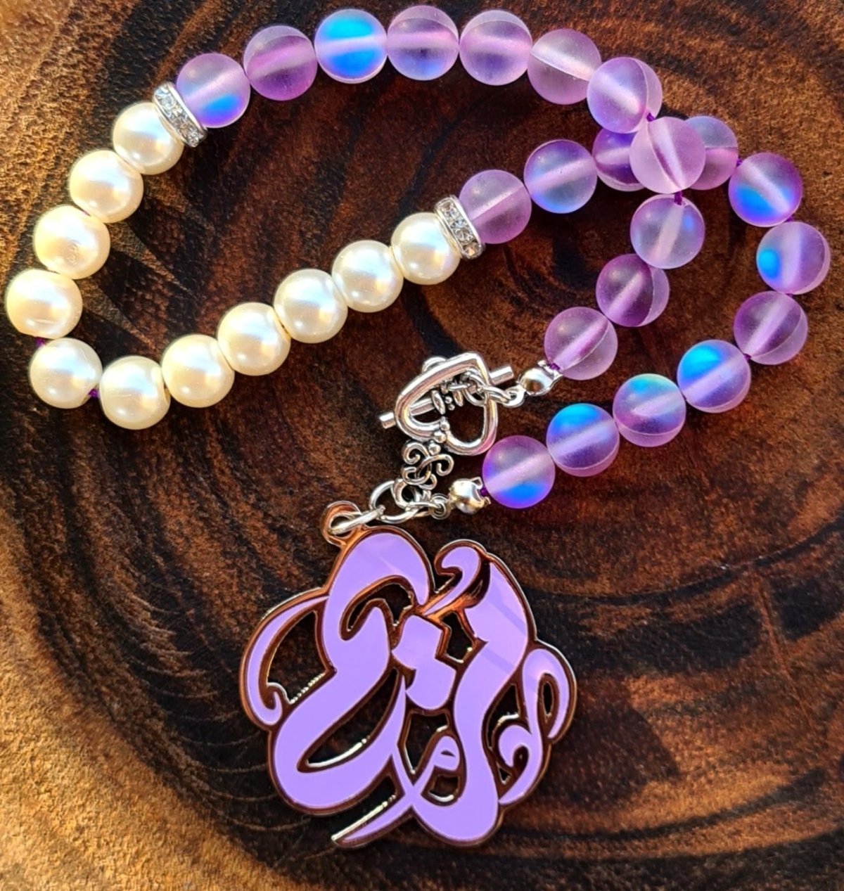 سبحة ٣٣ حبة مصنوعة من الاوبال و اللؤلؤ و فواصل معدنية و بها قفل علي شكل قلب و دلاية باسم مريم( يمكن تغير الاسم و اللون) و يمكن استخدامها كاسورة يد